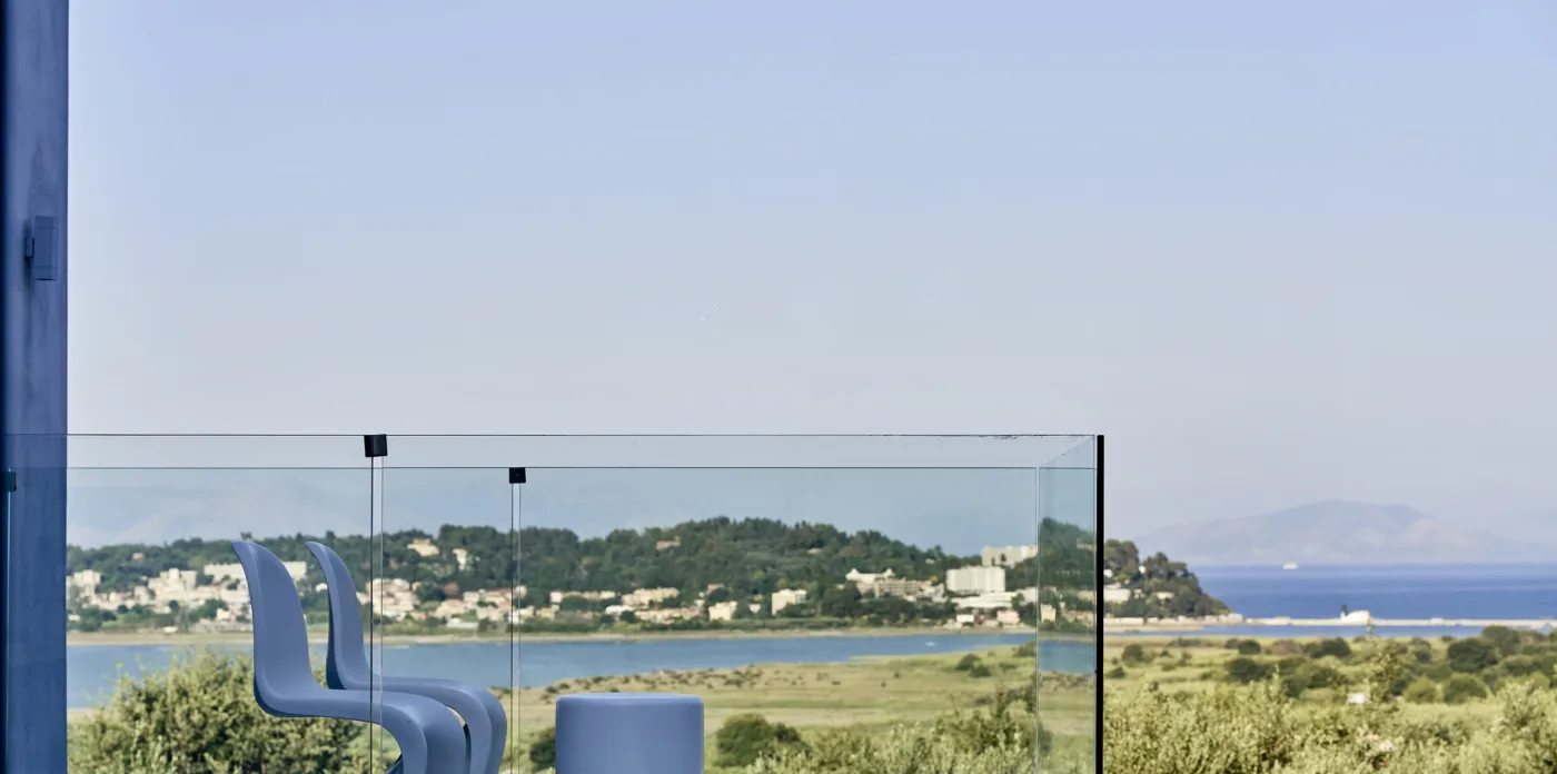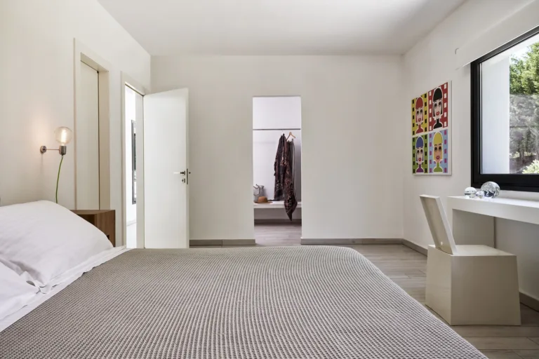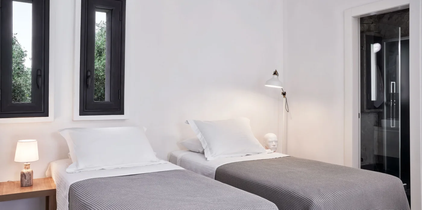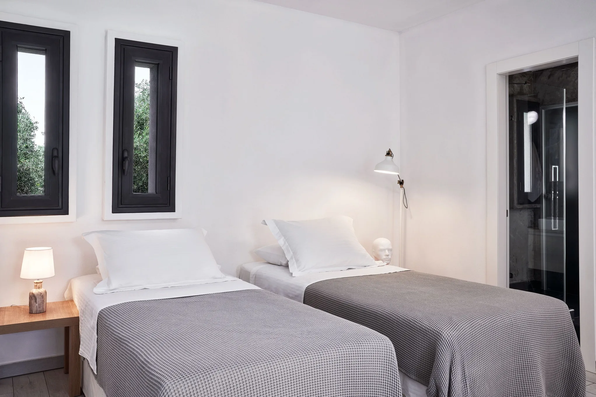 Σκάλες οδηγούν στον πρώτο όροφο, με 2 φωτεινά υπνοδωμάτια και την όμορφη κύρια σουίτα με ιδιωτική βεράντα με θέα στη θάλασσα και θέα στην πισίνα.