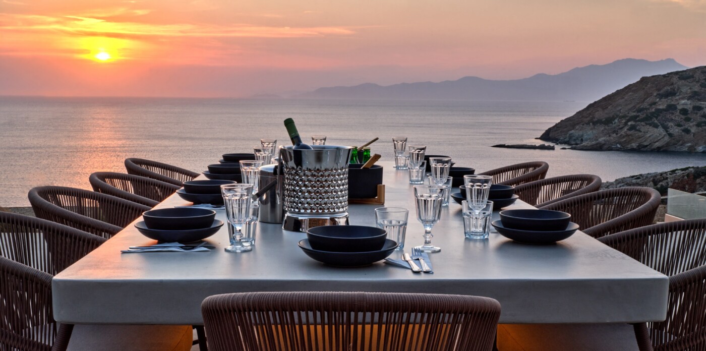 Βγαίνοντας έξω, η κάτω βίλα αποκαλύπτει μια ιδιωτική όαση. Μια πισίνα υπερχείλισης μοιάζει να λιώνει μέσα στο απέραντο γαλάζιο του Αιγαίου, προσκαλώντας σας να κάνετε μια δροσιστική βουτιά ή απλά να αράξετε δίπλα στην πισίνα στα ενσωματωμένα καθίσματα. Μια ειδική τραπεζαρία και ένα μπάρμπεκιου σας προσκαλούν να απολαύσετε τα γεύματά σας στην ύπαιθρο, περιτριγυρισμένοι από την ομορφιά του νησιού. Είτε αναζητάτε χαλάρωση είτε ένα χώρο για διασκέδαση, αυτό το υπαίθριο καταφύγιο προσφέρει το τέλειο σκηνικό.