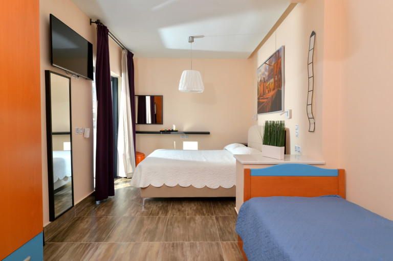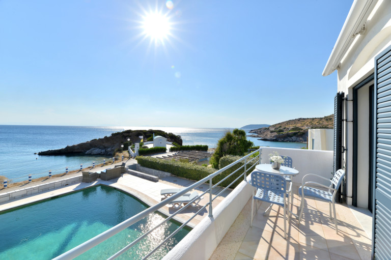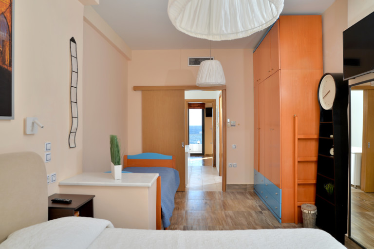 Στον επάνω όροφο υπάρχουν άλλα δύο υπνοδωμάτια, το ένα με βεράντα μπροστά στη θάλασσα και θέα στο Αιγαίο. Το κύριο μπάνιο βρίσκεται επίσης σε αυτόν τον όροφο.