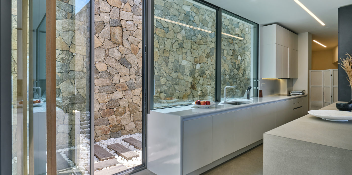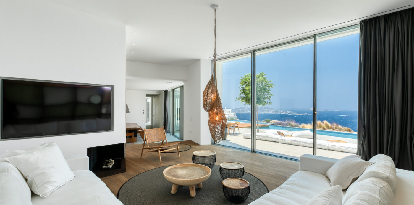 Η ανοιχτή κουζίνα με τους μεγάλους χώρους μαγειρέματος μπορεί να ικανοποιήσει κάθε γαστρονομική επιθυμία, ενώ η αίθουσα κρασιών, ο χώρος του home theater και το γυμναστήριο προσφέρουν μια ολοκληρωμένη εμπειρία. Κάθε στοιχείο έχει σχεδιαστεί για να ενισχύει τη γαλήνη της περιοχής, καθώς και να αντανακλά την ήρεμη κομψότητα του μυκονιάτικου σχεδιασμού.