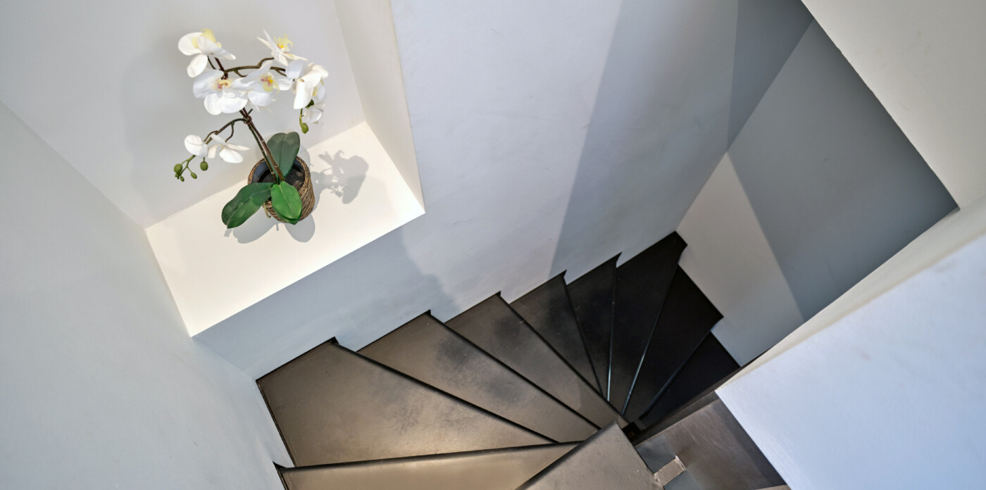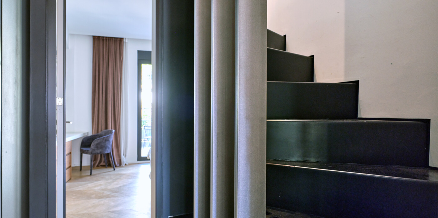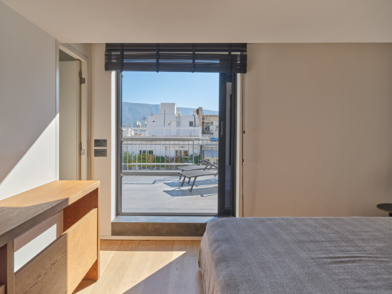 Μια σκάλα οδηγεί στο επάνω επίπεδο, όπου περιμένει ένα ακόμη υπνοδωμάτιο με ιδιωτικό μπάνιο. Αυτό το υπνοδωμάτιο ανοίγει σε ένα μεγάλο ιδιωτικό μπαλκόνι με εκτεταμένη θέα στην πόλη.