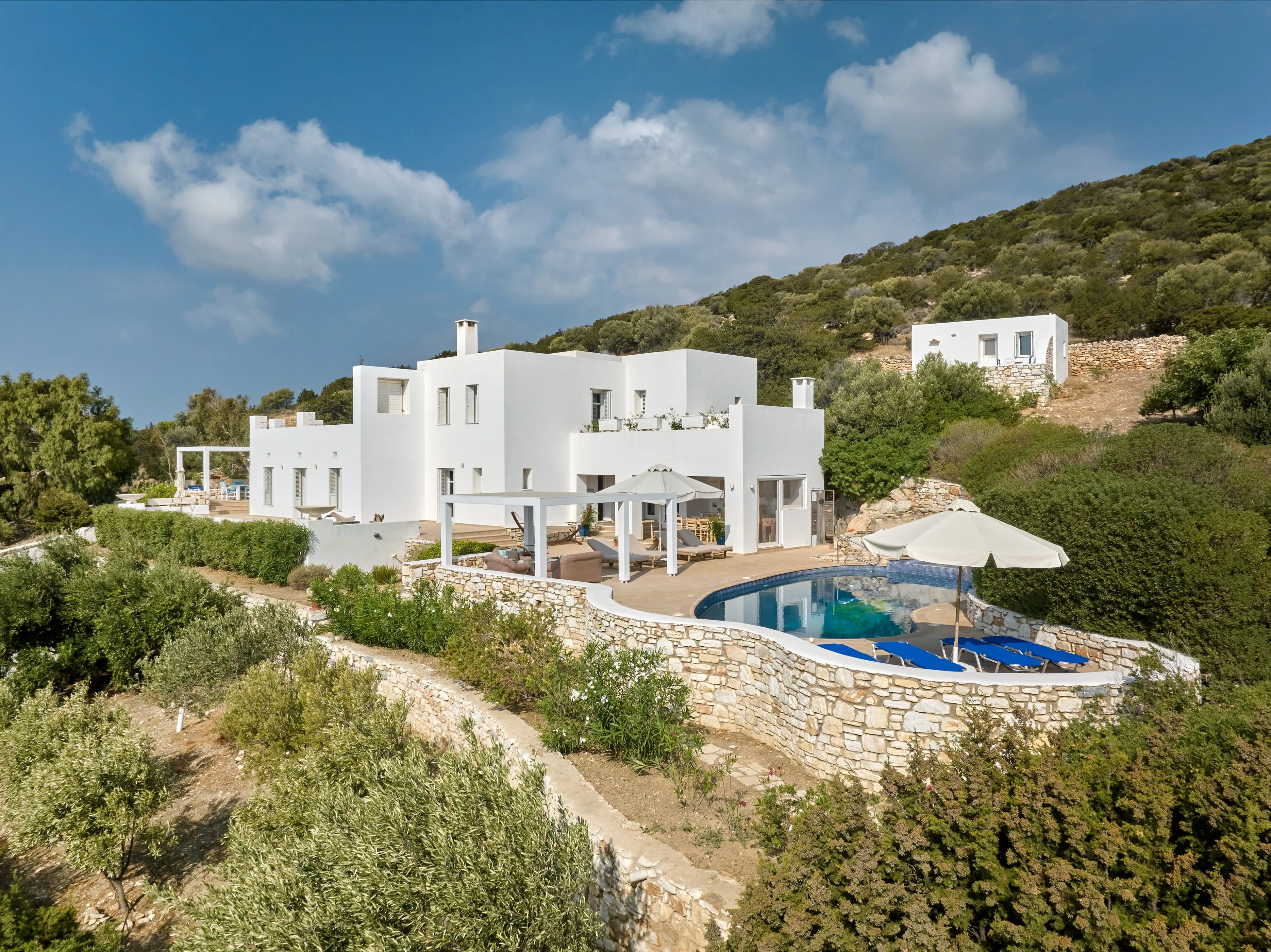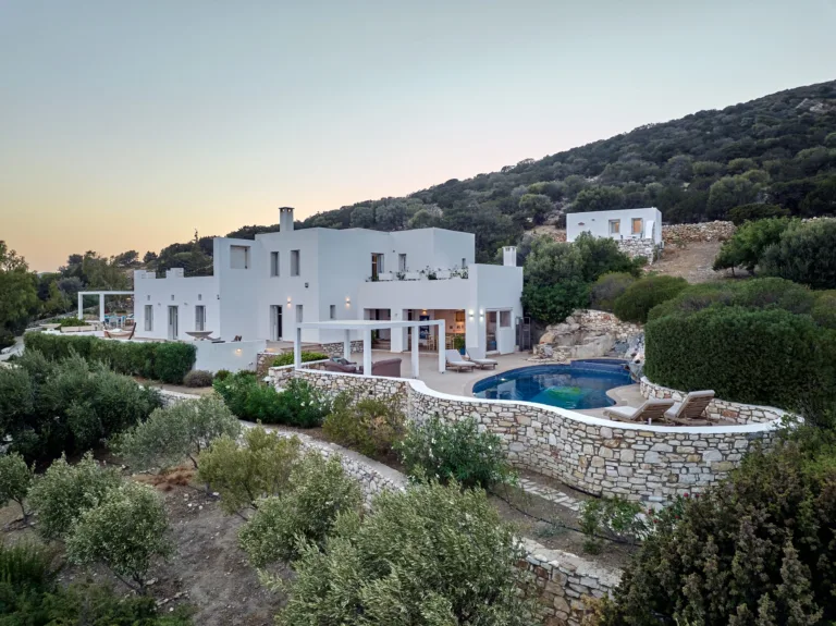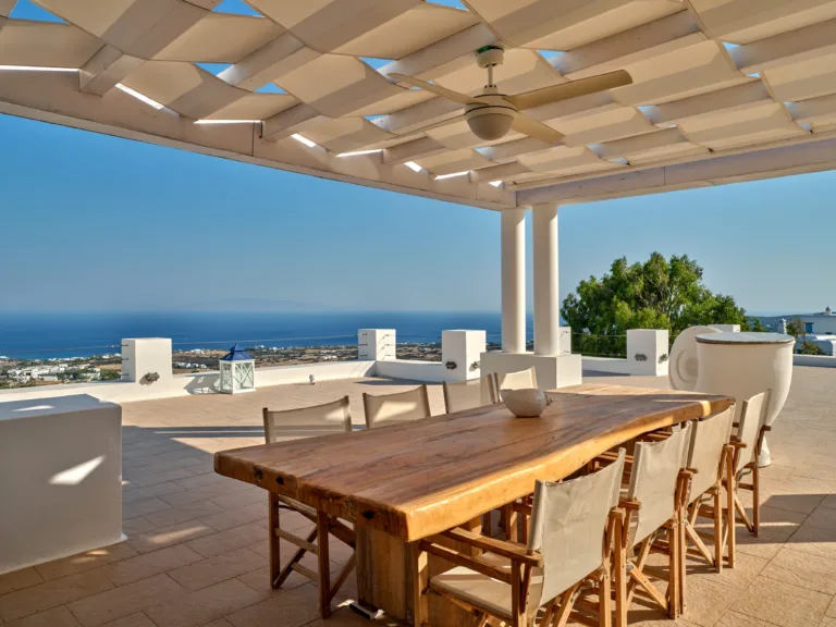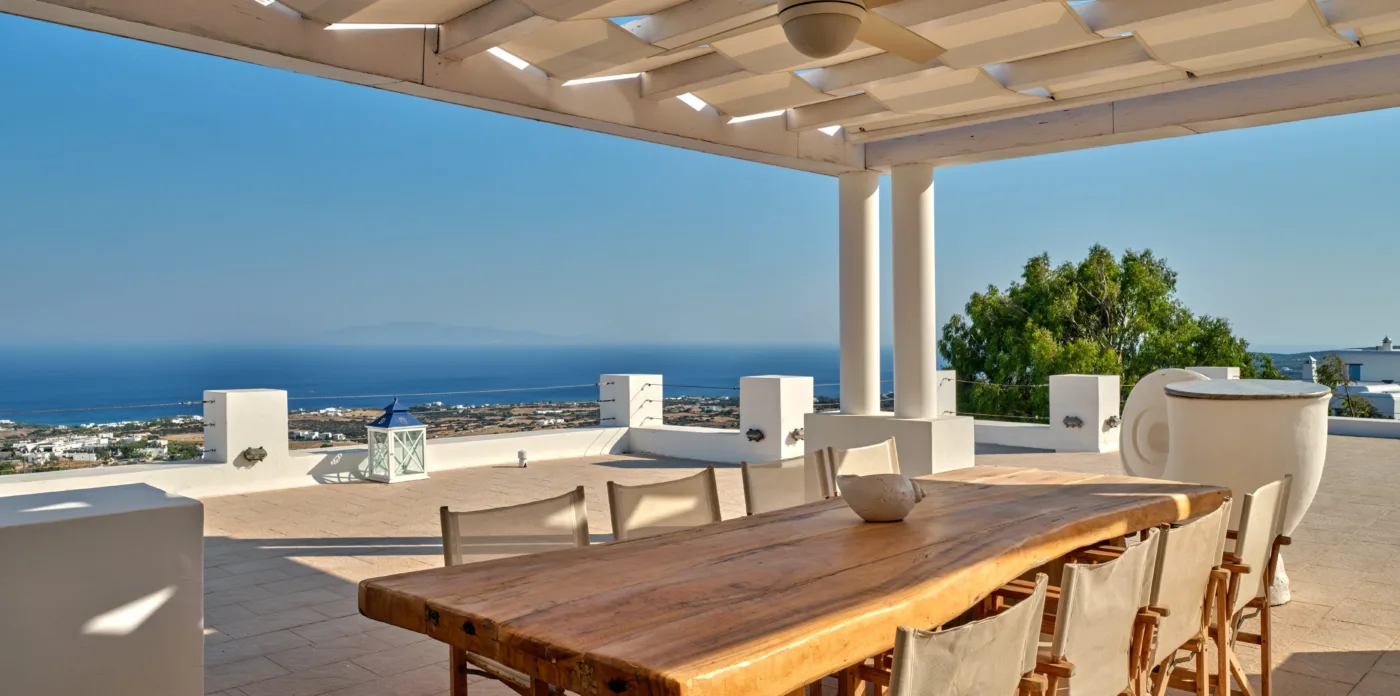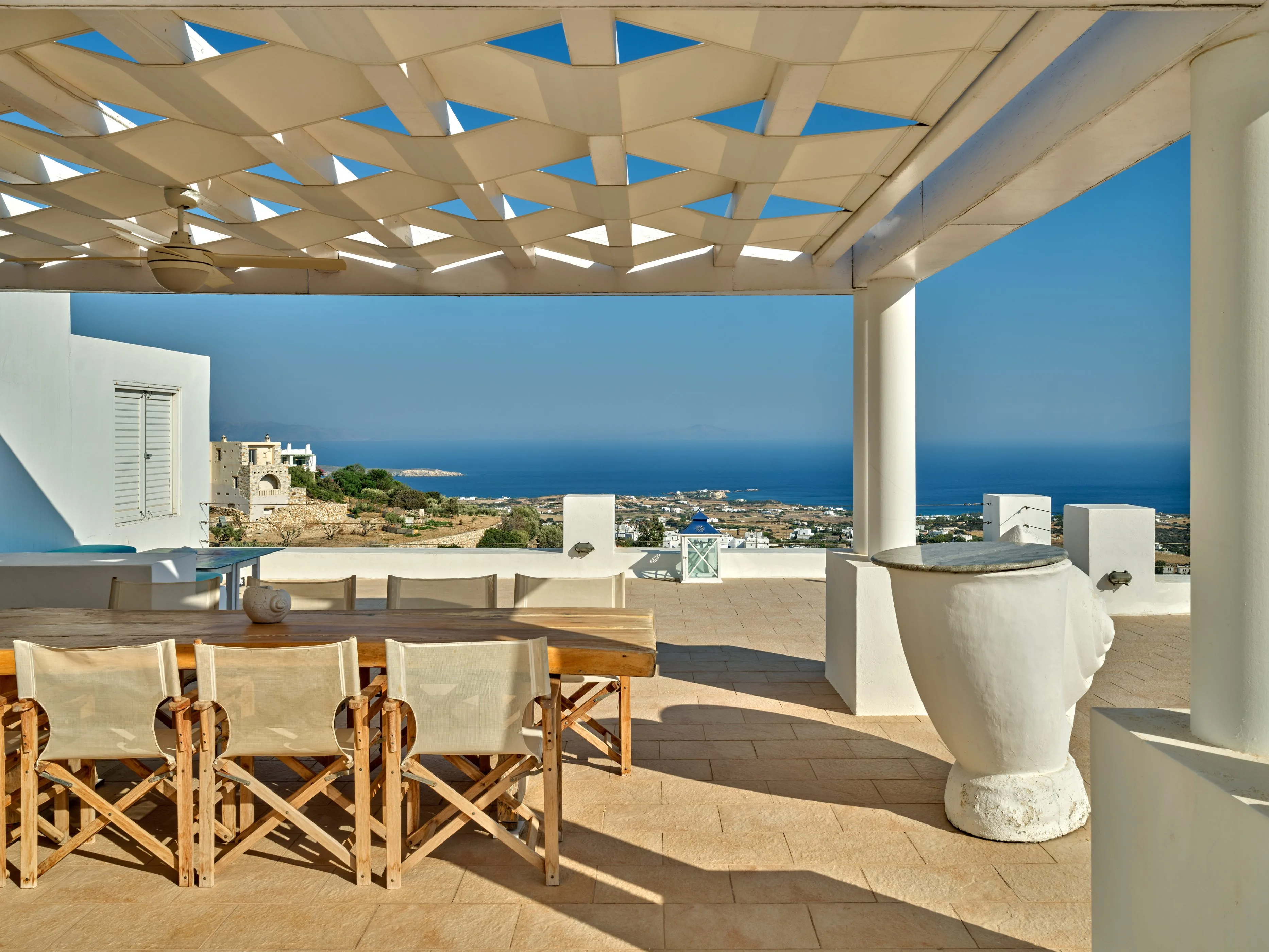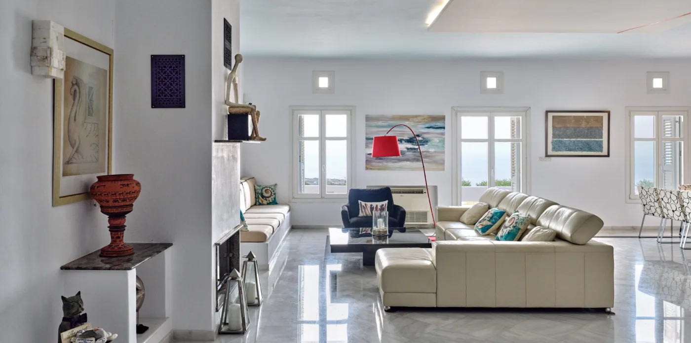 Η παραδοσιακή κυκλαδίτικη αρχιτεκτονική συνδυάζεται όμορφα με όλες τις σύγχρονες ανέσεις που θα μπορούσε κανείς να επιθυμήσει σε αυτή την επιθυμητή βίλα πέντε υπνοδωματίων. Καθώς μπαίνετε στο εσωτερικό, το πρώτο πράγμα που θα δείτε είναι το υπερμεγέθες καθιστικό/τραπεζαρία με τα παράθυρα με εικόνες και το κεντρικό φωτιστικό στοιχείο στην οροφή. Ένα κομψό τζάκι προσθέτει μια ζεστή πινελιά. Η ευρύχωρη ανοιχτή διαρρύθμιση δημιουργεί μια φιλόξενη ατμόσφαιρα, η οποία περιλαμβάνει επίσης μια πλήρως εξοπλισμένη μαρμάρινη κουζίνα με κομψούς πάγκους και κεντρική νησίδα.
