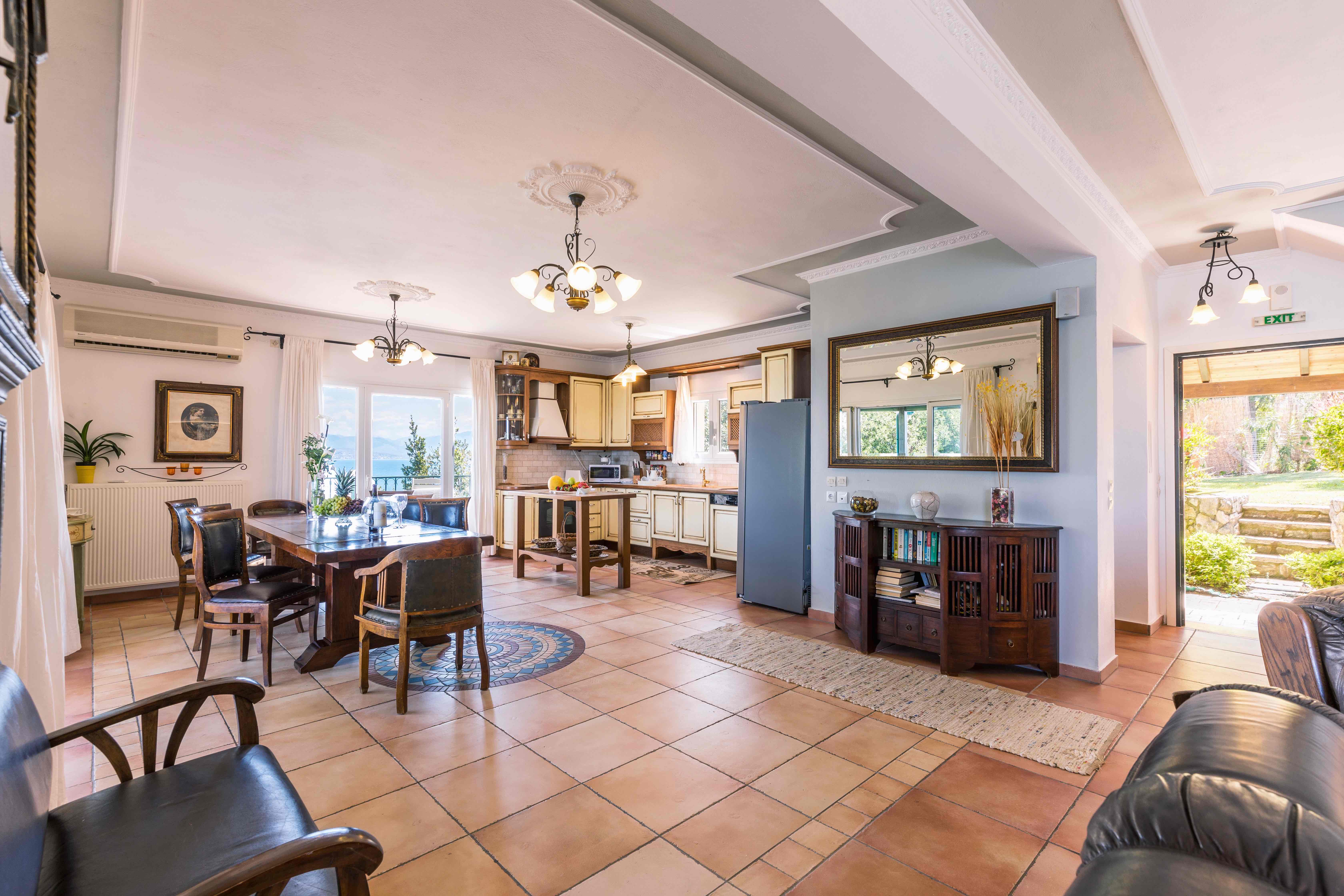 Στο ισόγειο βρίσκονται οι κύριοι χώροι διαβίωσης με μια μεγάλη ανοιχτή κουζίνα/τραπεζαρία/καθιστικό με πόρτες βεράντας που ανοίγουν σε τρεις μεγάλες βεράντες. Σκάλες οδηγούν στον κήπο και στη θερμαινόμενη πισίνα απείρου τύπου. Υπάρχει ένα ακόμη υπνοδωμάτιο με διπλό κρεβάτι και μπάνιο σε αυτόν τον όροφο.