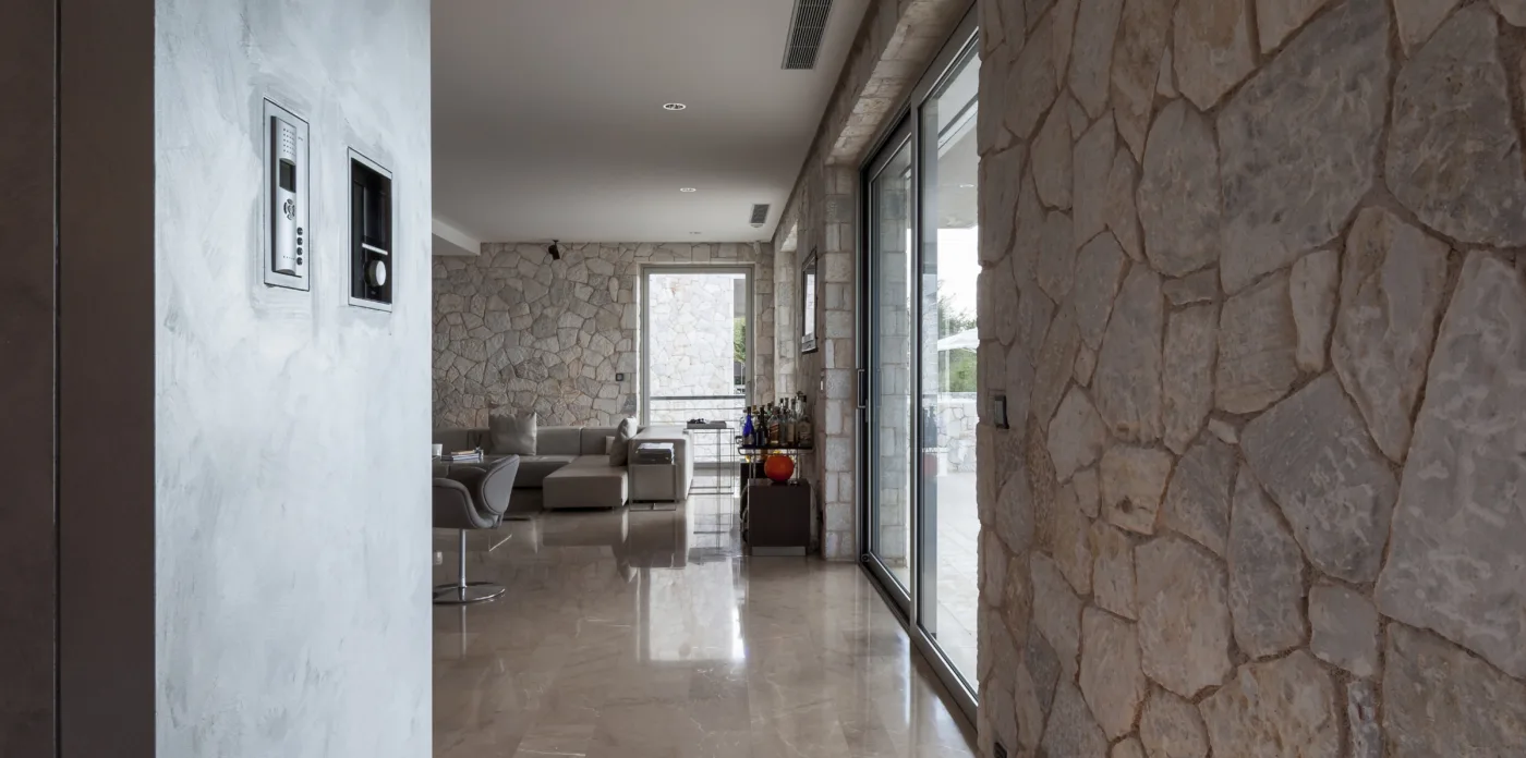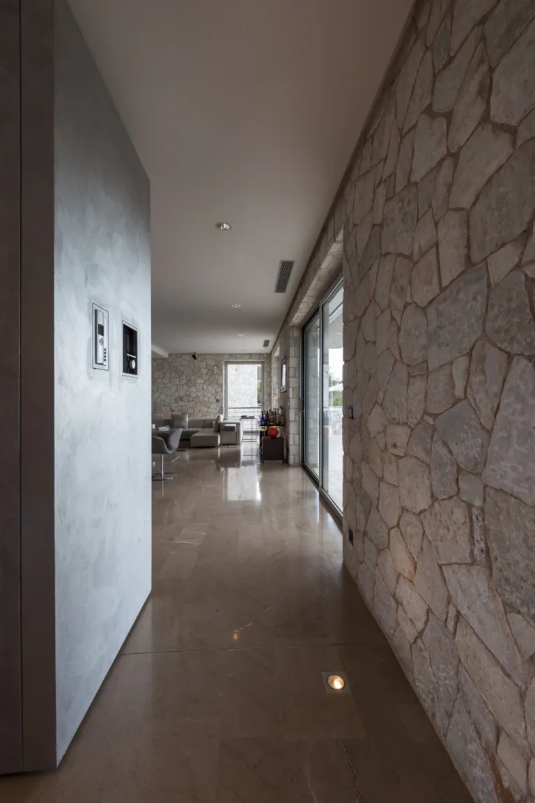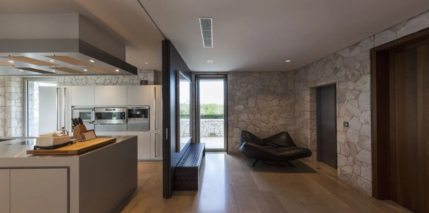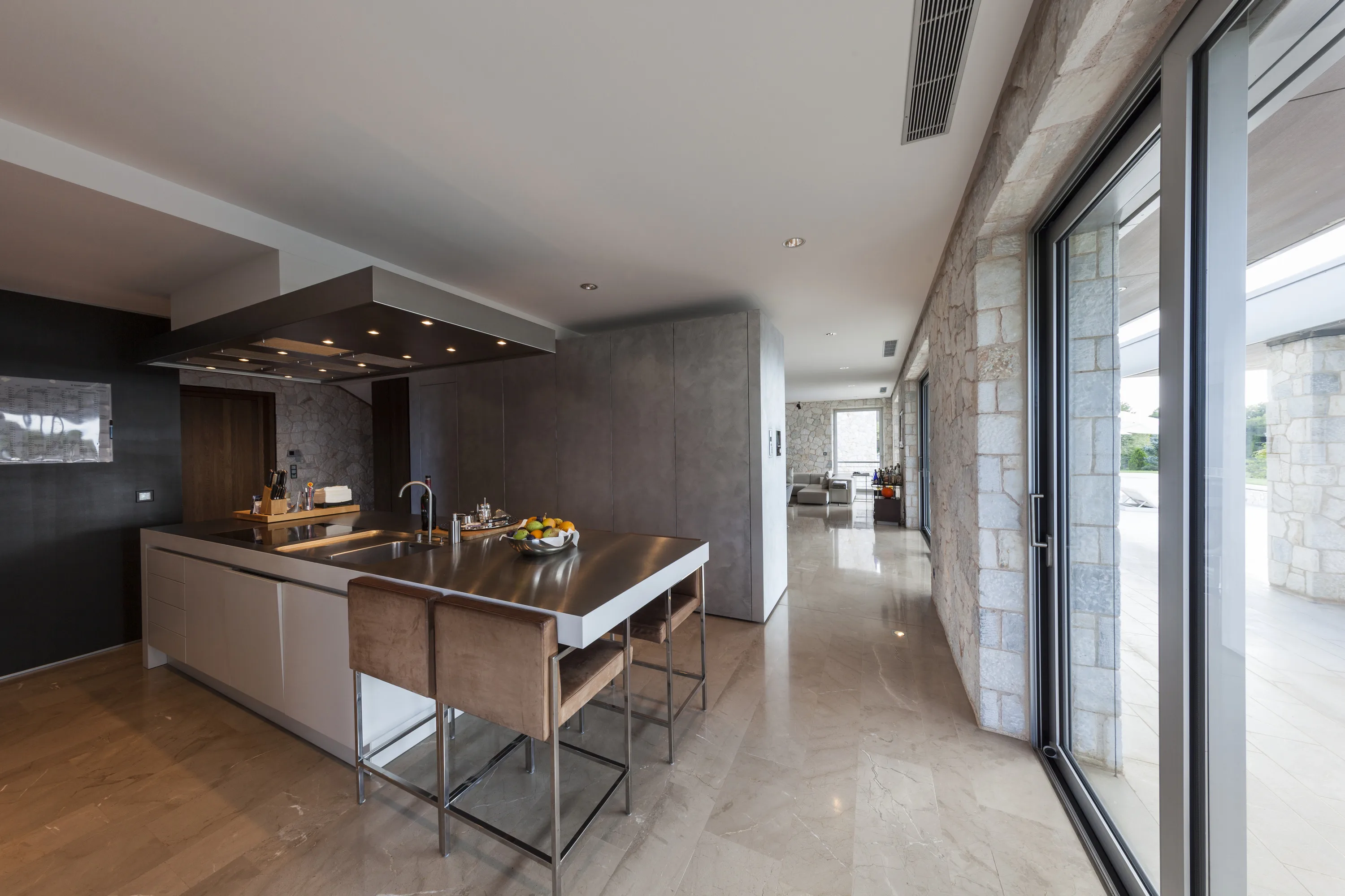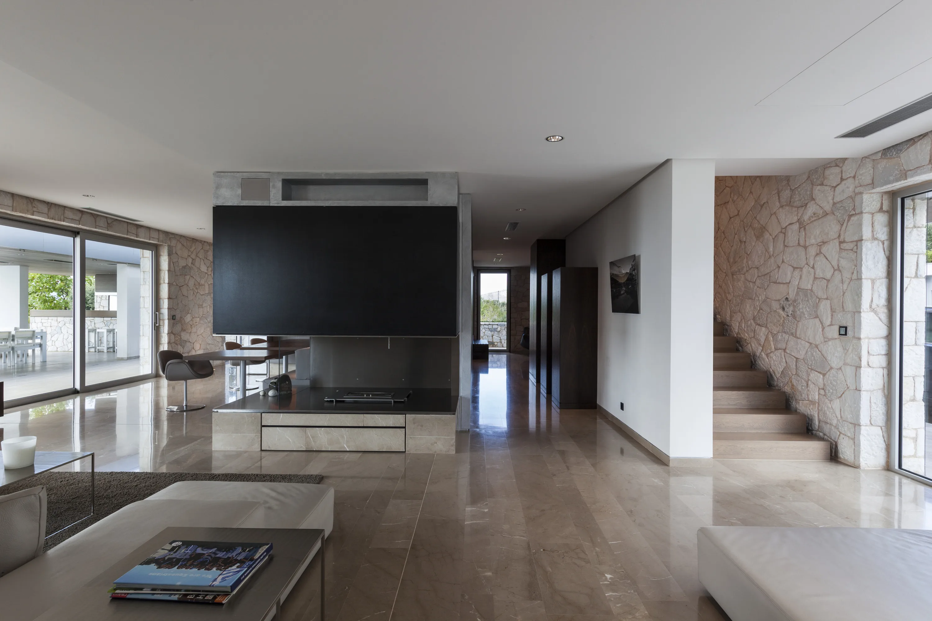 Το ευρύχωρο εσωτερικό των δύο ορόφων του σπιτιού διαθέτει καθιστικά, τραπεζαρία, ένα κύριο υπνοδωμάτιο με γκαρνταρόμπα, δύο επιπλέον υπνοδωμάτια με μπάνια, μια βιβλιοθήκη και ένα γραφείο. Η κουζίνα ανοίγει στην τραπεζαρία της πισίνας και στην εξωτερική κουζίνα μπάρμπεκιου, πλήρως εξοπλισμένη με σύγχρονες συσκευές.