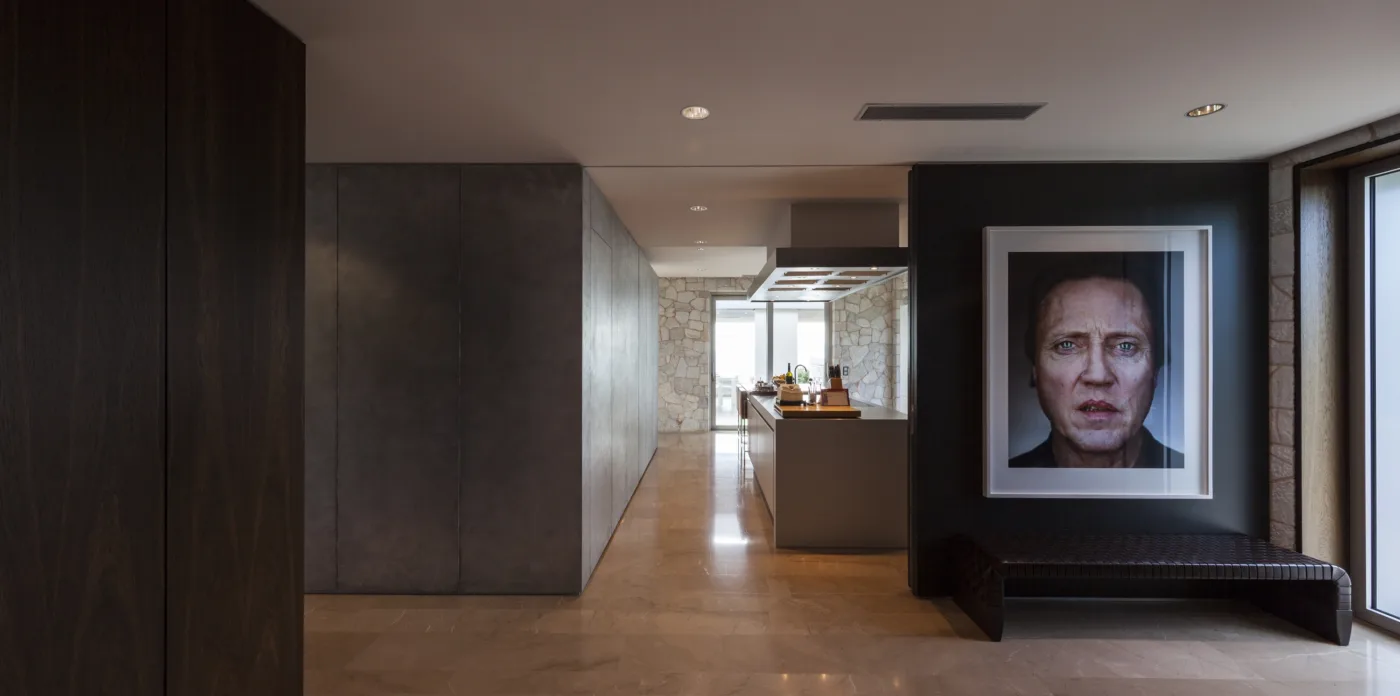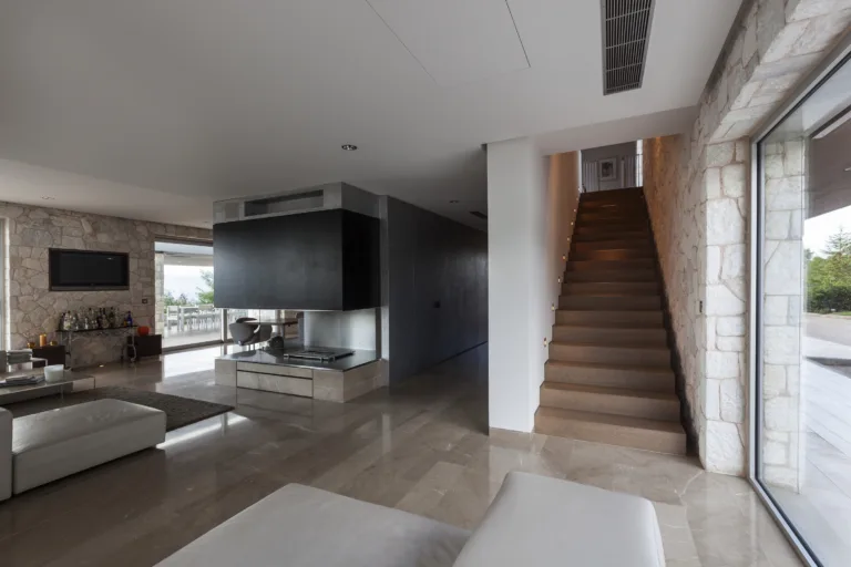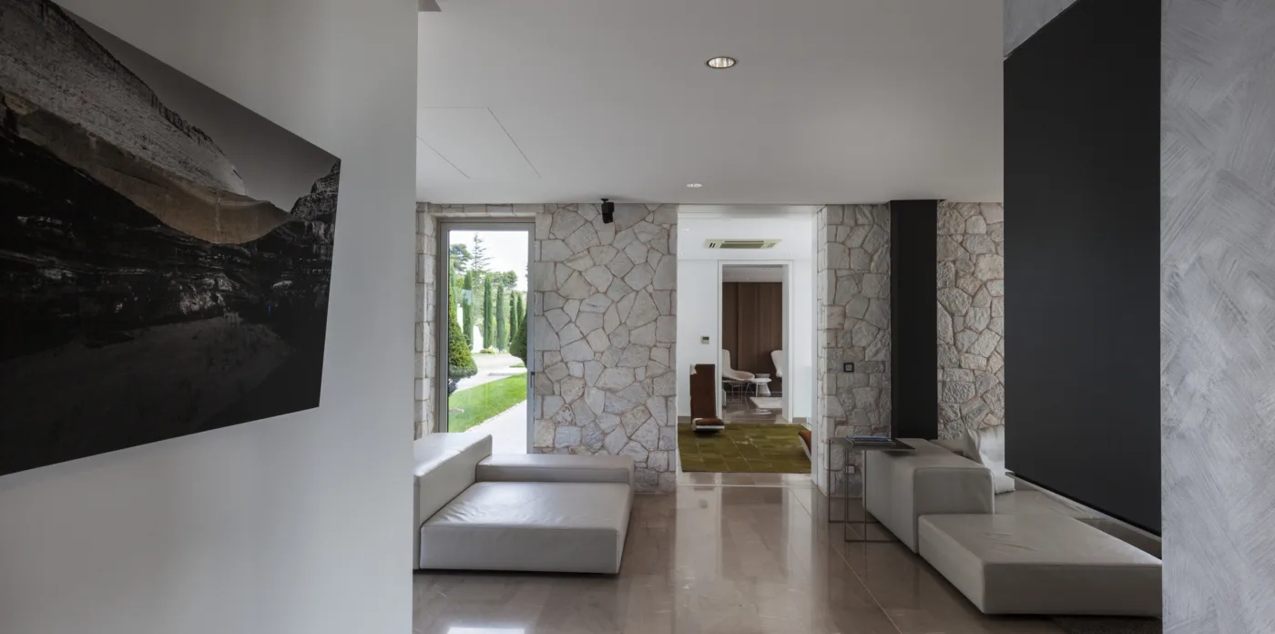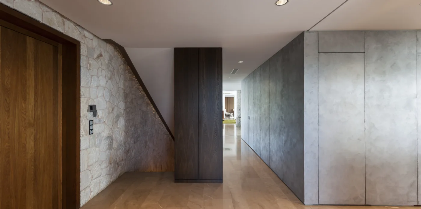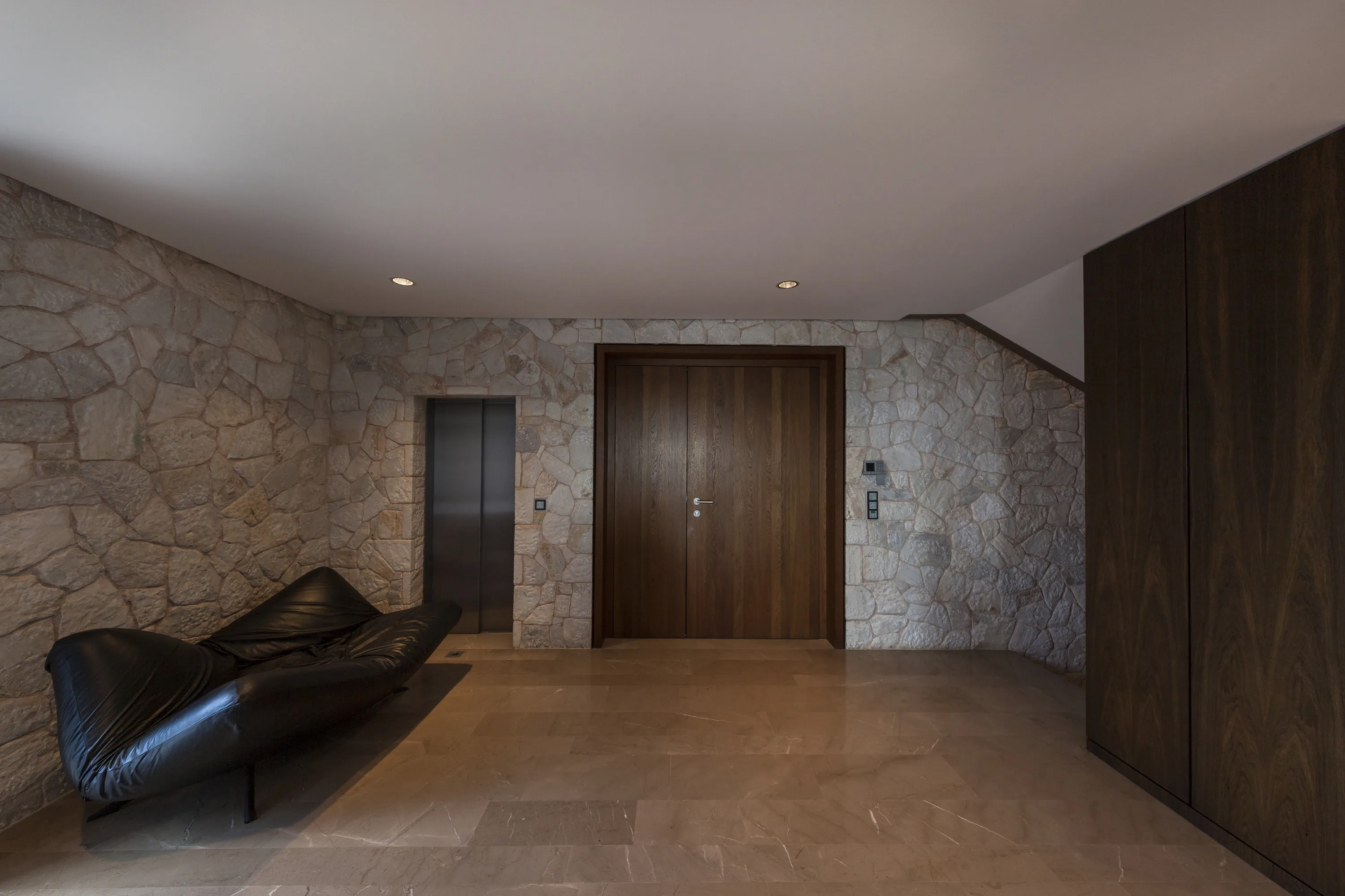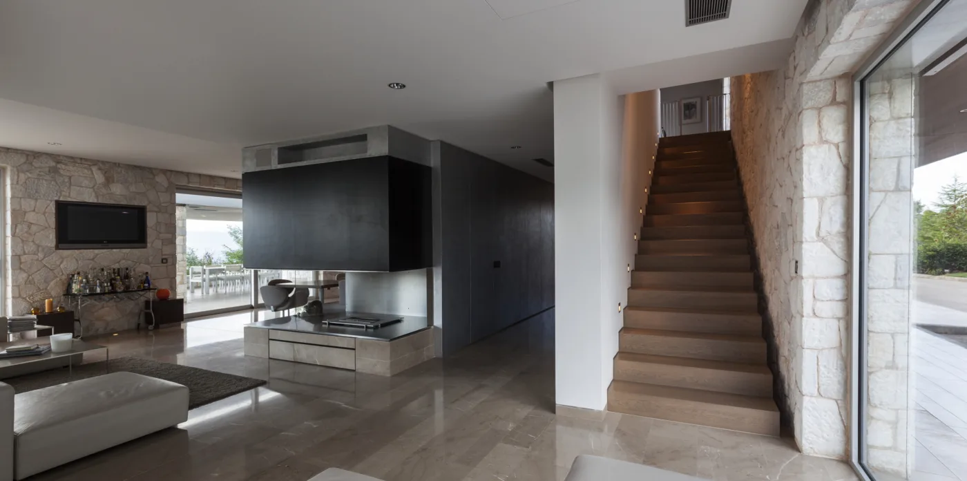 Το ευρύχωρο εσωτερικό των δύο ορόφων του σπιτιού διαθέτει καθιστικά, τραπεζαρία, ένα κύριο υπνοδωμάτιο με γκαρνταρόμπα, δύο επιπλέον υπνοδωμάτια με μπάνια, μια βιβλιοθήκη και ένα γραφείο. Η κουζίνα ανοίγει στην τραπεζαρία της πισίνας και στην εξωτερική κουζίνα μπάρμπεκιου, πλήρως εξοπλισμένη με σύγχρονες συσκευές.