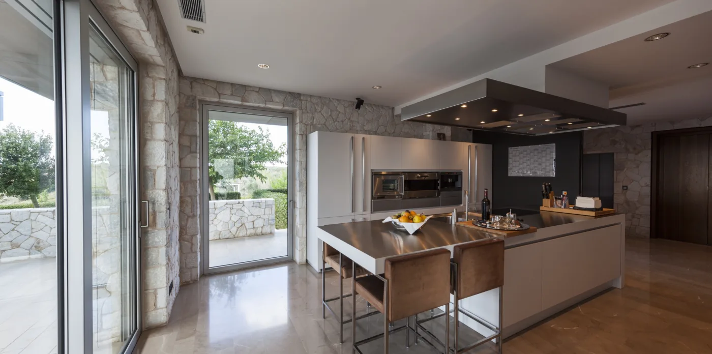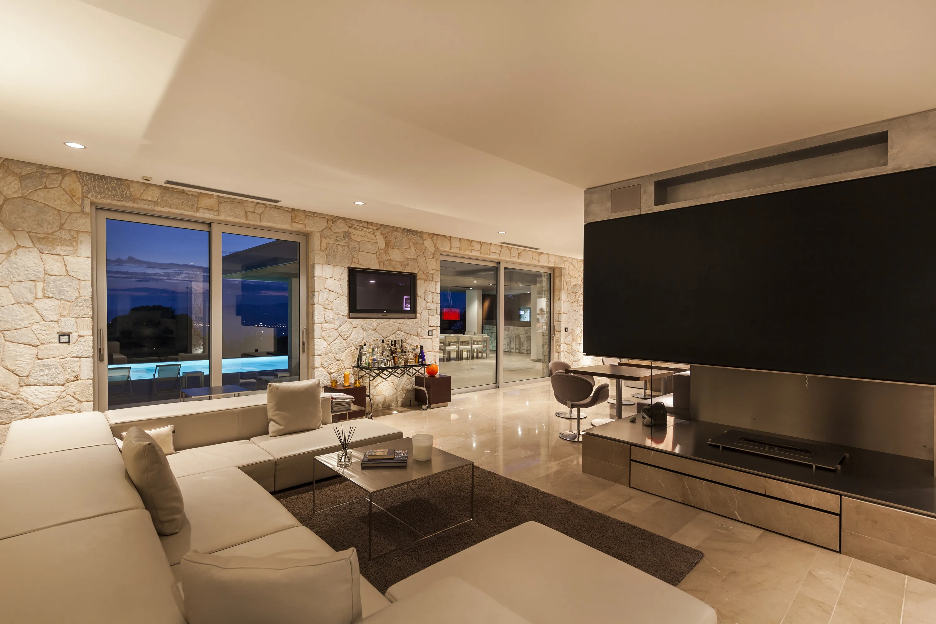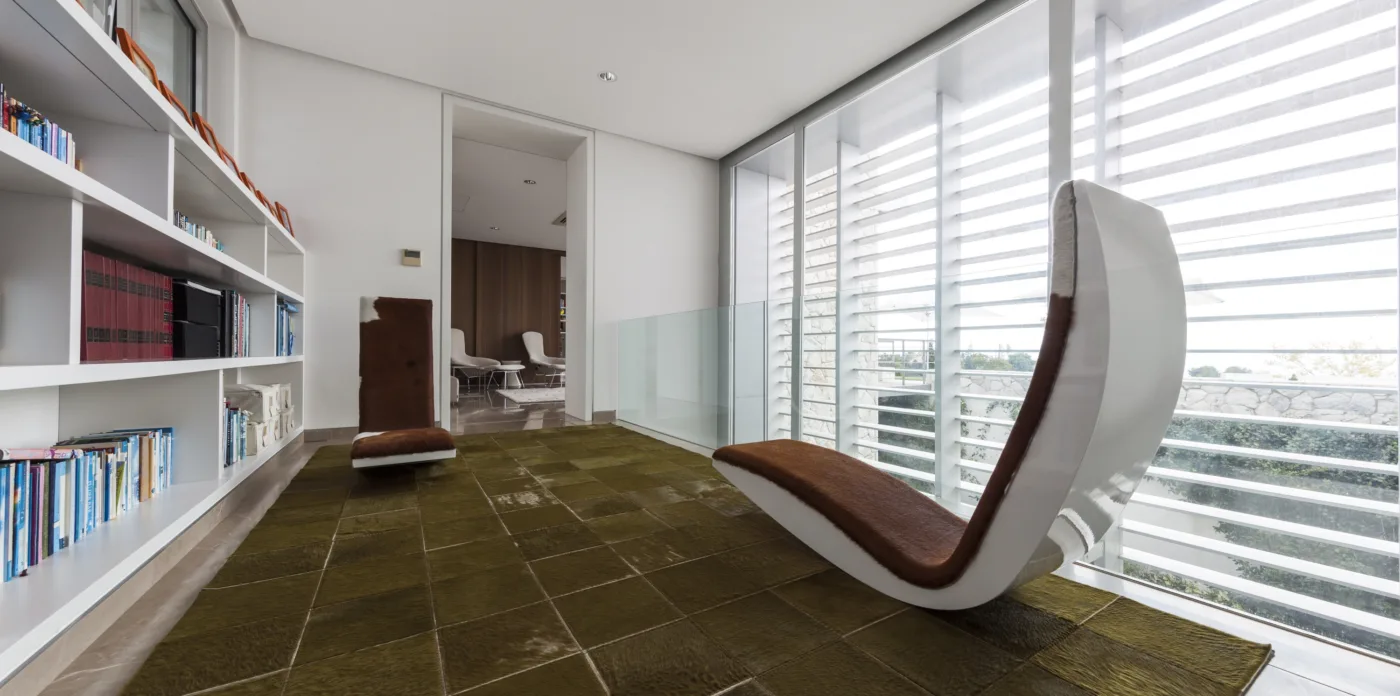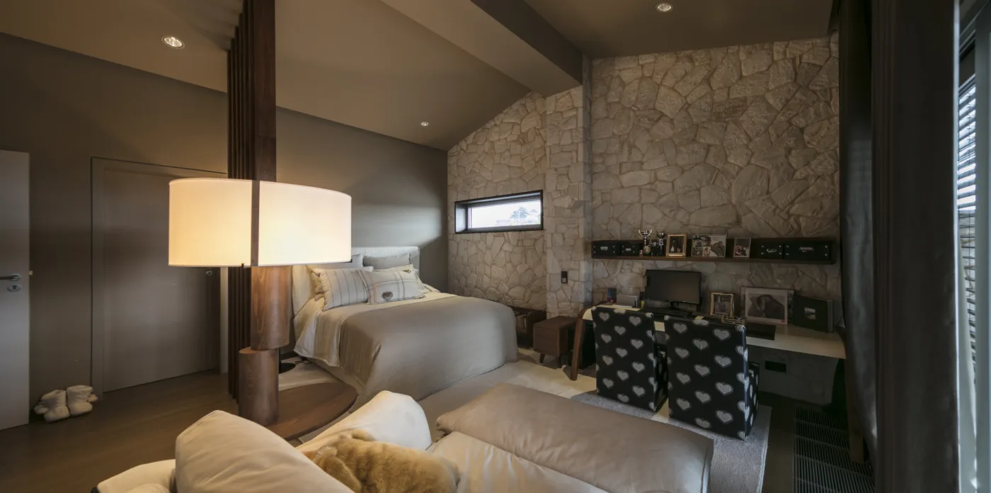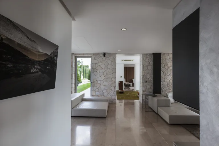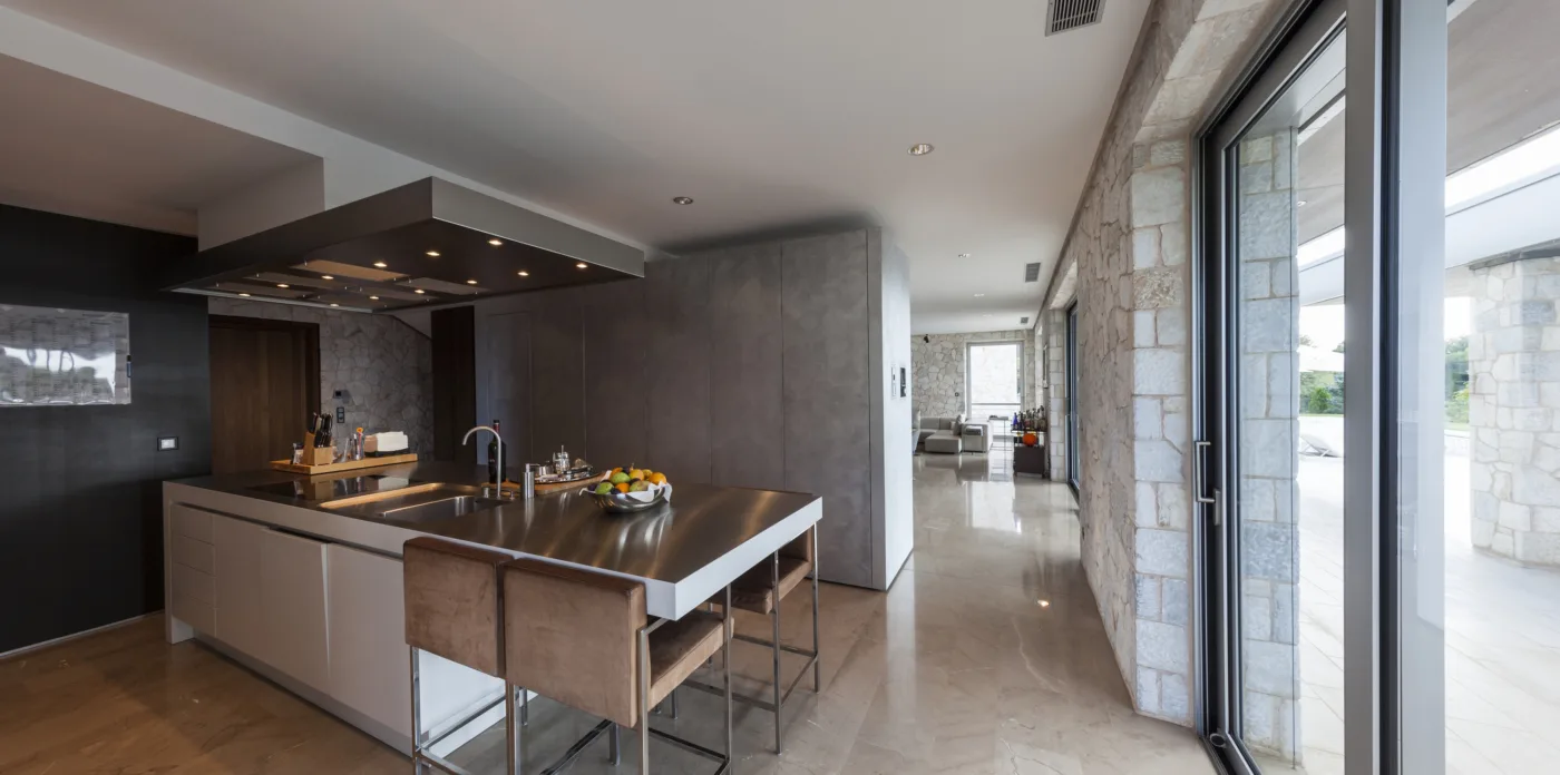 Το ευρύχωρο εσωτερικό των δύο ορόφων του σπιτιού διαθέτει καθιστικά, τραπεζαρία, ένα κύριο υπνοδωμάτιο με γκαρνταρόμπα, δύο επιπλέον υπνοδωμάτια με μπάνια, μια βιβλιοθήκη και ένα γραφείο. Η κουζίνα ανοίγει στην τραπεζαρία της πισίνας και στην εξωτερική κουζίνα μπάρμπεκιου, πλήρως εξοπλισμένη με σύγχρονες συσκευές.