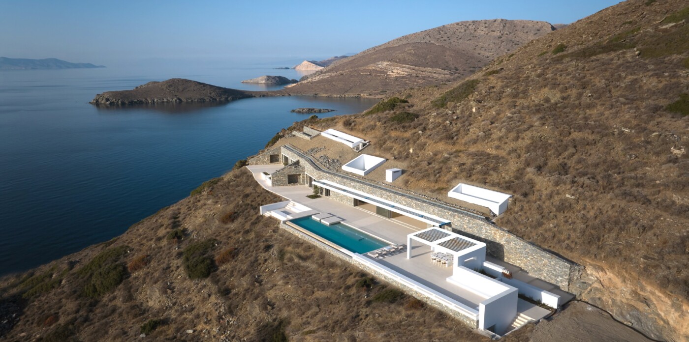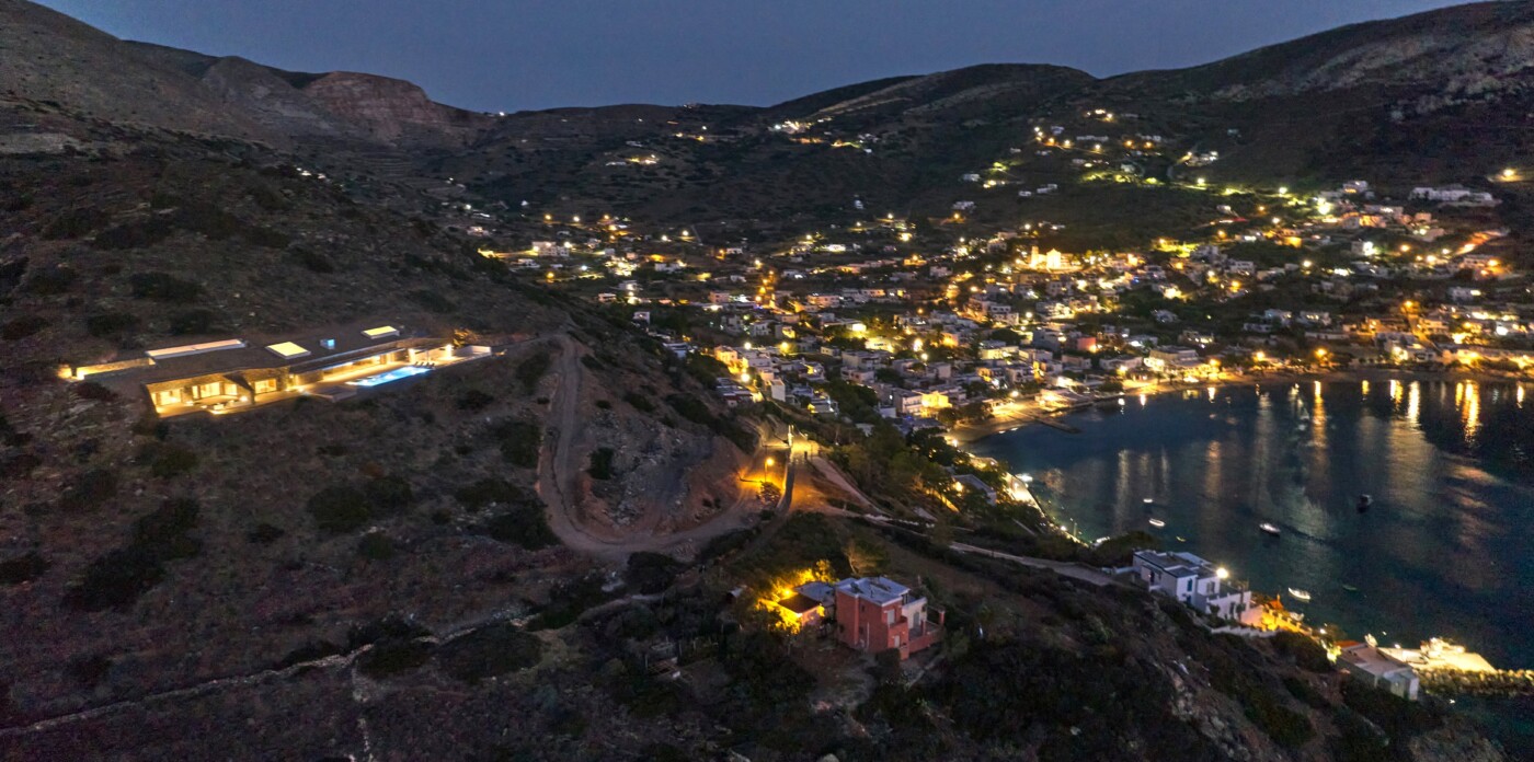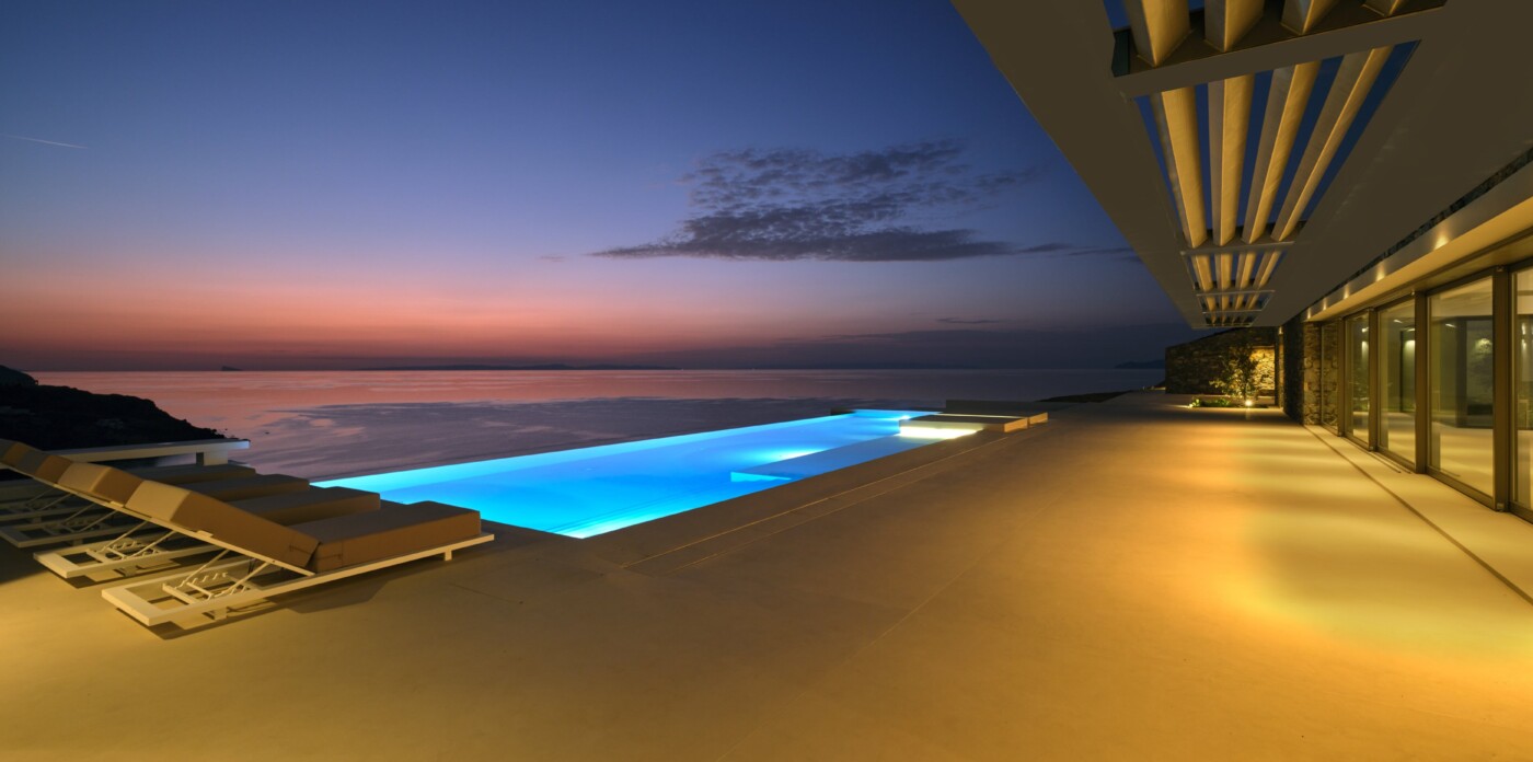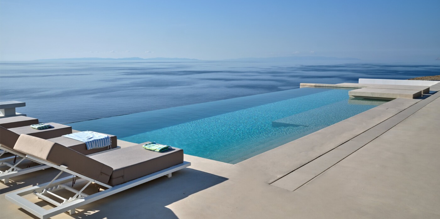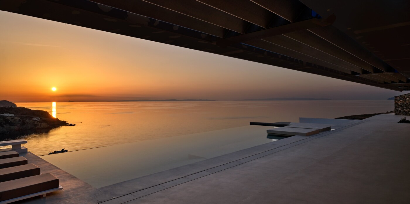 Η πισίνα υπερχείλισης της βίλας εκτείνεται προς το Αιγαίο Πέλαγος, προσφέροντας πανοραμική θέα στην ακτογραμμή, τα λαμπερά φώτα του χωριού Κίνι και αξέχαστα ηλιοβασιλέματα.