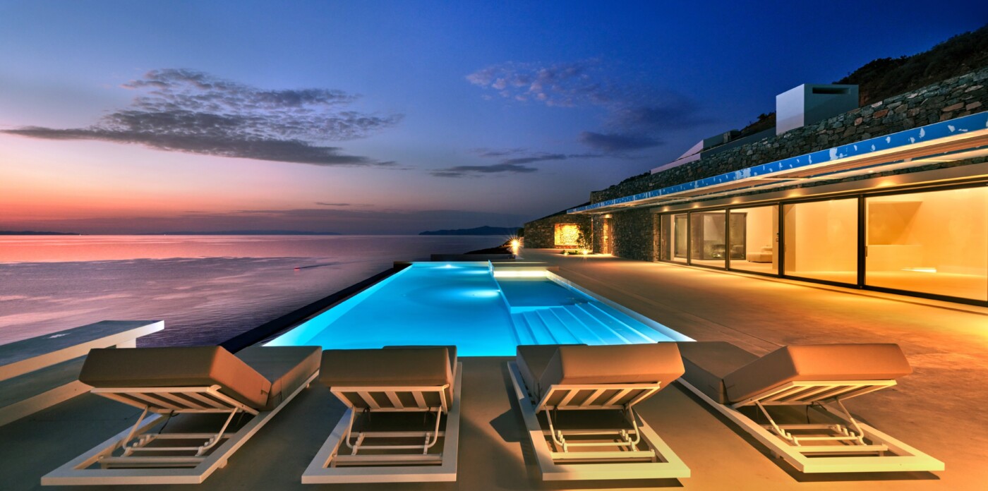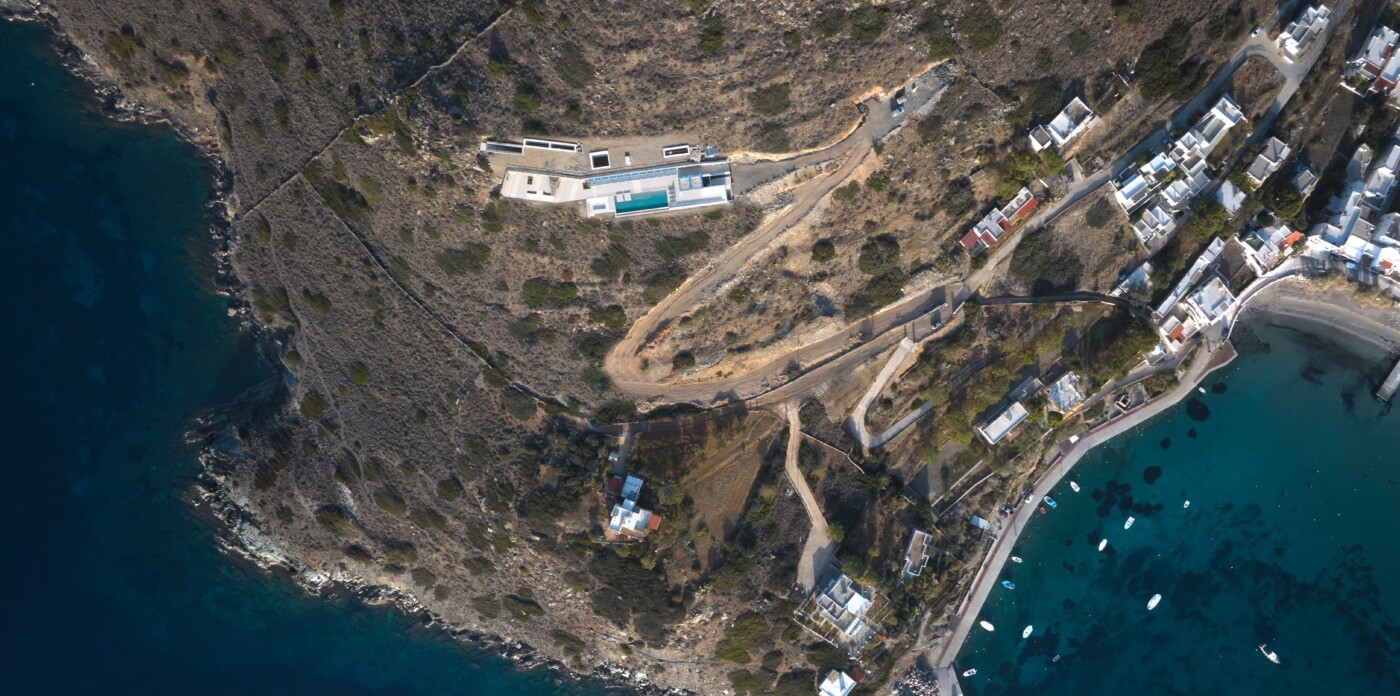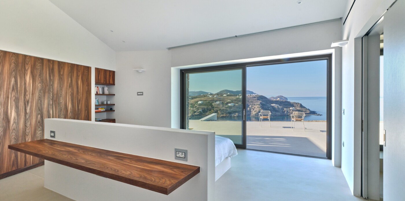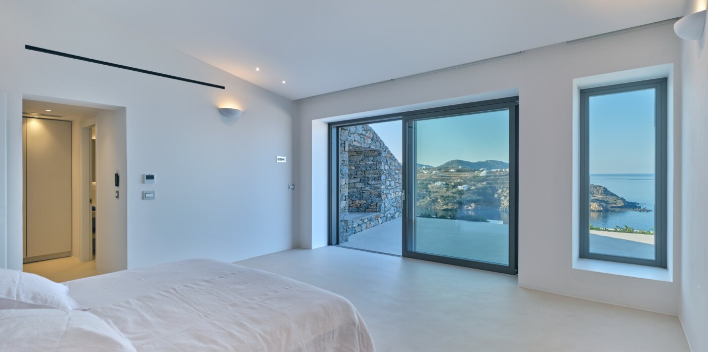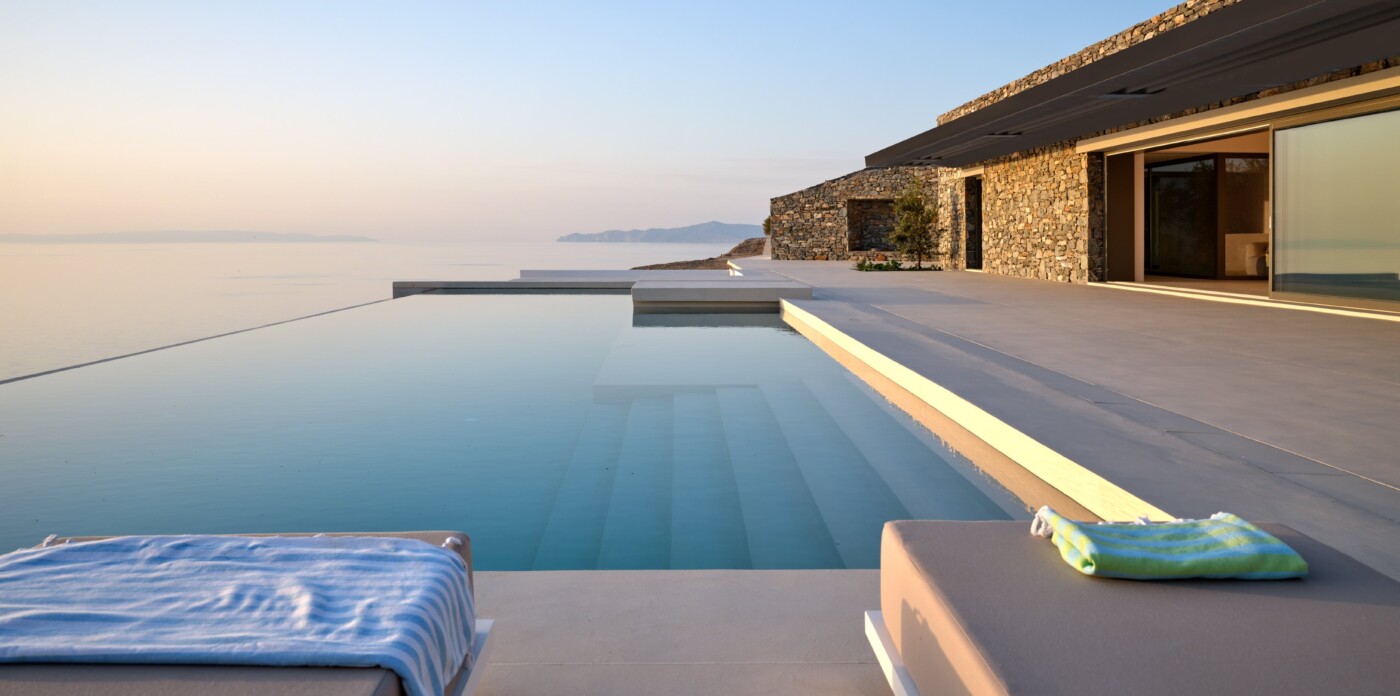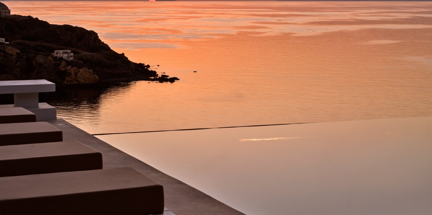 Η πισίνα υπερχείλισης της βίλας εκτείνεται προς το Αιγαίο Πέλαγος, προσφέροντας πανοραμική θέα στην ακτογραμμή, τα λαμπερά φώτα του χωριού Κίνι και αξέχαστα ηλιοβασιλέματα.