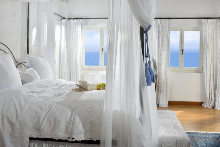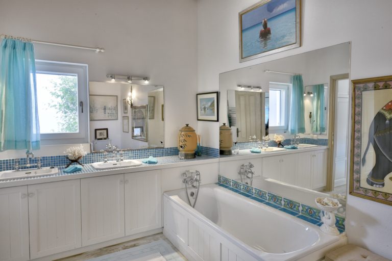 Η καλά εξοπλισμένη κουζίνα καταλήγει αβίαστα στην τραπεζαρία, όπου περιμένει ένα υπέροχο ροζ μαρμάρινο τραπέζι, ιδανικό για κοινωνικές συγκεντρώσεις. Καθένα από τα πέντε πολυτελή δίκλινα υπνοδωμάτια, που βρίσκονται μέσα στο κυρίως σπίτι και όλα βλέπουν προς τη θάλασσα, διαθέτει πολυτελή μπάνια και ντους, το καθένα με μαγευτική θέα στη θάλασσα.