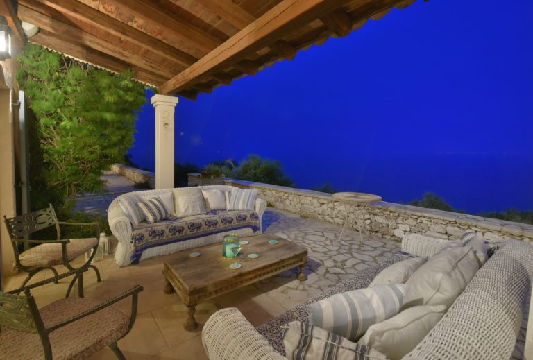 Στα δυτικά του κτήματος, μια πέτρινη σκάλα ανεβαίνει σε μια βεράντα στην κορυφή του λόφου, η οποία προσφέρει πανοραμική θέα 360 μοιρών στο νησί - ένα πλεονεκτικό σημείο απαράμιλλης μεγαλοπρέπειας. Δίπλα στην ελαιοφυτεμένη είσοδο, ένα γκαράζ τριών αυτοκινήτων κρύβει ένα σημαντικό διαμέρισμα ενός υπνοδωματίου, ιδανικό για τη φιλοξενία του προσωπικού ή των επισκεπτών που αναζητούν ιδιωτικότητα.