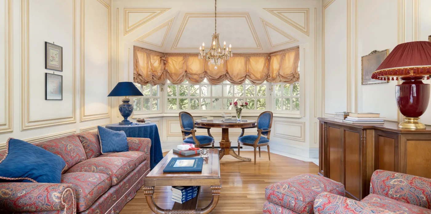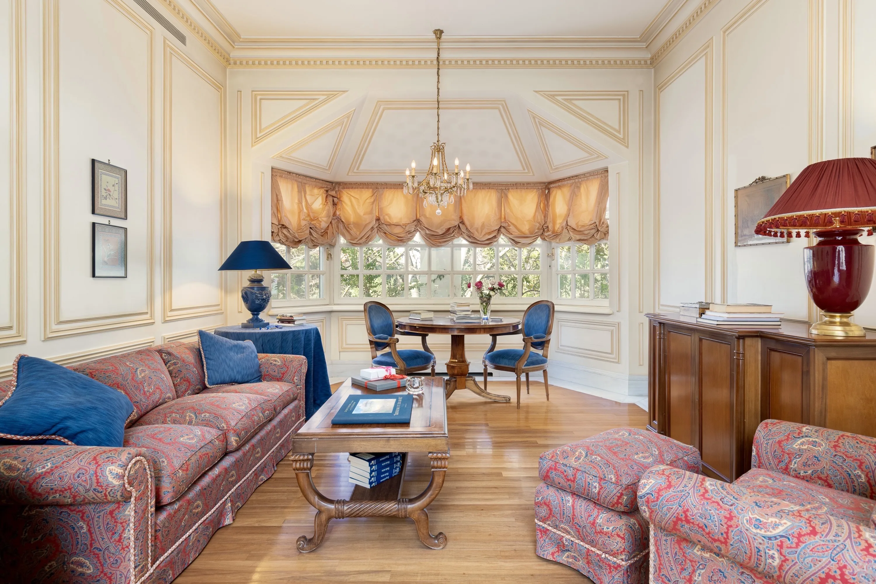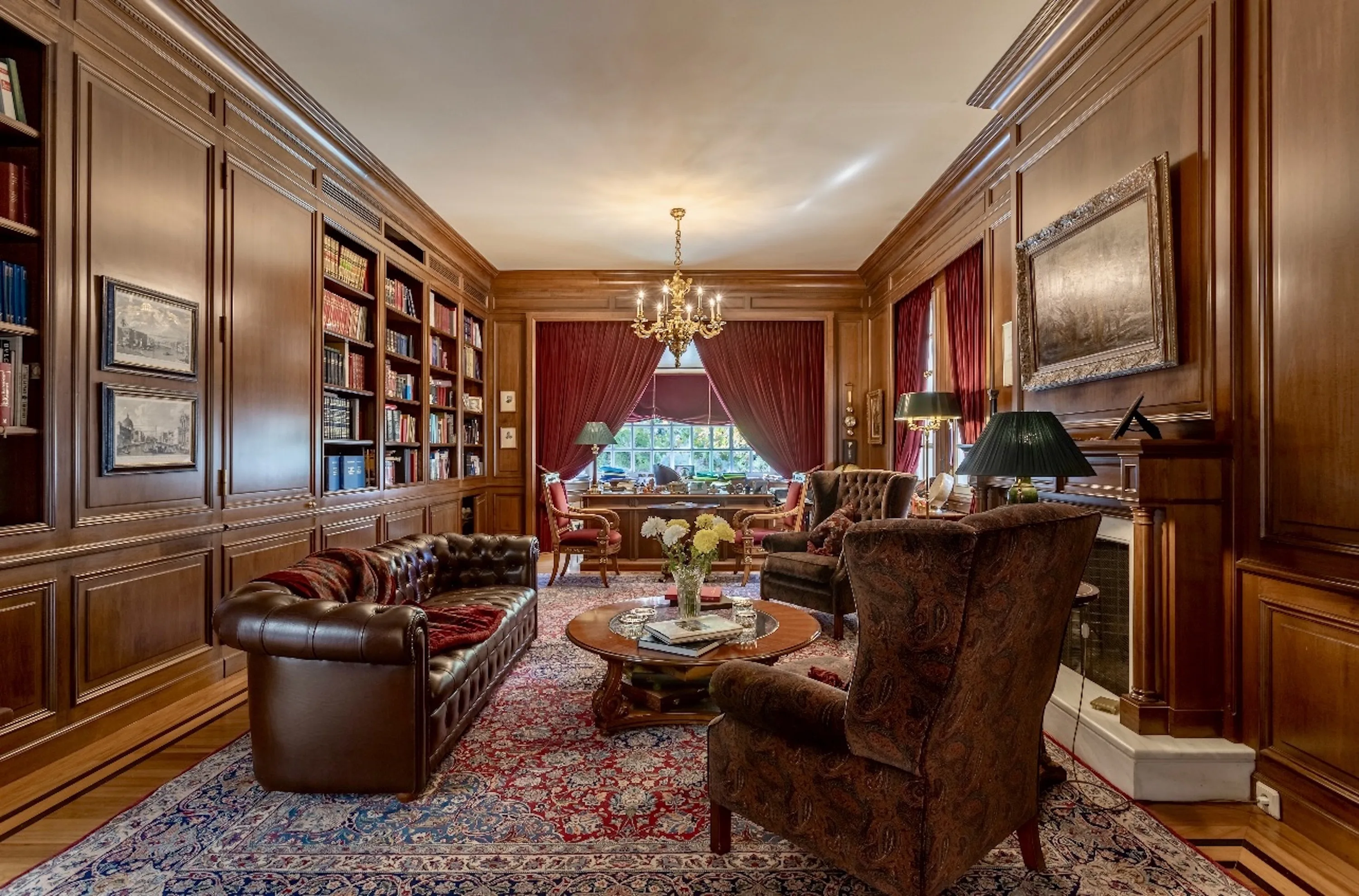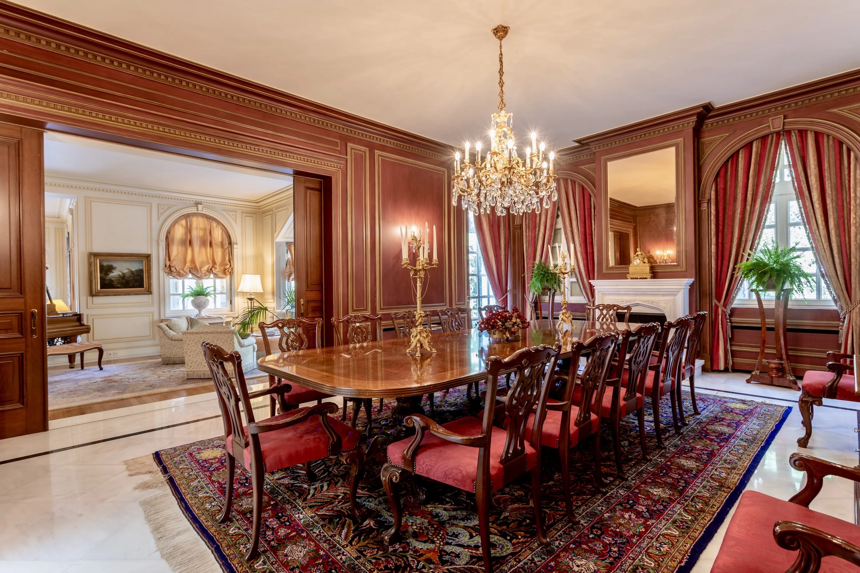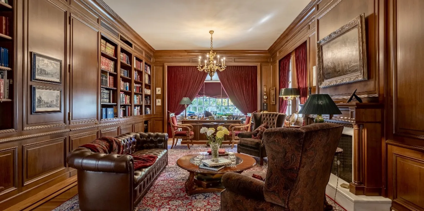 Το φυσικό φως εισέρχεται στο δωμάτιο μέσω ενός εκπληκτικού φωτιστικού οροφής. Κλασικά χρωματικά θέματα όπως το μπορντό, το μπλε του βεραμάν, το απαλό κρεμ και το ανοιχτό πράσινο κυριαρχούν σε όλο το αρχοντικό. Τοξωτές γυάλινες πόρτες και παράθυρα, βελούδινα έπιπλα εποχής και πλούσια ξύλινη επένδυση είναι μερικά από τα διακοσμητικά στοιχεία που θυμίζουν μια αριστοκρατική αίσθηση. Υπάρχει άφθονος χώρος για να χαλαρώσετε και να διασκεδάσετε, είτε δίπλα στο τζάκι στο καθιστικό ή στη βιβλιοθήκη είτε στο σαλόνι και την τραπεζαρία.