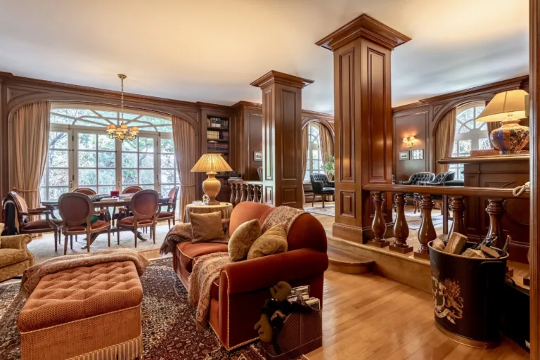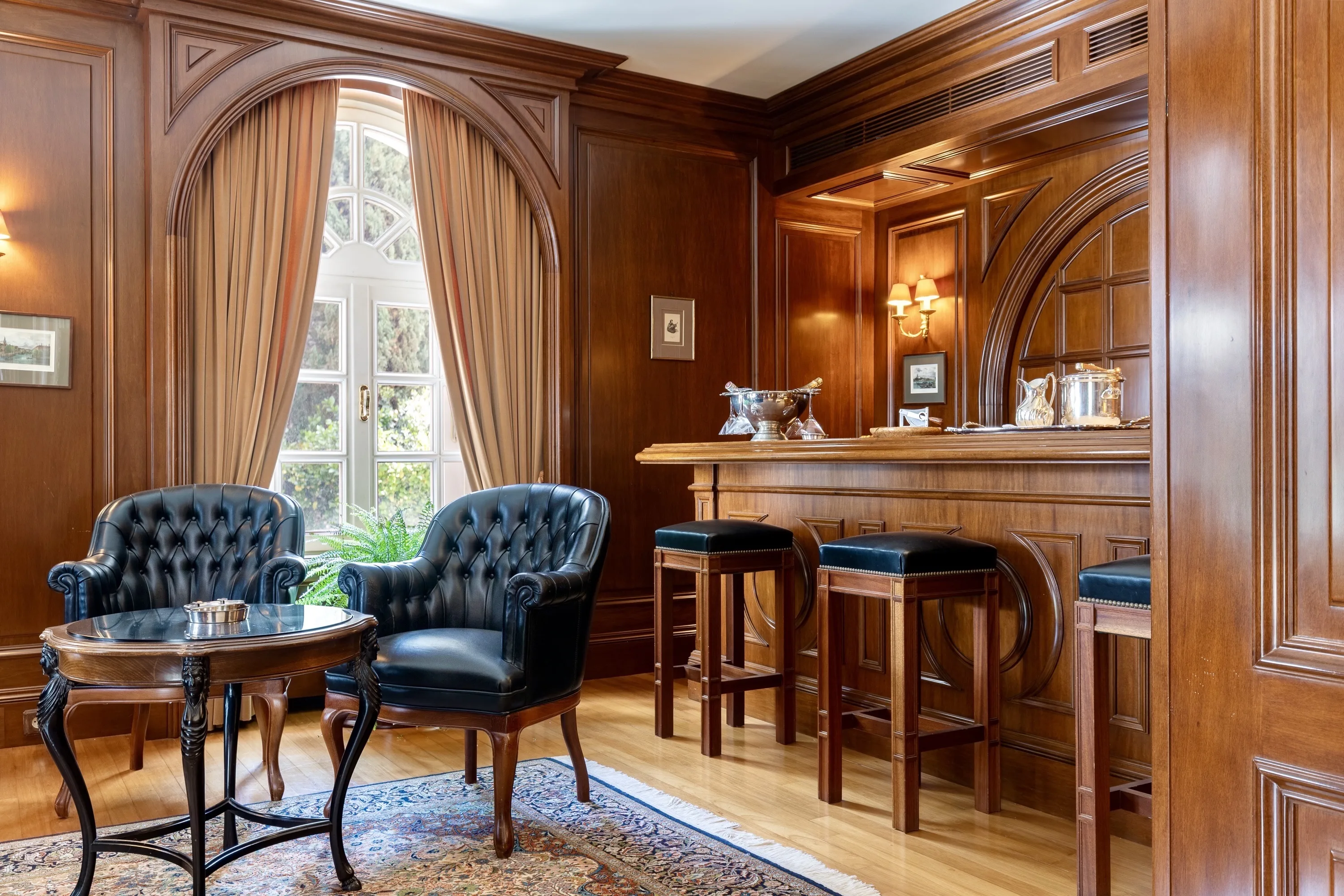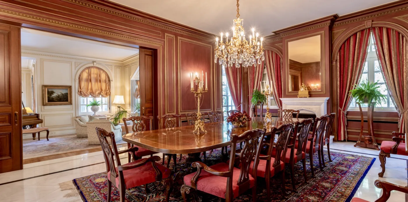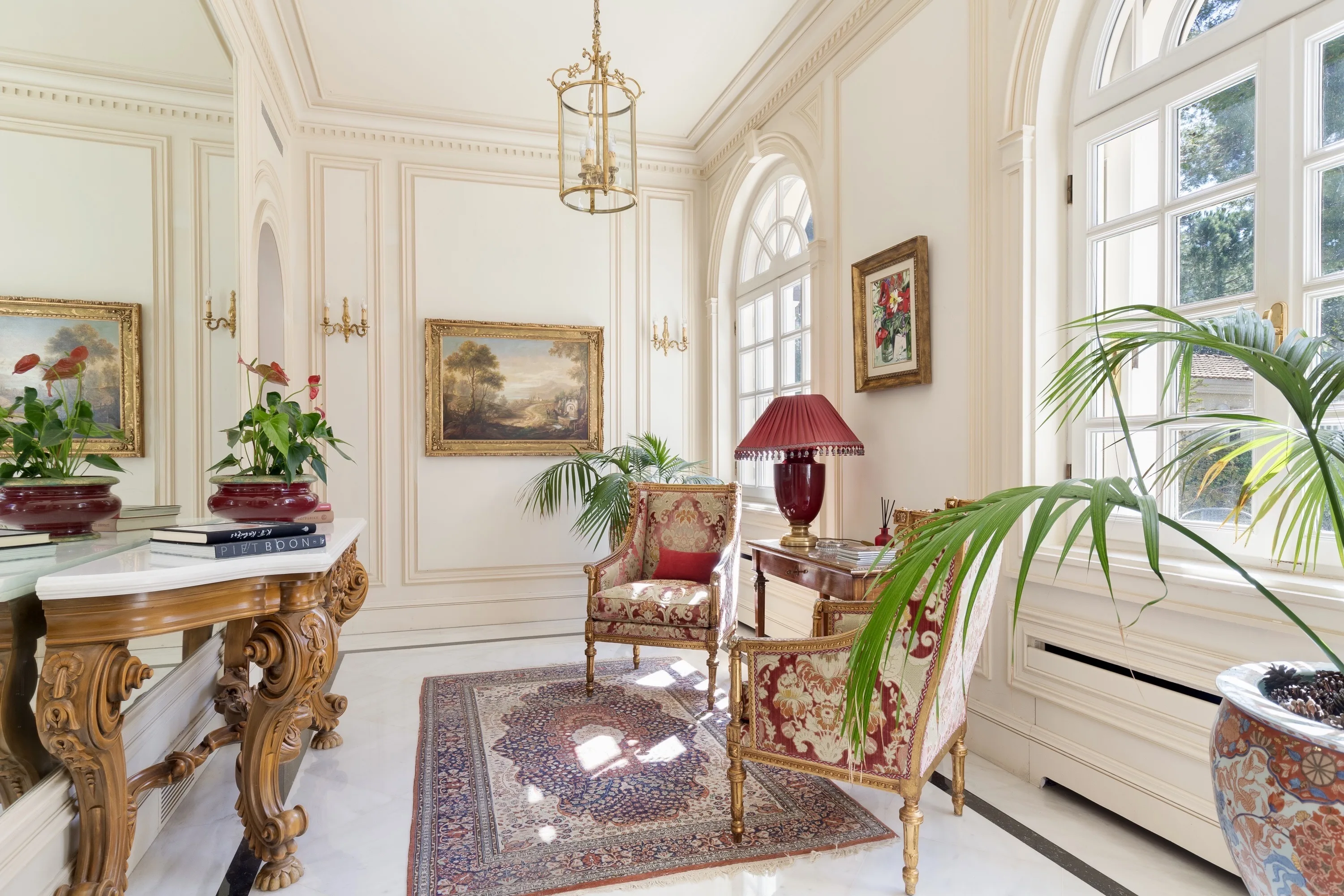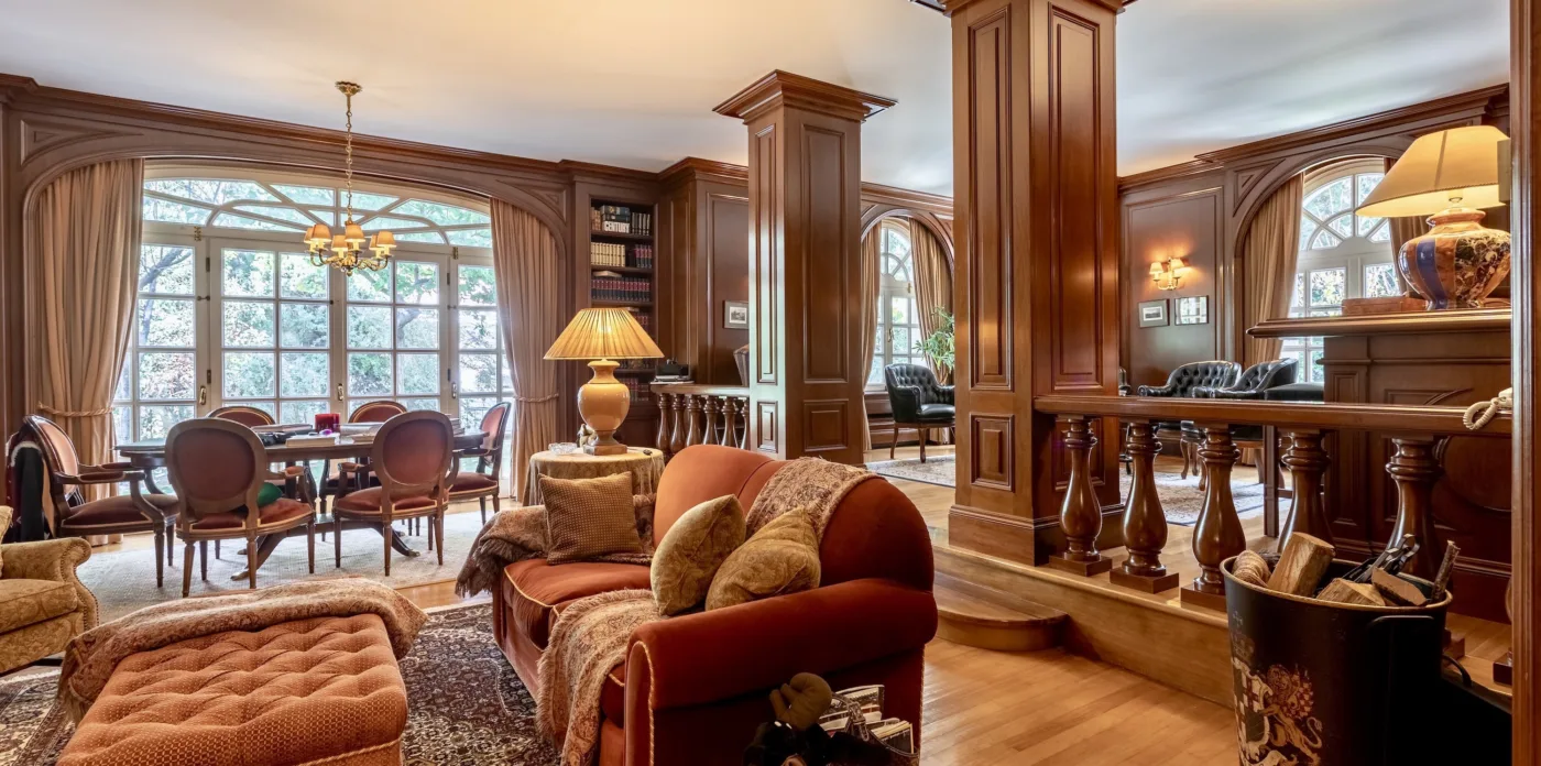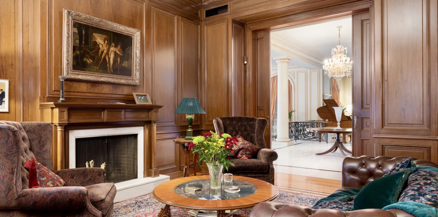Το φυσικό φως εισέρχεται στο δωμάτιο μέσω ενός εκπληκτικού φωτιστικού οροφής. Κλασικά χρωματικά θέματα όπως το μπορντό, το μπλε του βεραμάν, το απαλό κρεμ και το ανοιχτό πράσινο κυριαρχούν σε όλο το αρχοντικό. Τοξωτές γυάλινες πόρτες και παράθυρα, βελούδινα έπιπλα εποχής και πλούσια ξύλινη επένδυση είναι μερικά από τα διακοσμητικά στοιχεία που θυμίζουν μια αριστοκρατική αίσθηση. Υπάρχει άφθονος χώρος για να χαλαρώσετε και να διασκεδάσετε, είτε δίπλα στο τζάκι στο καθιστικό ή στη βιβλιοθήκη είτε στο σαλόνι και την τραπεζαρία.