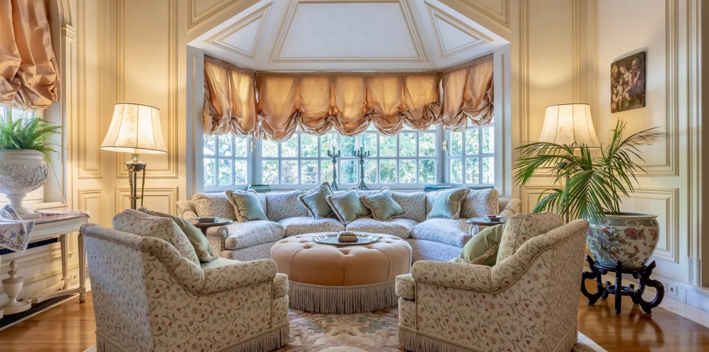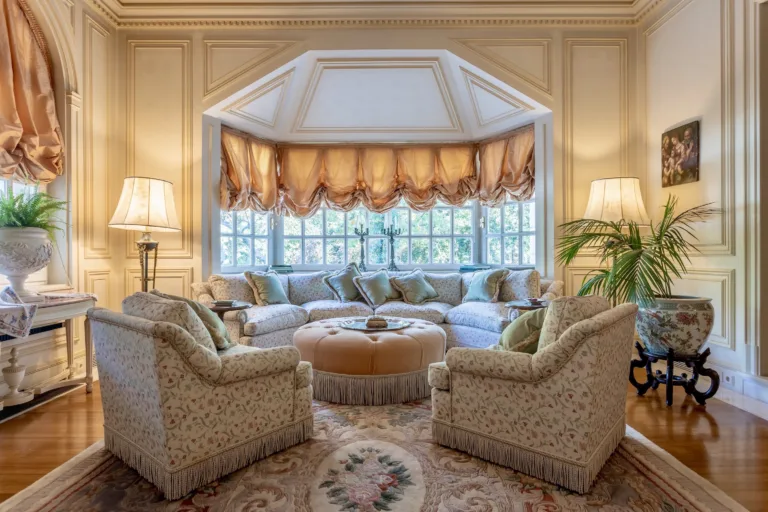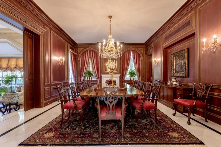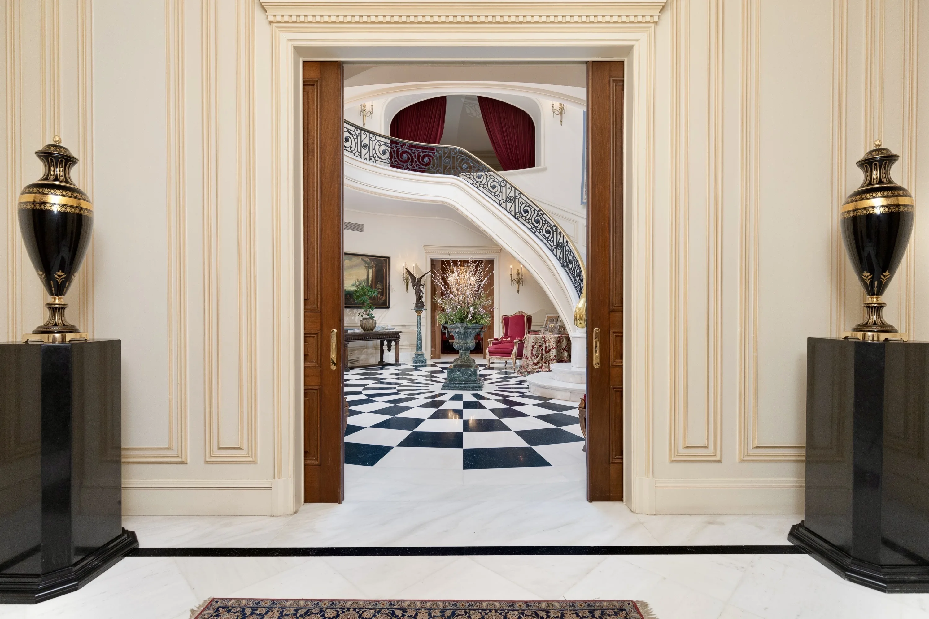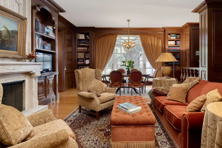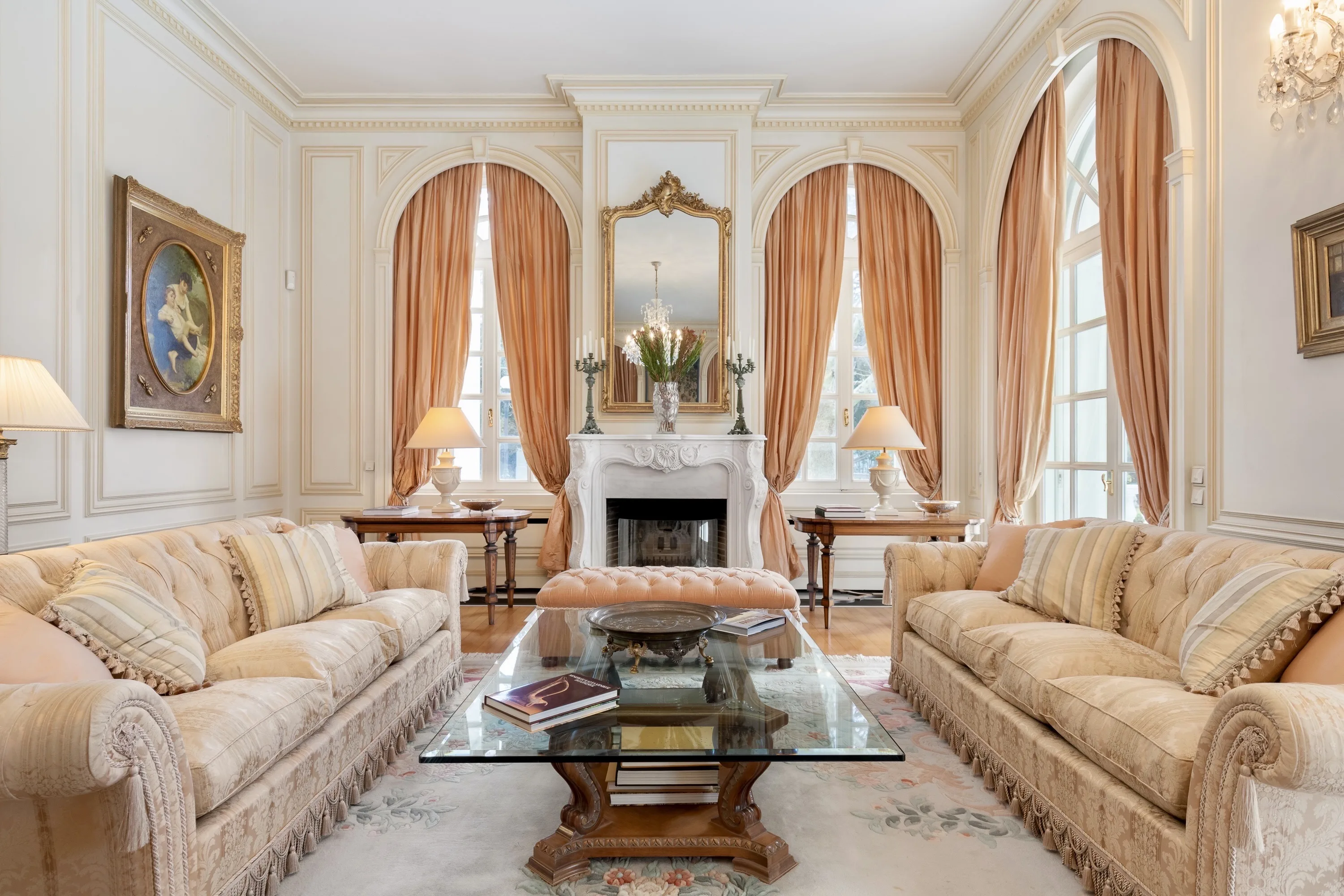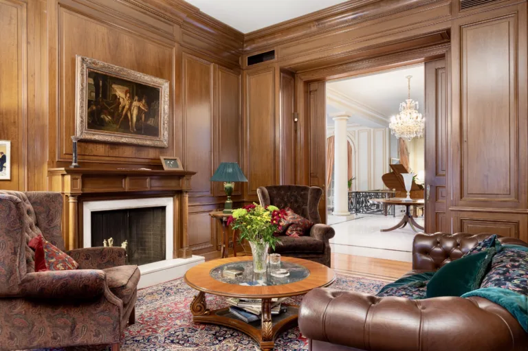 Το φυσικό φως εισέρχεται στο δωμάτιο μέσω ενός εκπληκτικού φωτιστικού οροφής. Κλασικά χρωματικά θέματα όπως το μπορντό, το μπλε του βεραμάν, το απαλό κρεμ και το ανοιχτό πράσινο κυριαρχούν σε όλο το αρχοντικό. Τοξωτές γυάλινες πόρτες και παράθυρα, βελούδινα έπιπλα εποχής και πλούσια ξύλινη επένδυση είναι μερικά από τα διακοσμητικά στοιχεία που θυμίζουν μια αριστοκρατική αίσθηση. Υπάρχει άφθονος χώρος για να χαλαρώσετε και να διασκεδάσετε, είτε δίπλα στο τζάκι στο καθιστικό ή στη βιβλιοθήκη είτε στο σαλόνι και την τραπεζαρία.