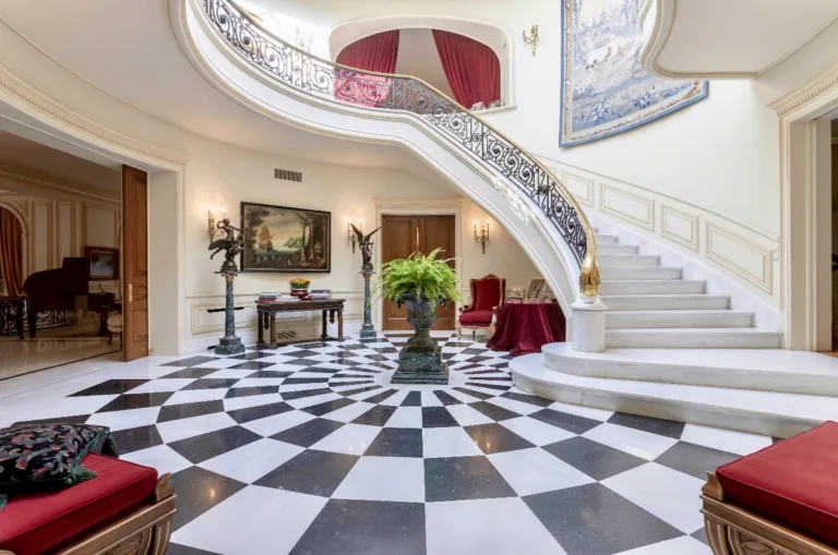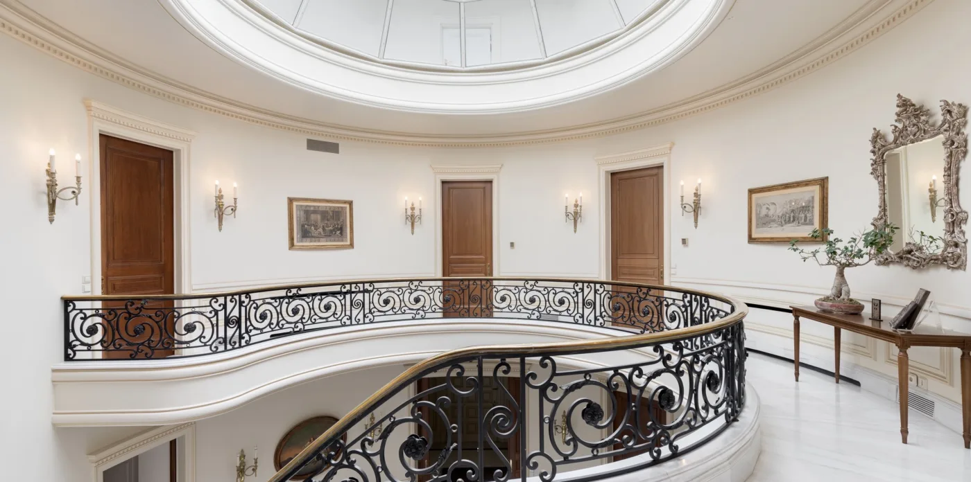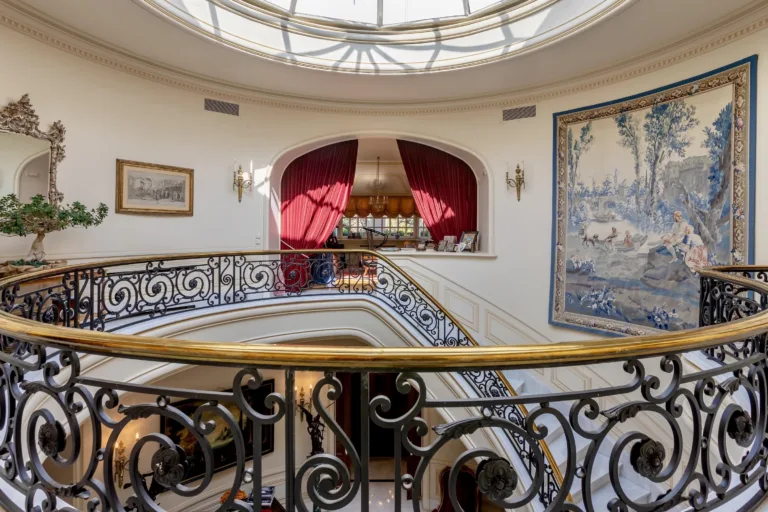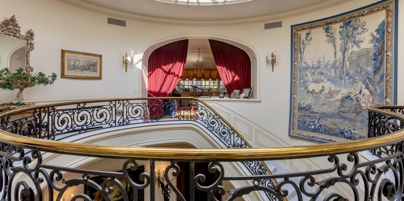 Μια λευκή μαρμάρινη κυκλική σκάλα οδηγεί στο πρώτο επίπεδο. Από εκεί μπορεί κανείς να θαυμάσει μια όμορφη ταπετσαρία τοίχου που θυμίζει το παρισινό στυλ Gobelin.