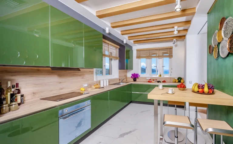 Η κουζίνα είναι εξοπλισμένη με γυαλιστερά ντουλάπια και ξύλινους πάγκους, ενώ τα παράθυρα διπλής όψης έχουν θέα στη θάλασσα.