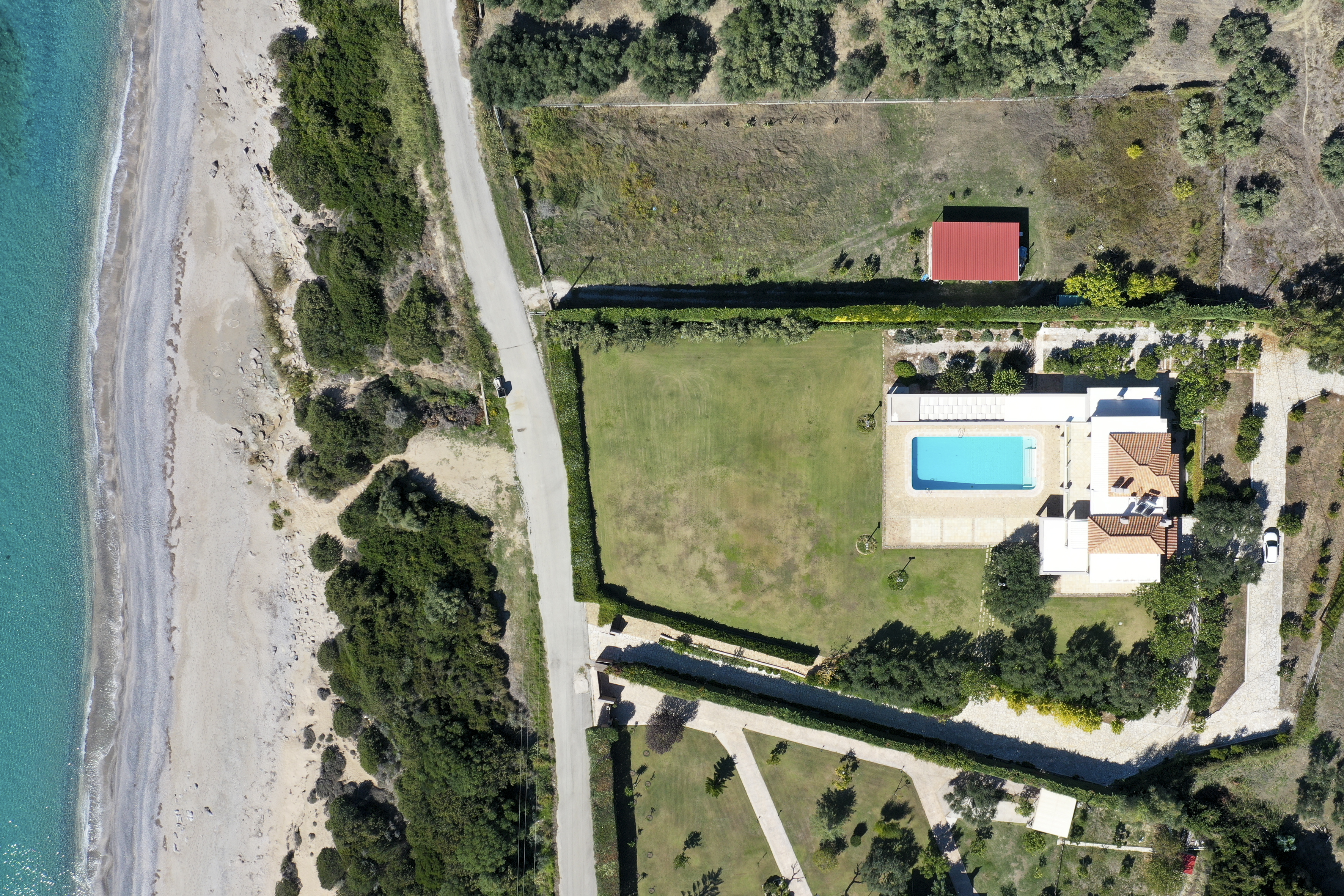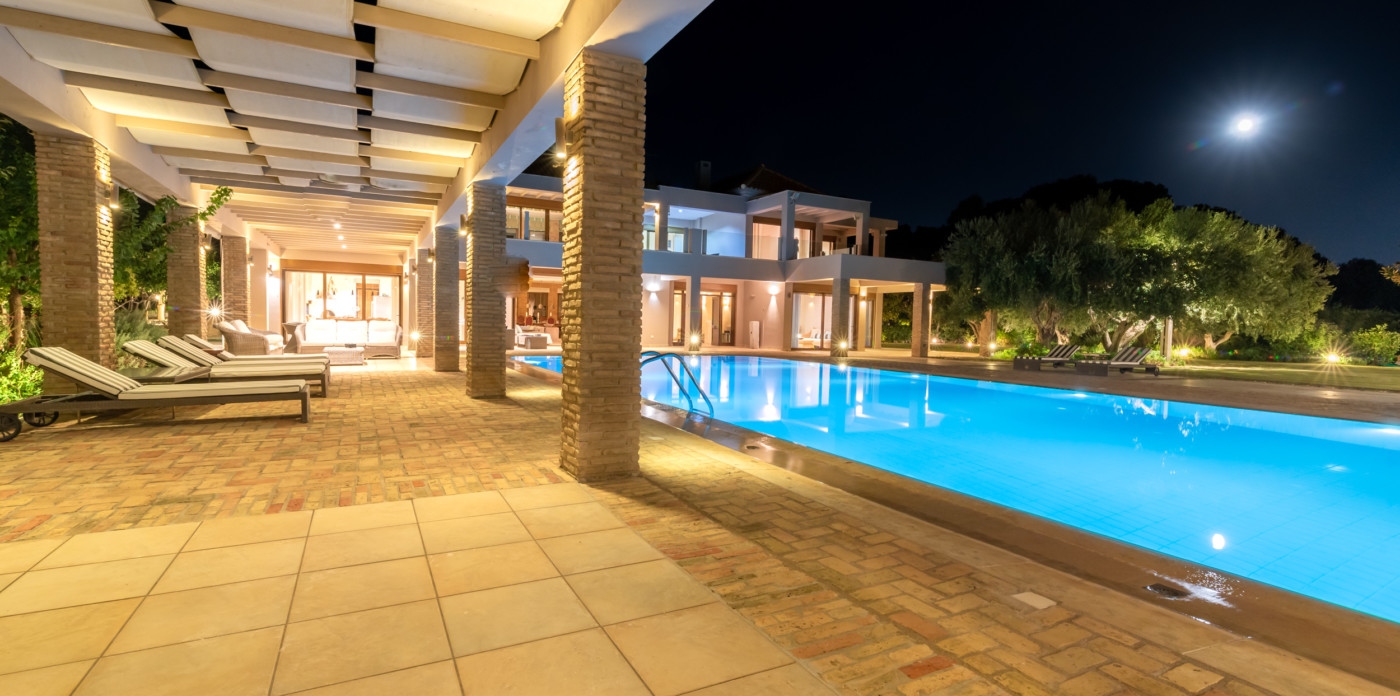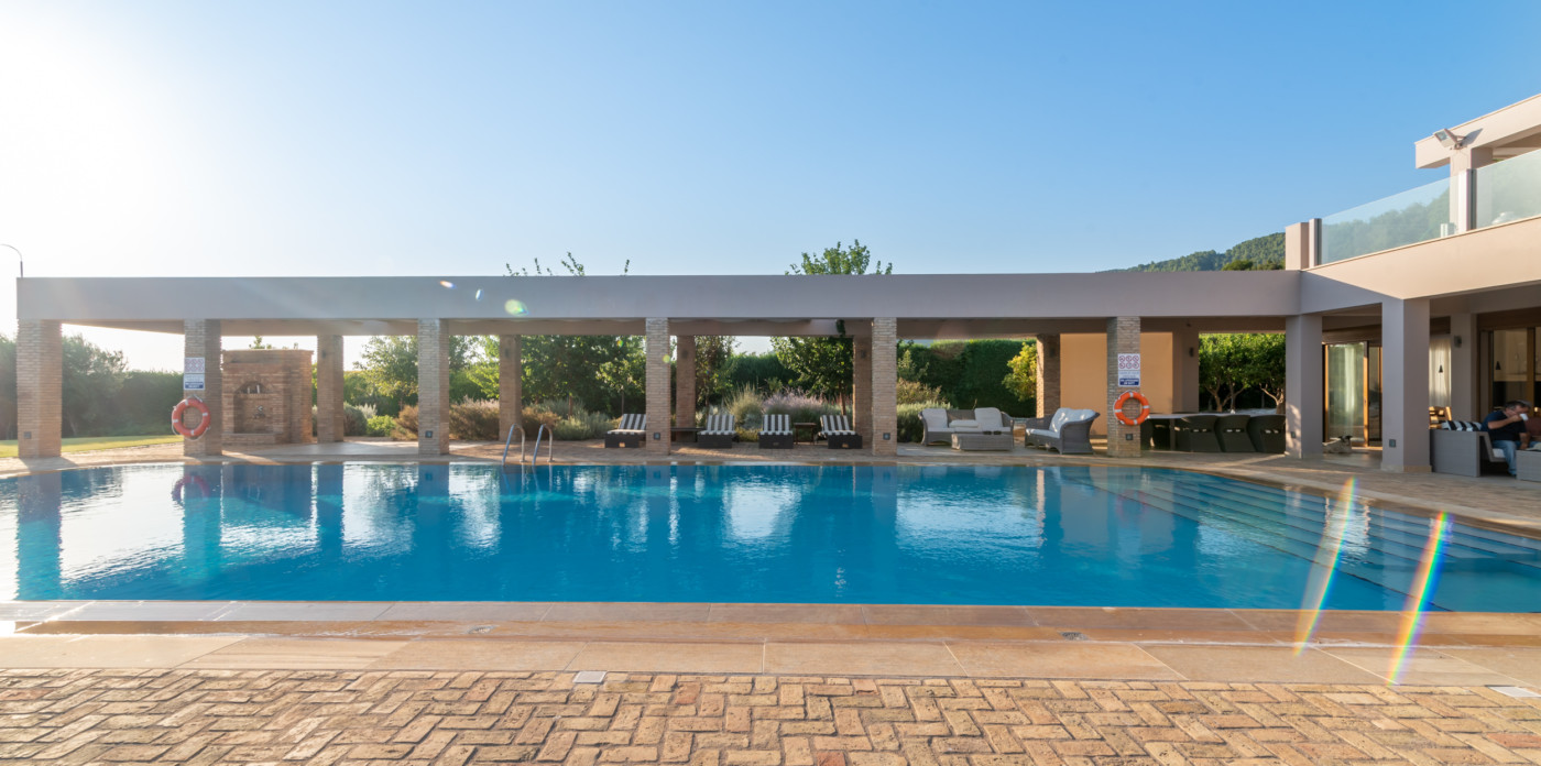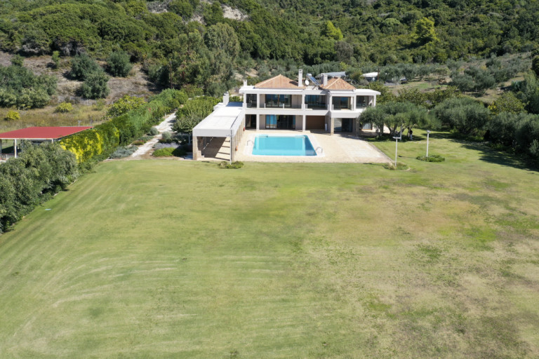 Η πισίνα βρίσκεται μπροστά από τη βίλα και περιβάλλεται από καλοδιατηρημένους κήπους με γκαζόν. Από τη μία πλευρά, ένας καλυμμένος χώρος εκτείνεται σε όλο το μήκος της πισίνας, εξασφαλίζοντας ότι έχετε την επιλογή του ήλιου ή της σκιάς καθ' όλη τη διάρκεια της ημέρας. Η κολύμβηση στην πισίνα είναι ένα υπέροχο μείγμα από το καταπράσινο του κήπου και το λαμπερό μπλε του Ιονίου Πελάγους. Ο χώρος της πισίνας είναι εξοπλισμένος με ξαπλώστρες και υπαίθρια ντους. Οι επισκέπτες μπορούν να περάσουν χαλαρά απογεύματα απολαμβάνοντας τον ήλιο, ενώ απολαμβάνουν το εντυπωσιακό σκηνικό του πράσινου και του γαλάζιου.