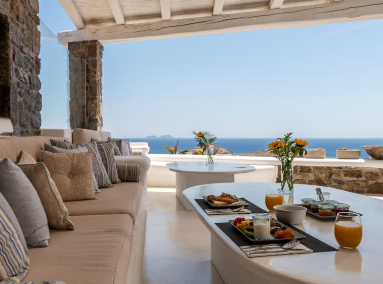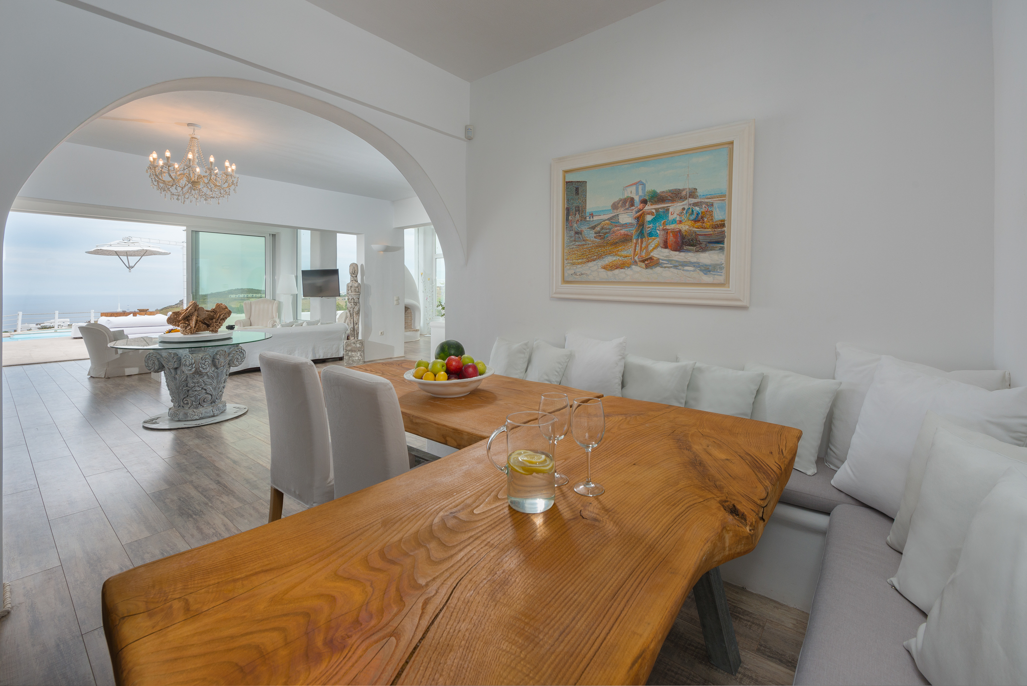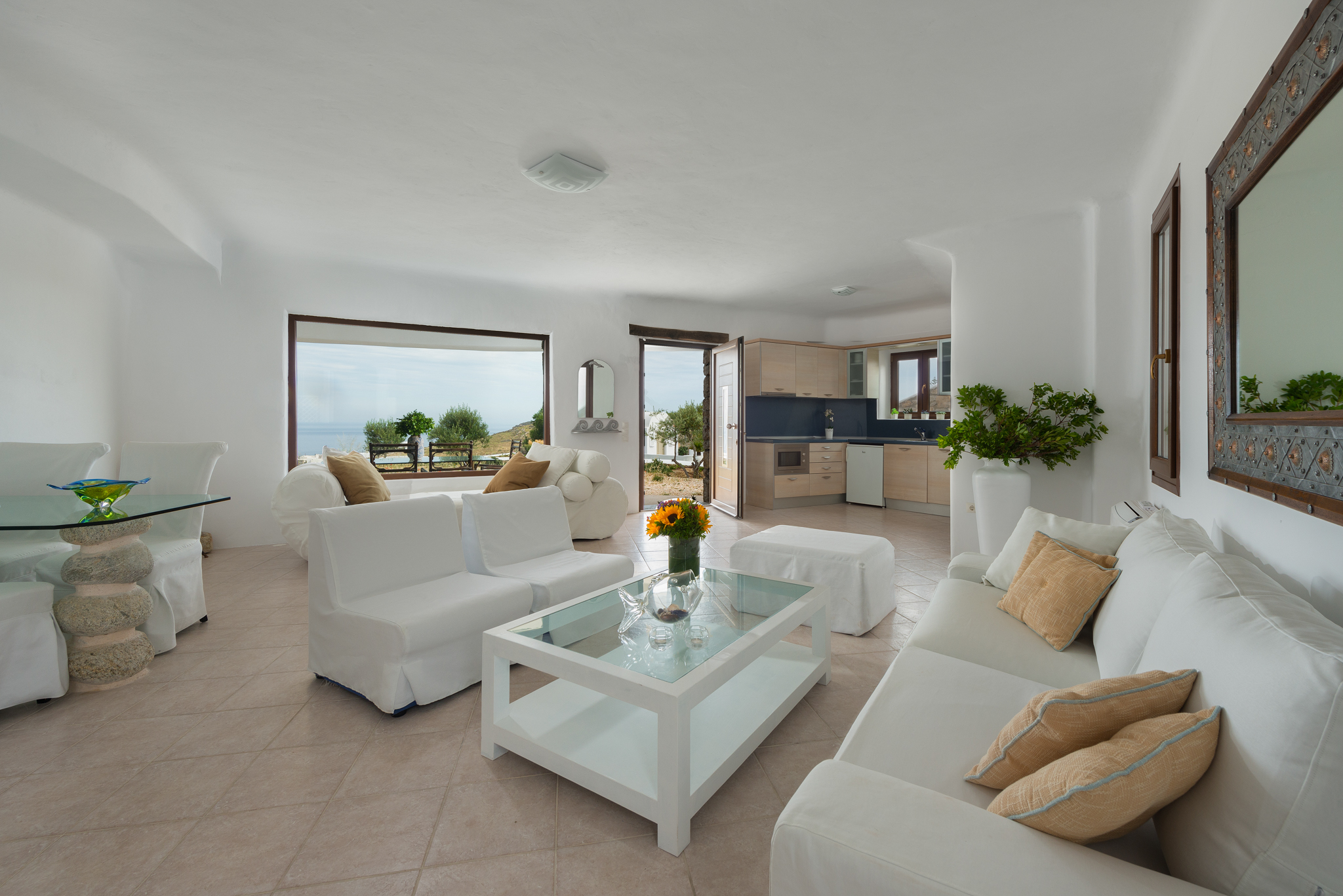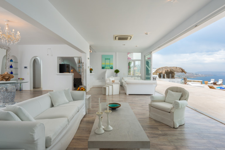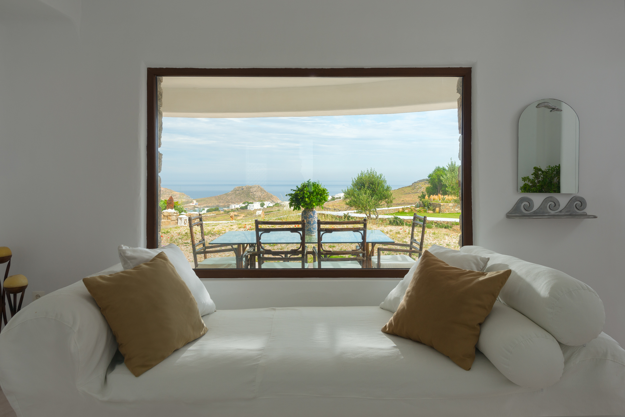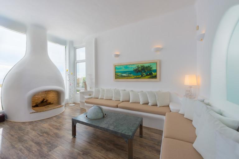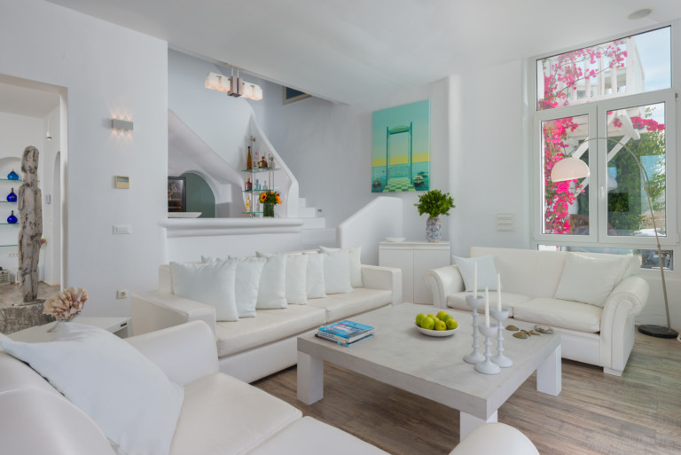 Το μονοχρωματικό λευκό χρώμα στο Aegean Jewel δημιουργεί μια ήρεμη, εκλεπτυσμένη ατμόσφαιρα που ζωντανεύει από την υφή. Στο σαλόνι, το οποίο ανοίγει στη βεράντα μέσω δύο συρόμενων πορτών και προσφέρει εξαιρετική θέα, υπάρχουν δύο παραδοσιακά γλυπτά της Μυκόνου που ζωντανεύουν το παρελθόν.