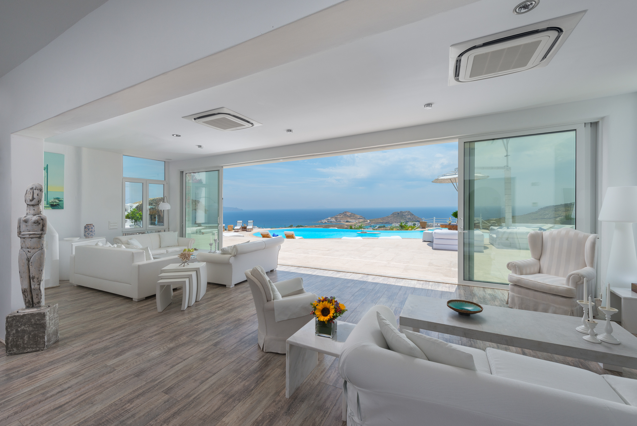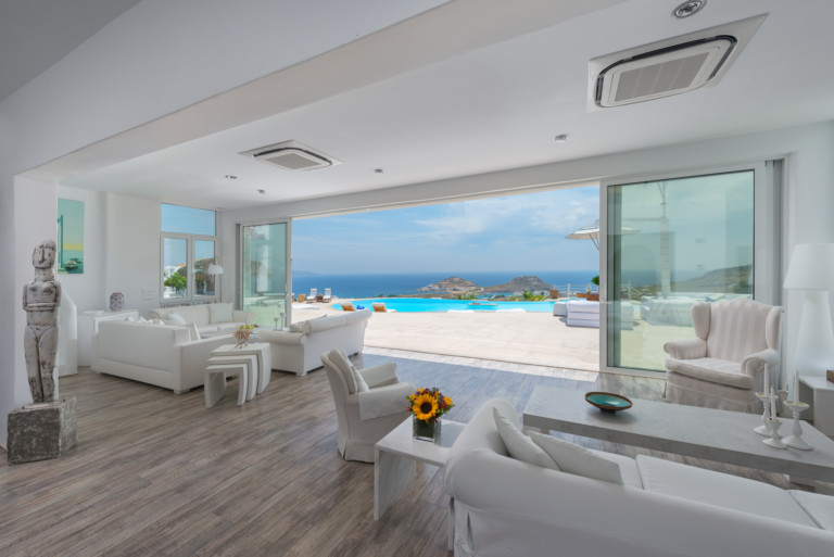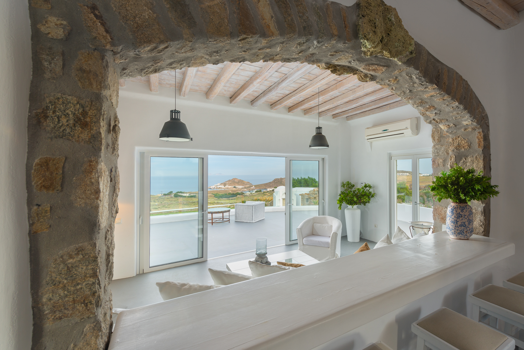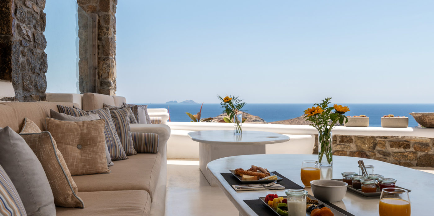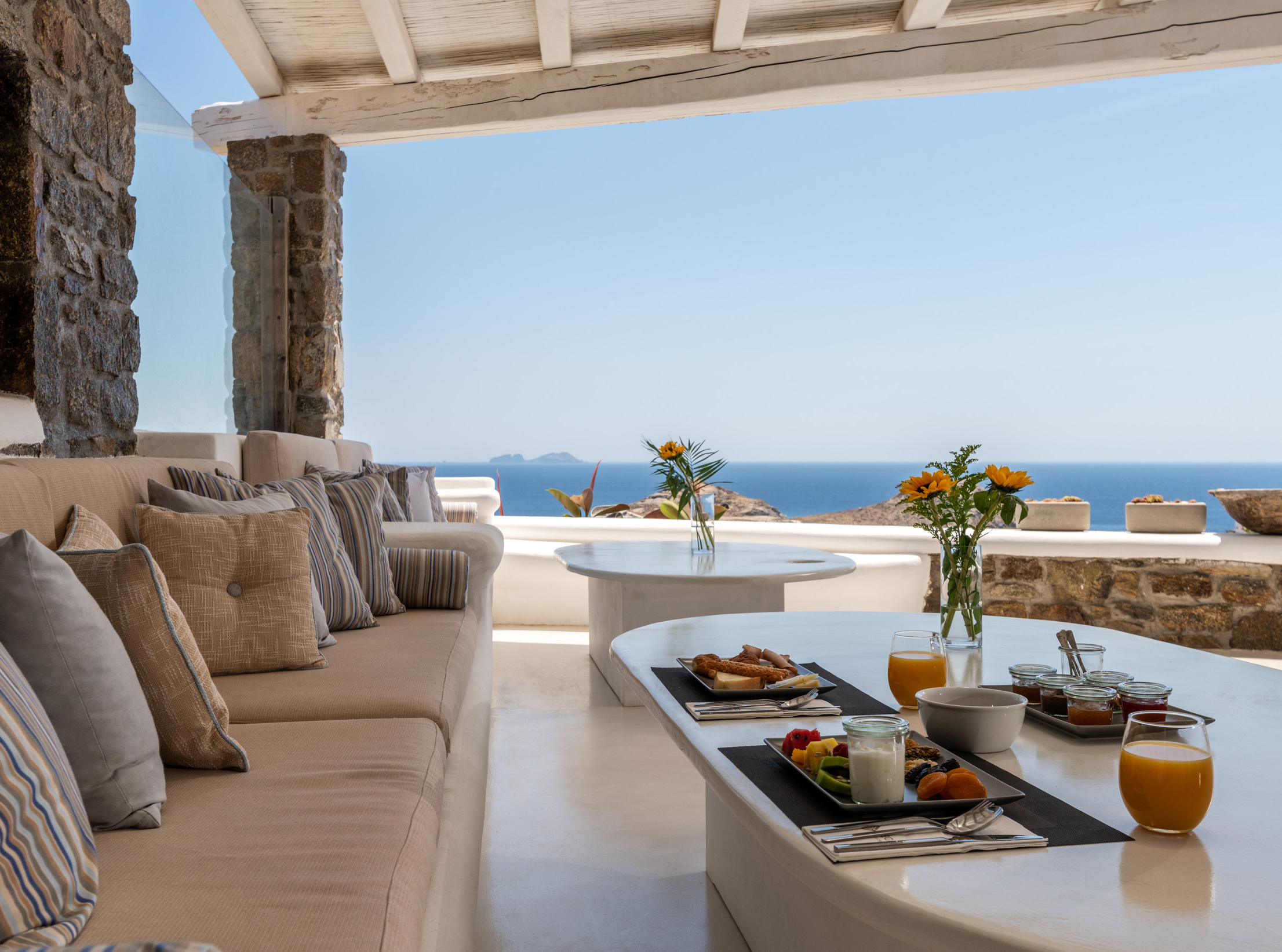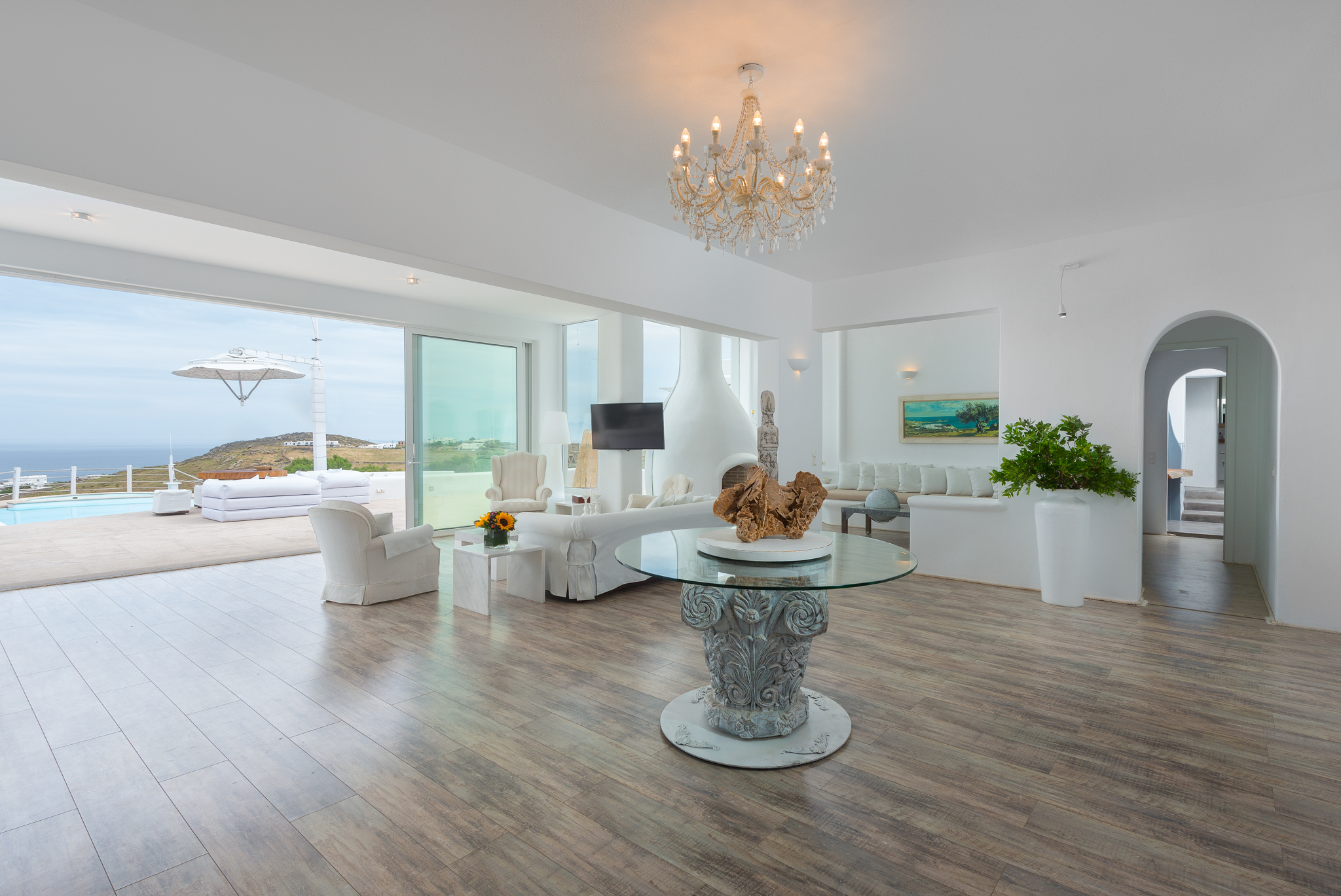 Το μονοχρωματικό λευκό χρώμα στο Aegean Jewel δημιουργεί μια ήρεμη, εκλεπτυσμένη ατμόσφαιρα που ζωντανεύει από την υφή. Στο σαλόνι, το οποίο ανοίγει στη βεράντα μέσω δύο συρόμενων πορτών και προσφέρει εξαιρετική θέα, υπάρχουν δύο παραδοσιακά γλυπτά της Μυκόνου που ζωντανεύουν το παρελθόν.