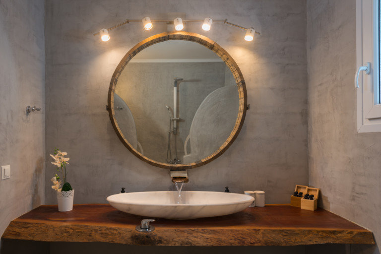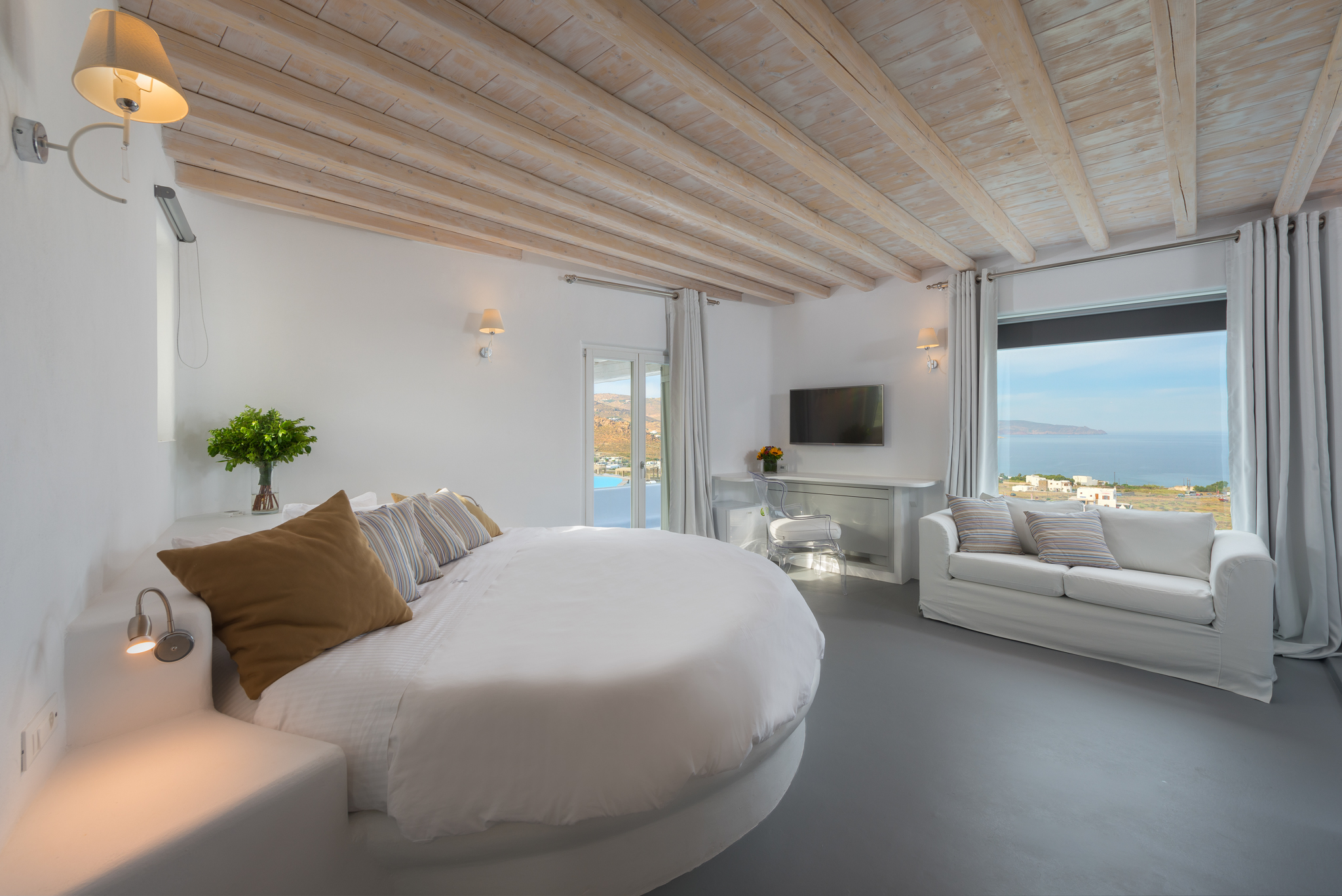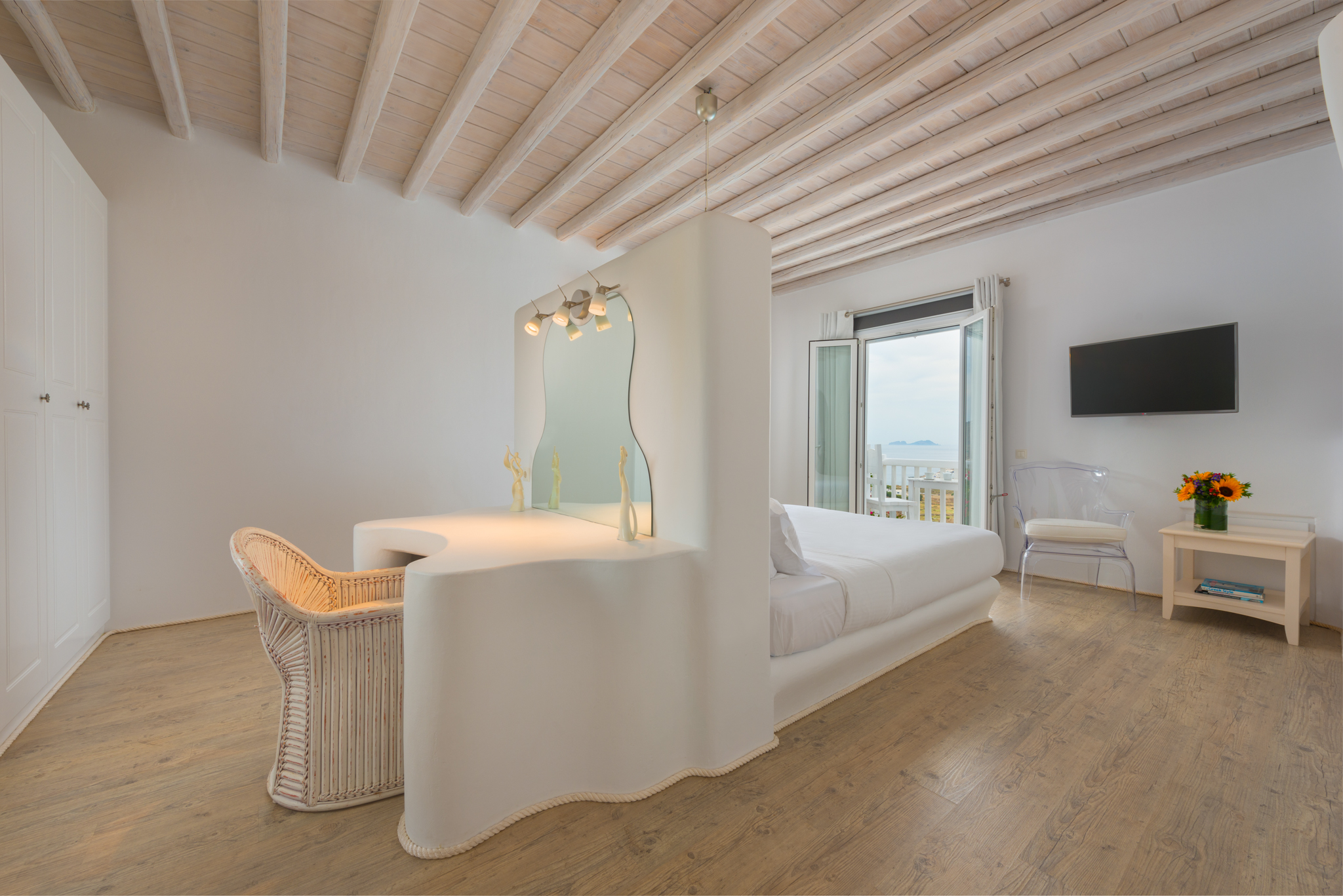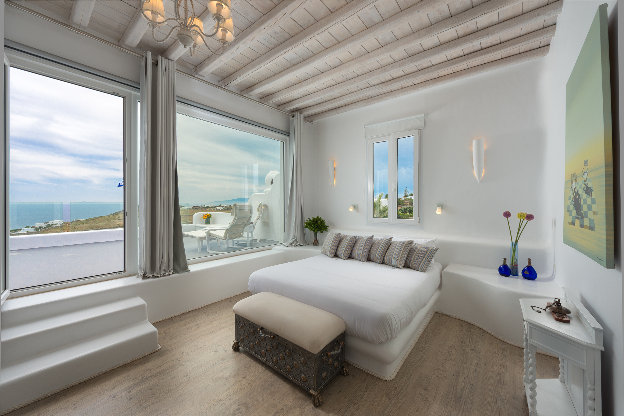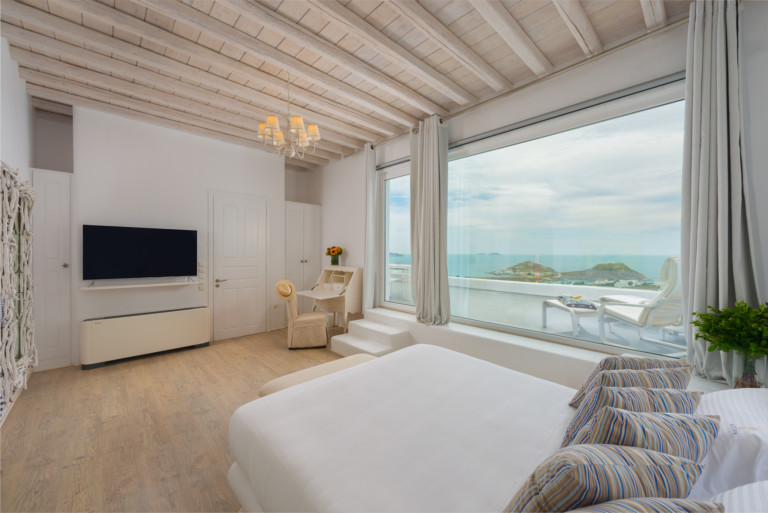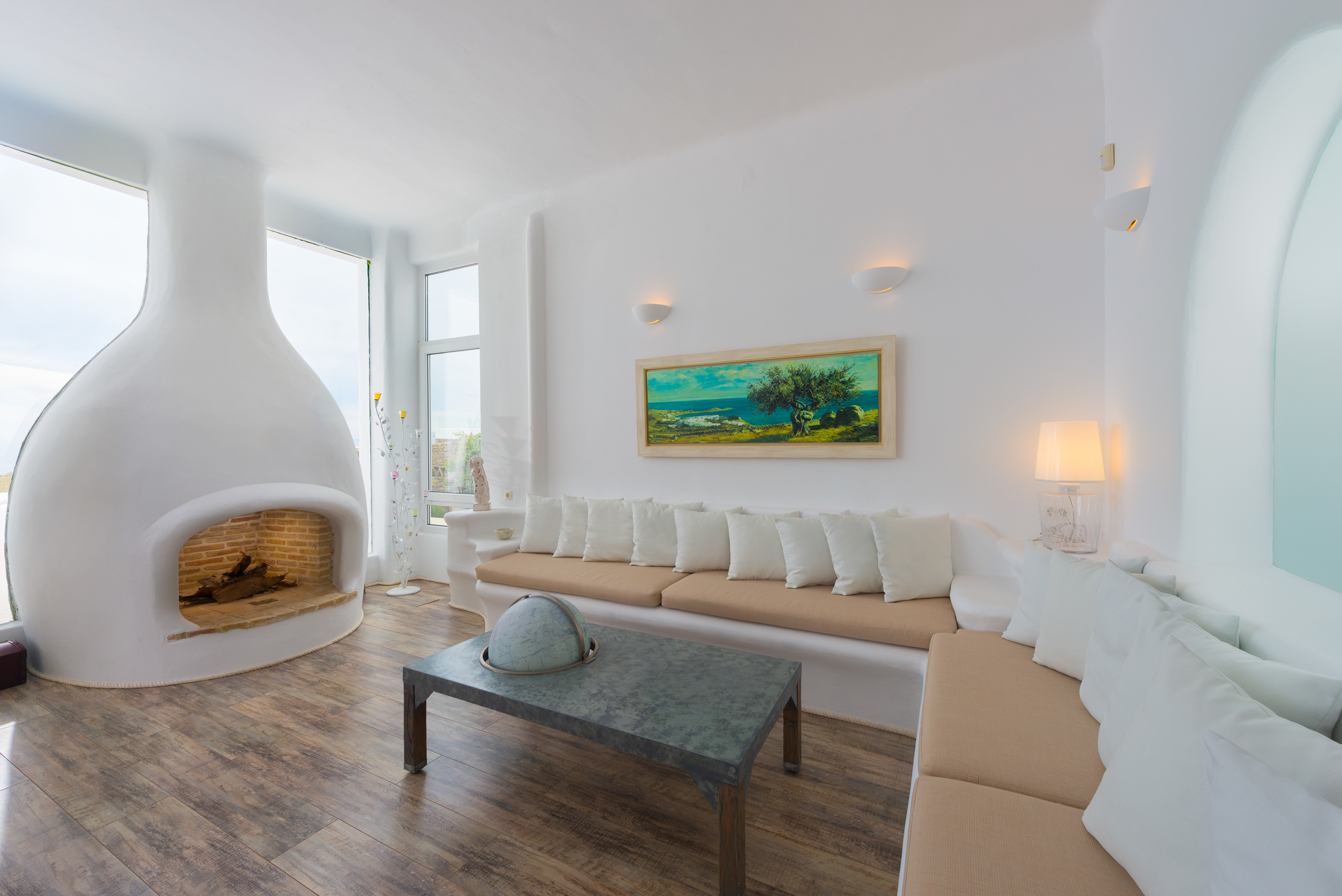 Το μονοχρωματικό λευκό χρώμα στο Aegean Jewel δημιουργεί μια ήρεμη, εκλεπτυσμένη ατμόσφαιρα που ζωντανεύει από την υφή. Στο σαλόνι, το οποίο ανοίγει στη βεράντα μέσω δύο συρόμενων πορτών και προσφέρει εξαιρετική θέα, υπάρχουν δύο παραδοσιακά γλυπτά της Μυκόνου που ζωντανεύουν το παρελθόν.