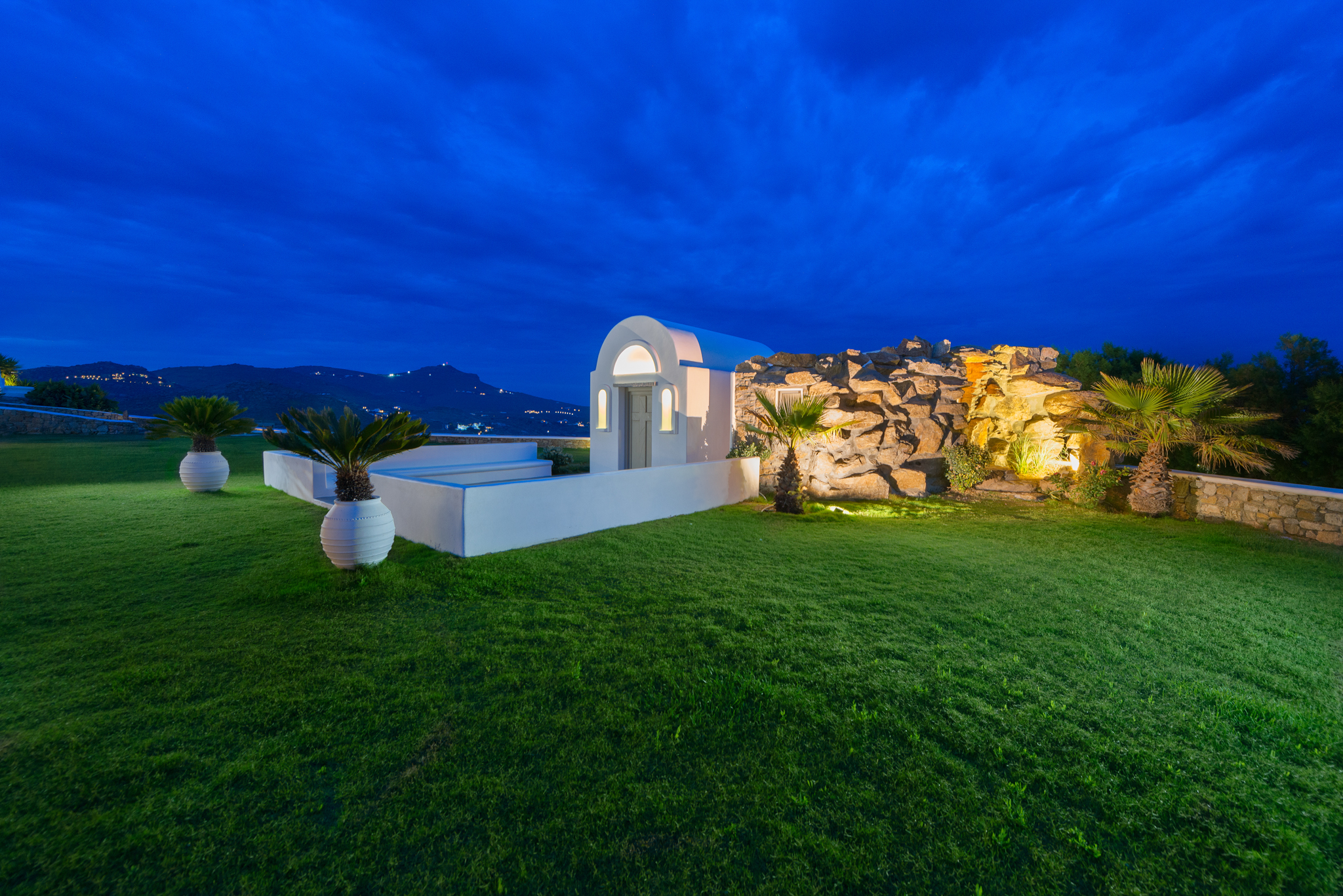Η κομψότητα και η ομορφιά των πολύχρωμων κήπων, οι βραχώδεις βράχοι, η υπέροχη ατμόσφαιρα και η ζαφειρένια θάλασσα της Μυκόνου σε συνδυασμό με τις επαγγελματικές υπηρεσίες πρώτης κατηγορίας δημιουργούν μια μοναδική ατμόσφαιρα για να κάνετε την εκδήλωση ή το γάμο σας στο μινιμαλιστικό παρεκκλήσι Aegean Jewel.
