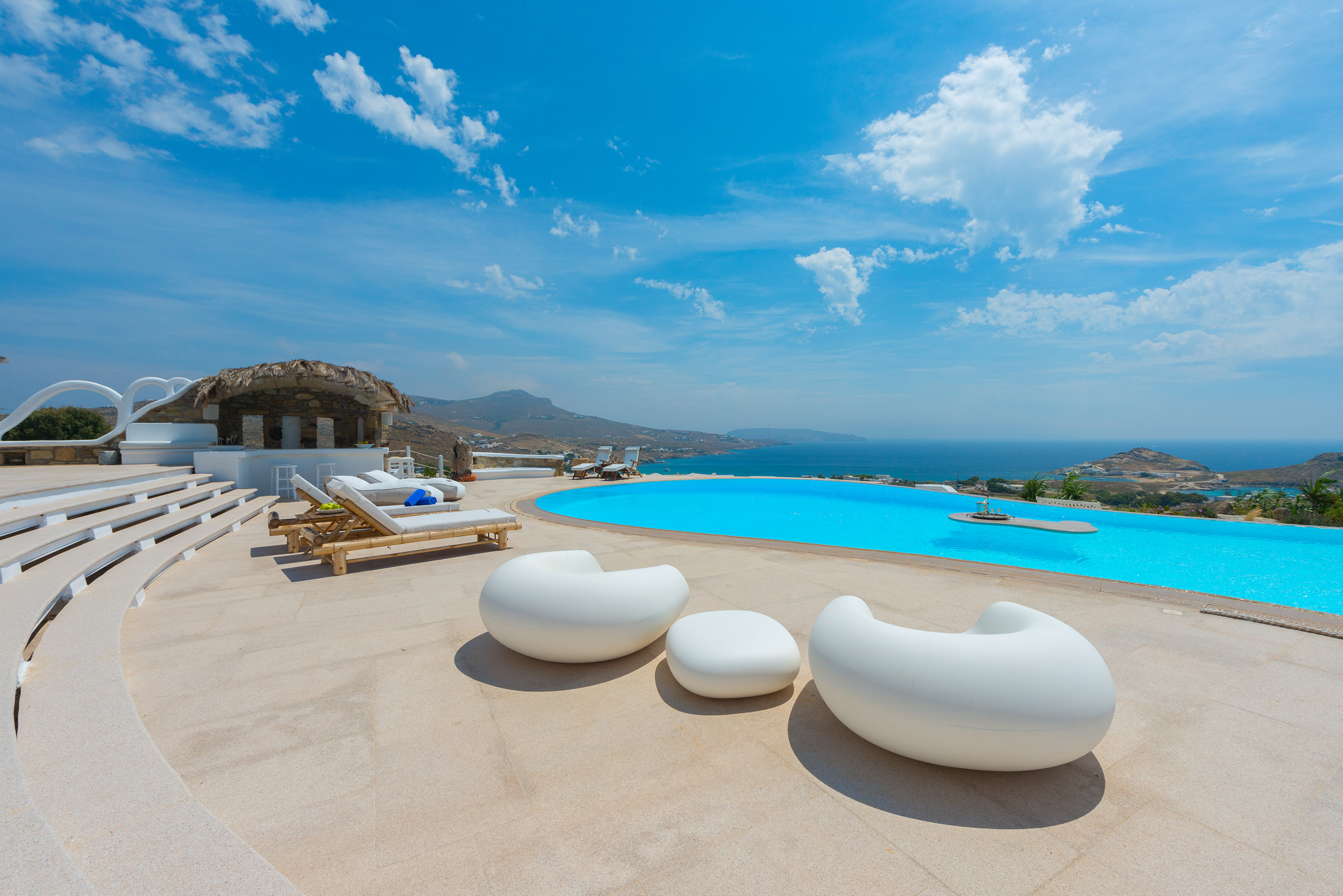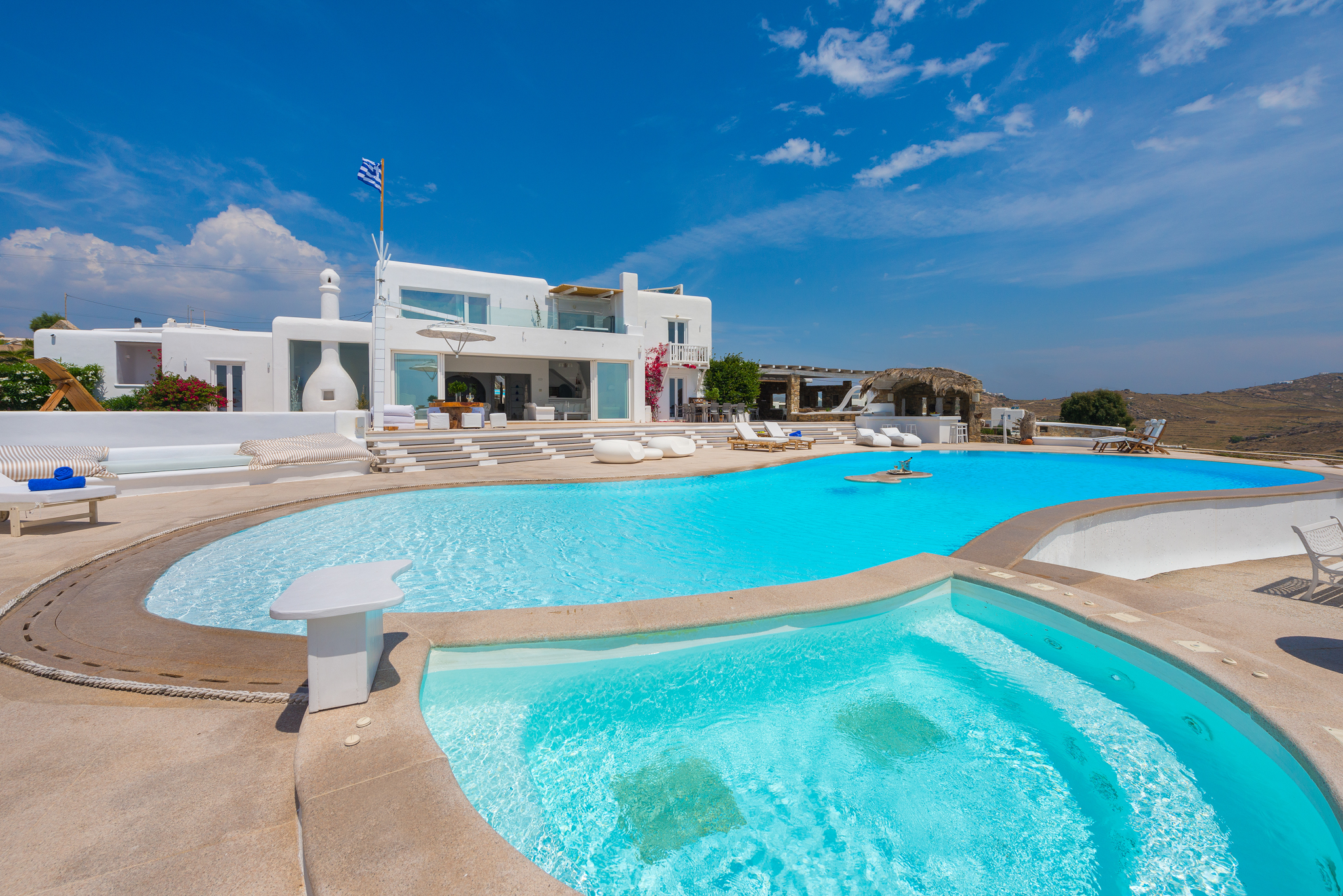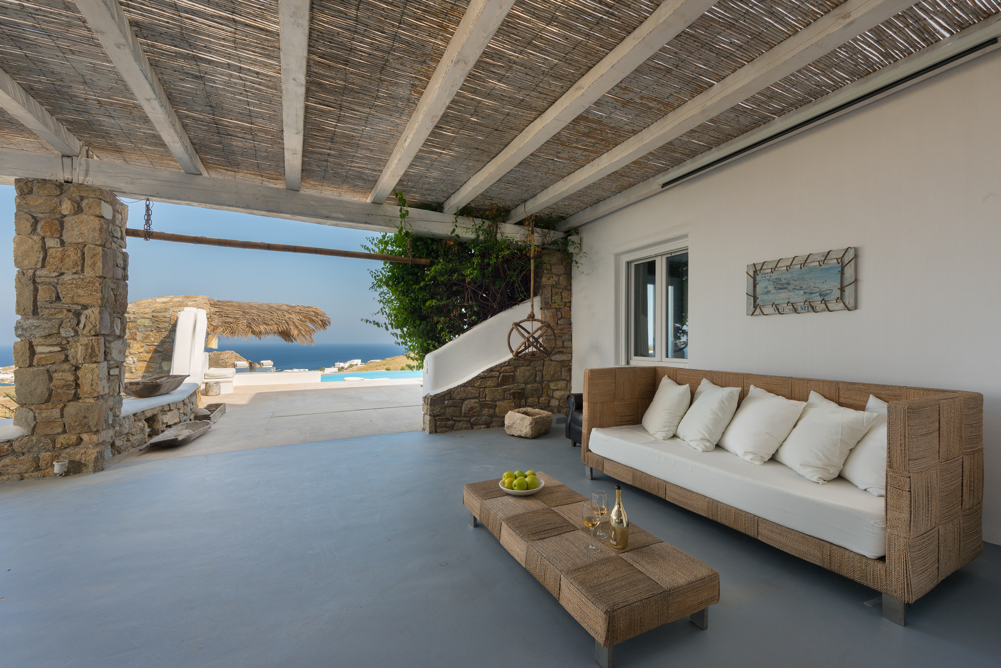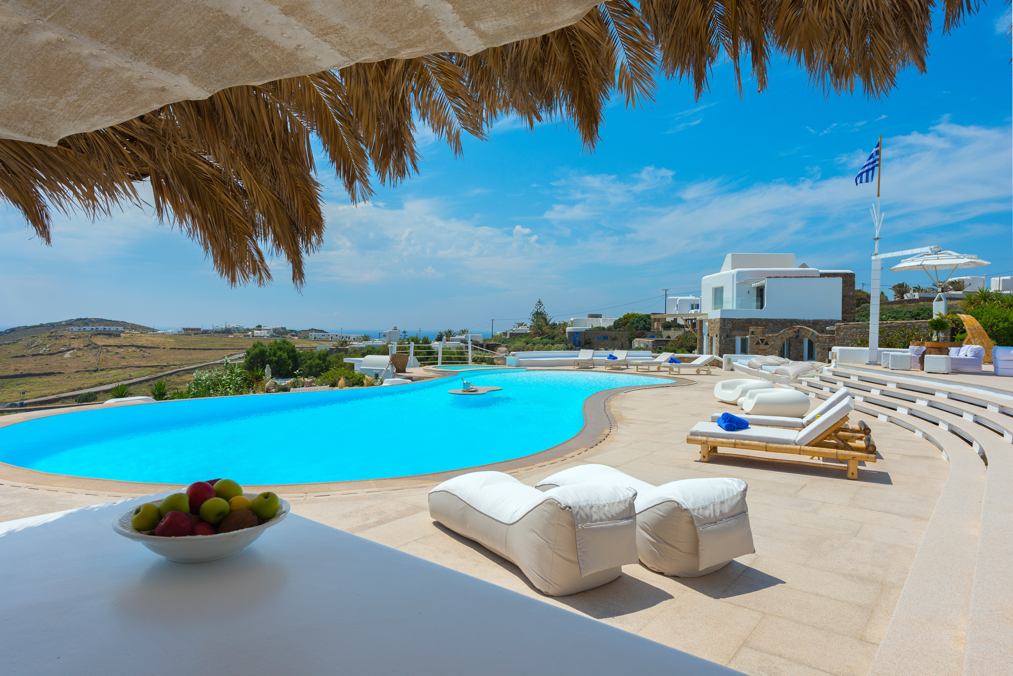 Μπροστά από τη βίλα, μια μεγάλη βεράντα και μια πισίνα υπερχείλισης απλώνονται προς τη θάλασσα, περιτριγυρισμένες από φουτουριστική επίπλωση. Μπορείτε εύκολα να περάσετε τη μέρα σας χαλαρώνοντας στις πολυθρόνες της βεράντας ή εξίσου εύκολα να κάνετε γυμναστική στο σύγχρονο, πλήρως εξοπλισμένο "technogym". Βρείτε μια ανάπαυλα από τη μεσημεριανή ζέστη στο τζακούζι και καθώς ο ήλιος δύει, μαγειρέψτε τοπικά θαλασσινά στο μπάρμπεκιου και απολαύστε την υπαίθρια τραπεζαρία. Για άνεση και ευκολία, το αρχοντικό διαθέτει ελικοδρόμιο, επιχειρηματικό κέντρο και για καθαρή διασκέδαση, διαθέτει επίσης εξοπλισμό για υπαίθριο κινηματογράφο.
