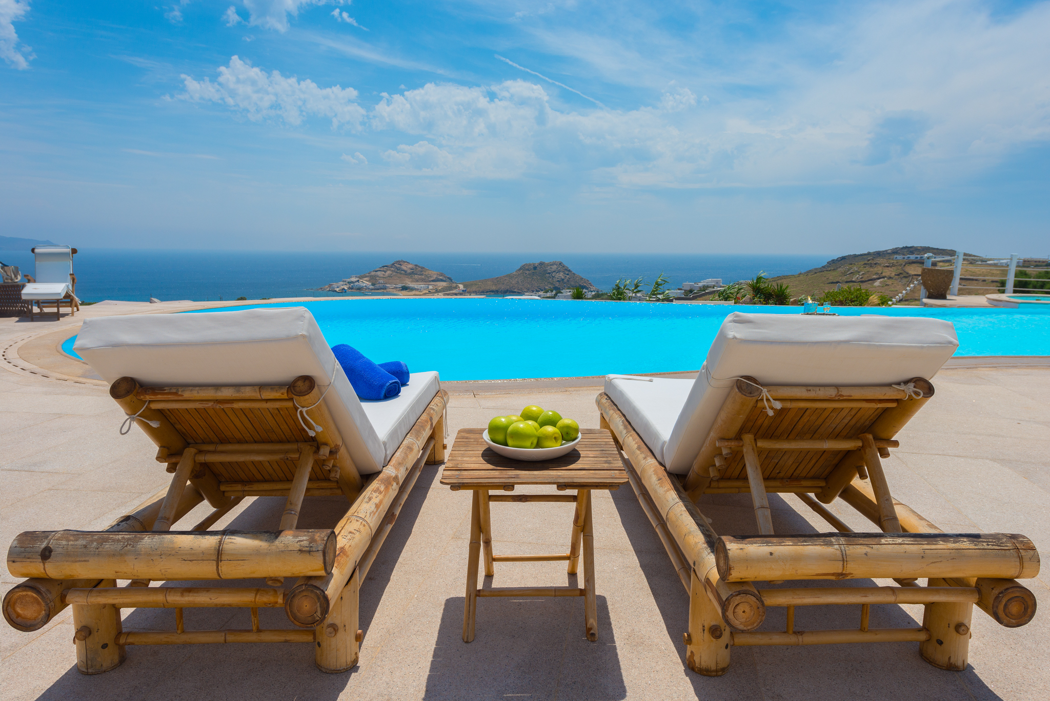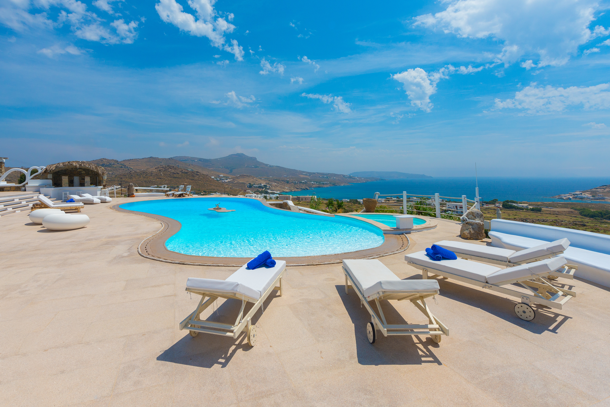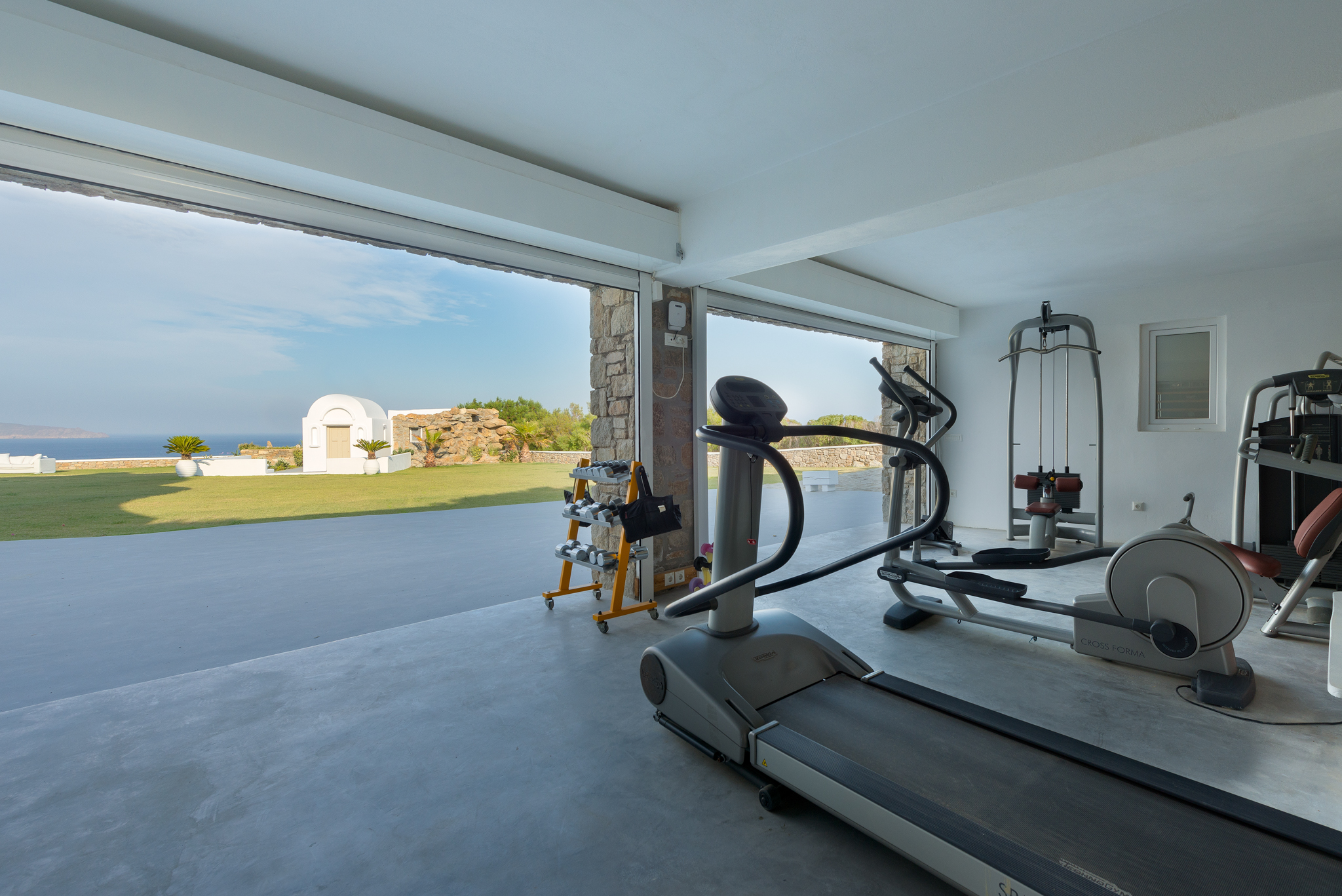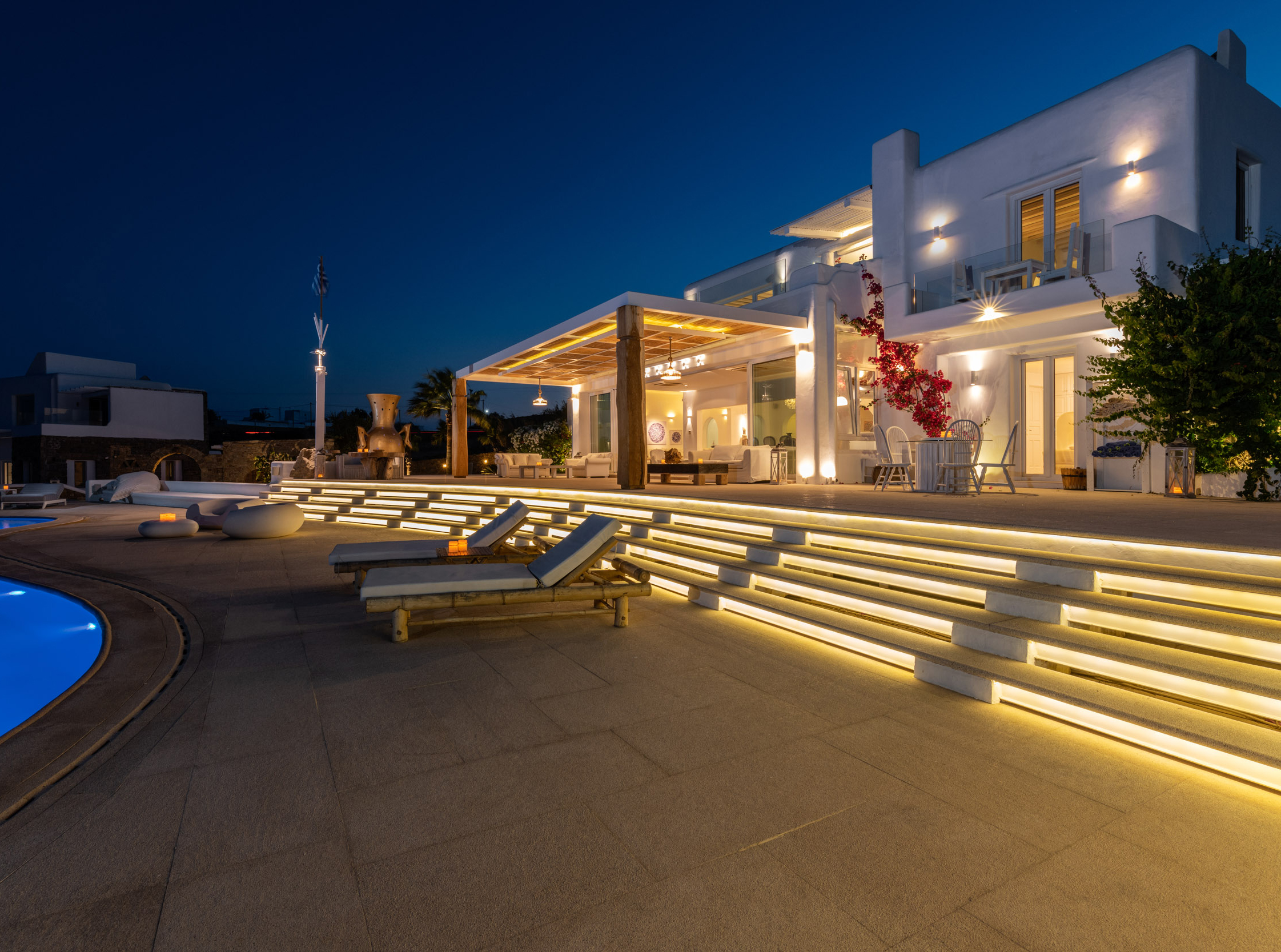Μπροστά από τη βίλα, μια μεγάλη βεράντα και μια πισίνα υπερχείλισης απλώνονται προς τη θάλασσα, περιτριγυρισμένες από φουτουριστική επίπλωση. Μπορείτε εύκολα να περάσετε τη μέρα σας χαλαρώνοντας στις πολυθρόνες της βεράντας ή εξίσου εύκολα να κάνετε γυμναστική στο σύγχρονο, πλήρως εξοπλισμένο "technogym". Βρείτε μια ανάπαυλα από τη μεσημεριανή ζέστη στο τζακούζι και καθώς ο ήλιος δύει, μαγειρέψτε τοπικά θαλασσινά στο μπάρμπεκιου και απολαύστε την υπαίθρια τραπεζαρία. Για άνεση και ευκολία, το αρχοντικό διαθέτει ελικοδρόμιο, επιχειρηματικό κέντρο και για καθαρή διασκέδαση, διαθέτει επίσης εξοπλισμό για υπαίθριο κινηματογράφο.