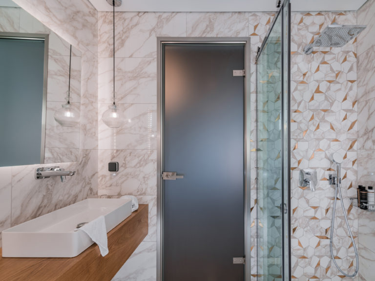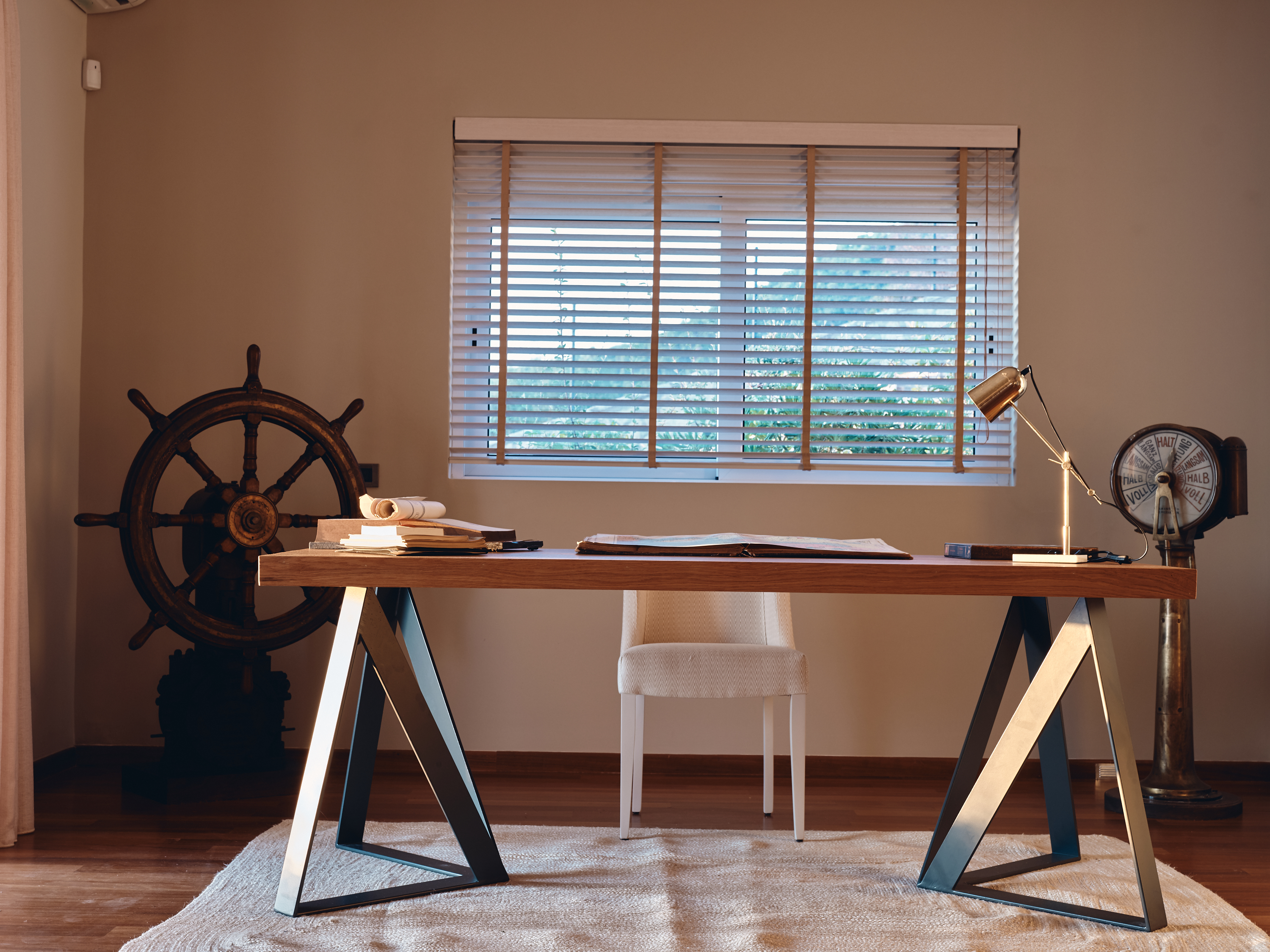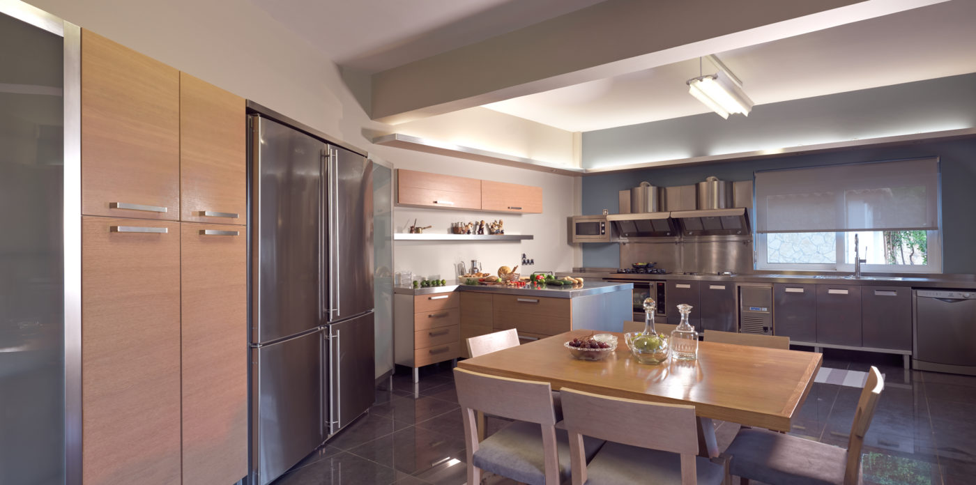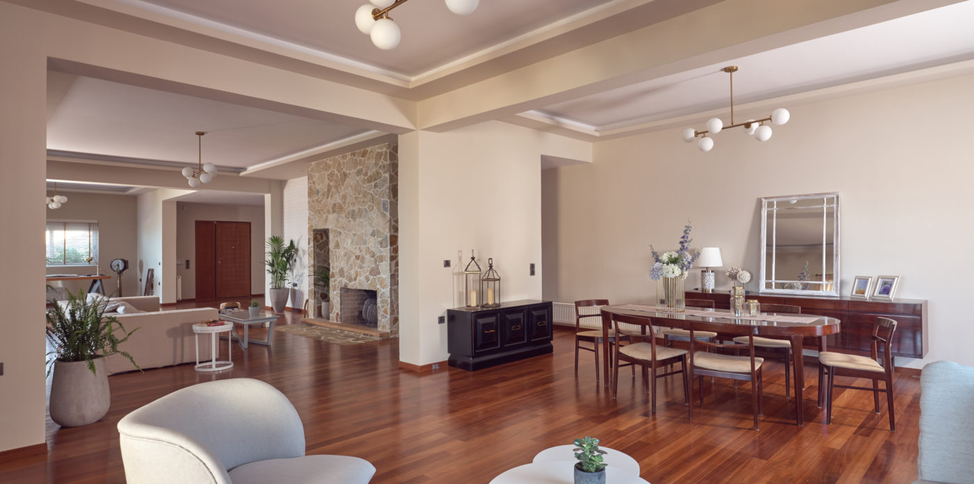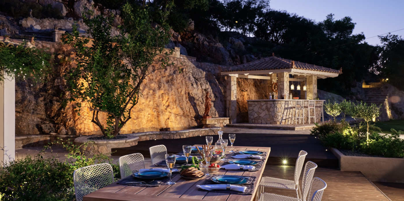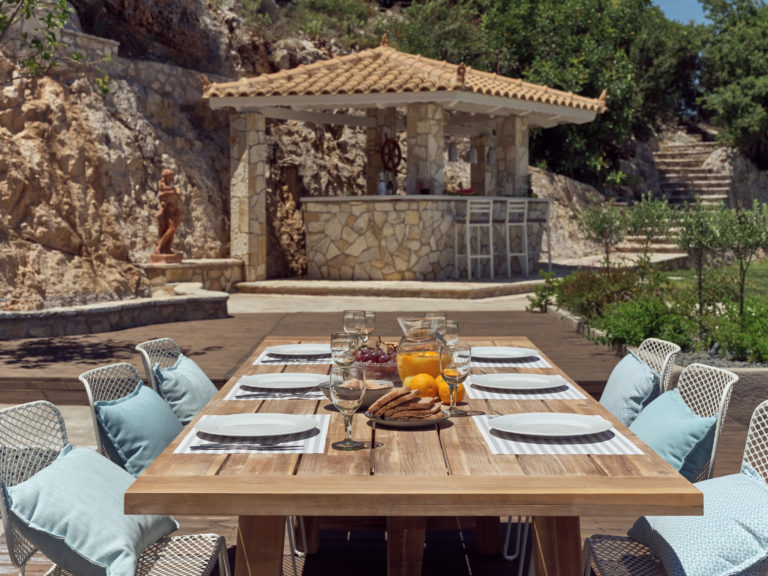 Το ισόγειο που βλέπει προς τη θάλασσα αποτελείται από ένα ευρύχωρο σαλόνι με πέτρινο τζάκι, μια μεγάλη τραπεζαρία, γραφείο, καθιστικό, μια φωτεινή μεγάλη κουζίνα και ένα δωμάτιο επισκεπτών με ιδιωτικό μπάνιο.