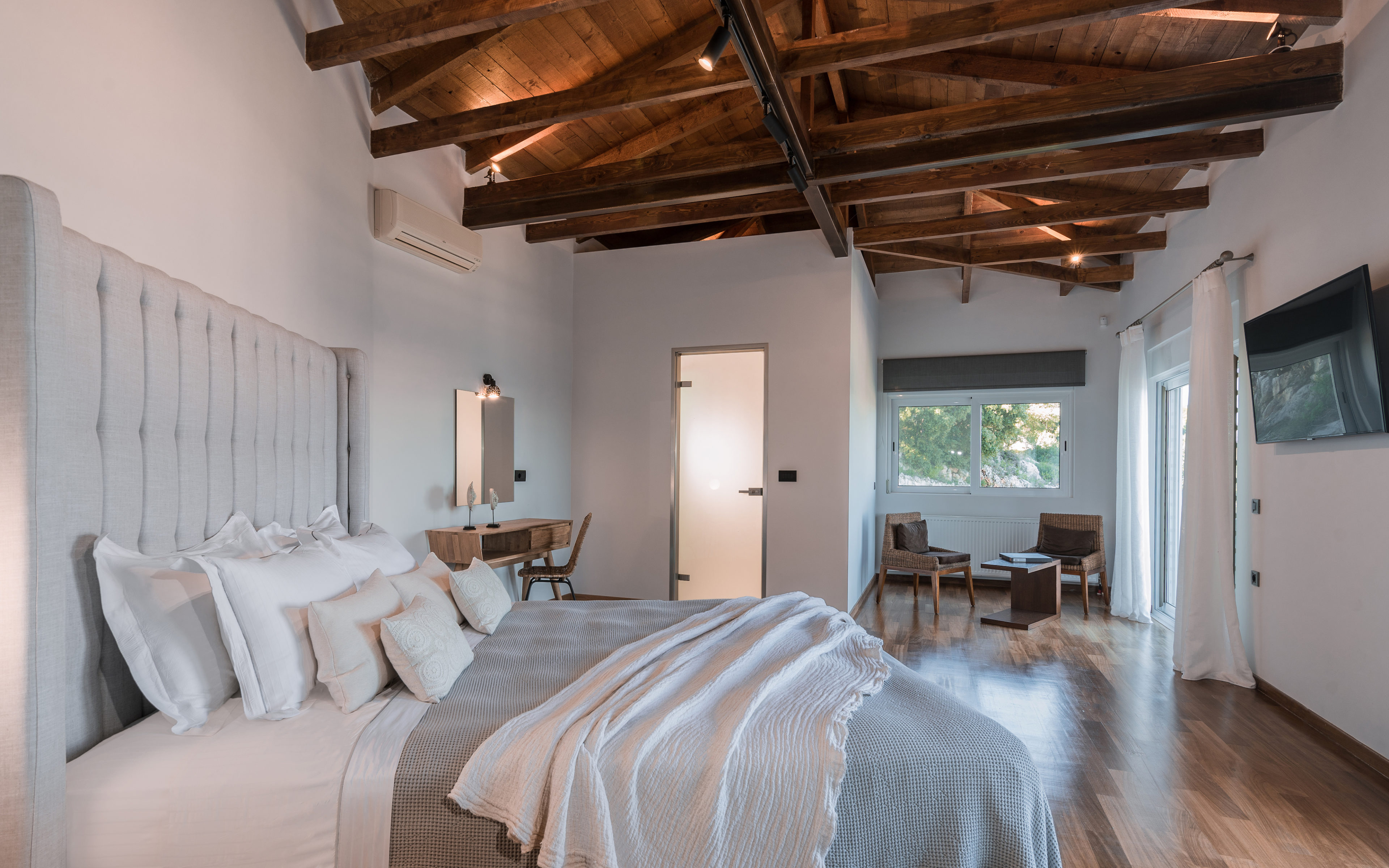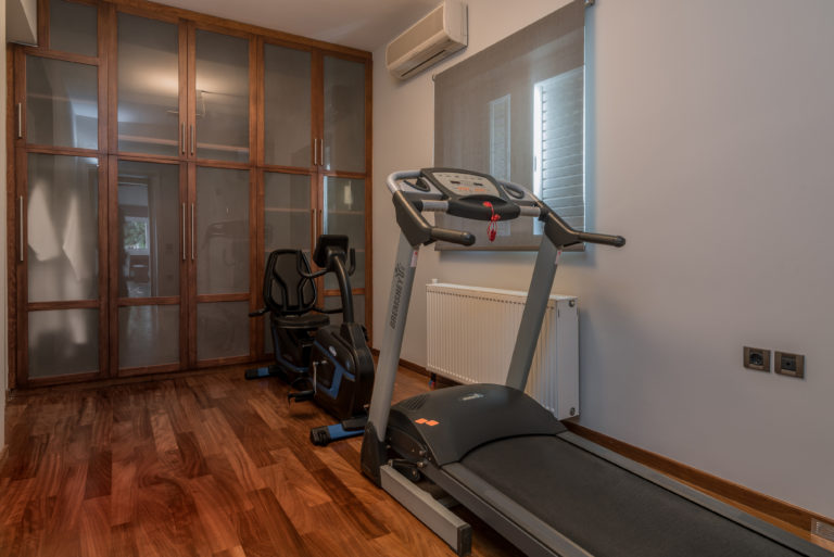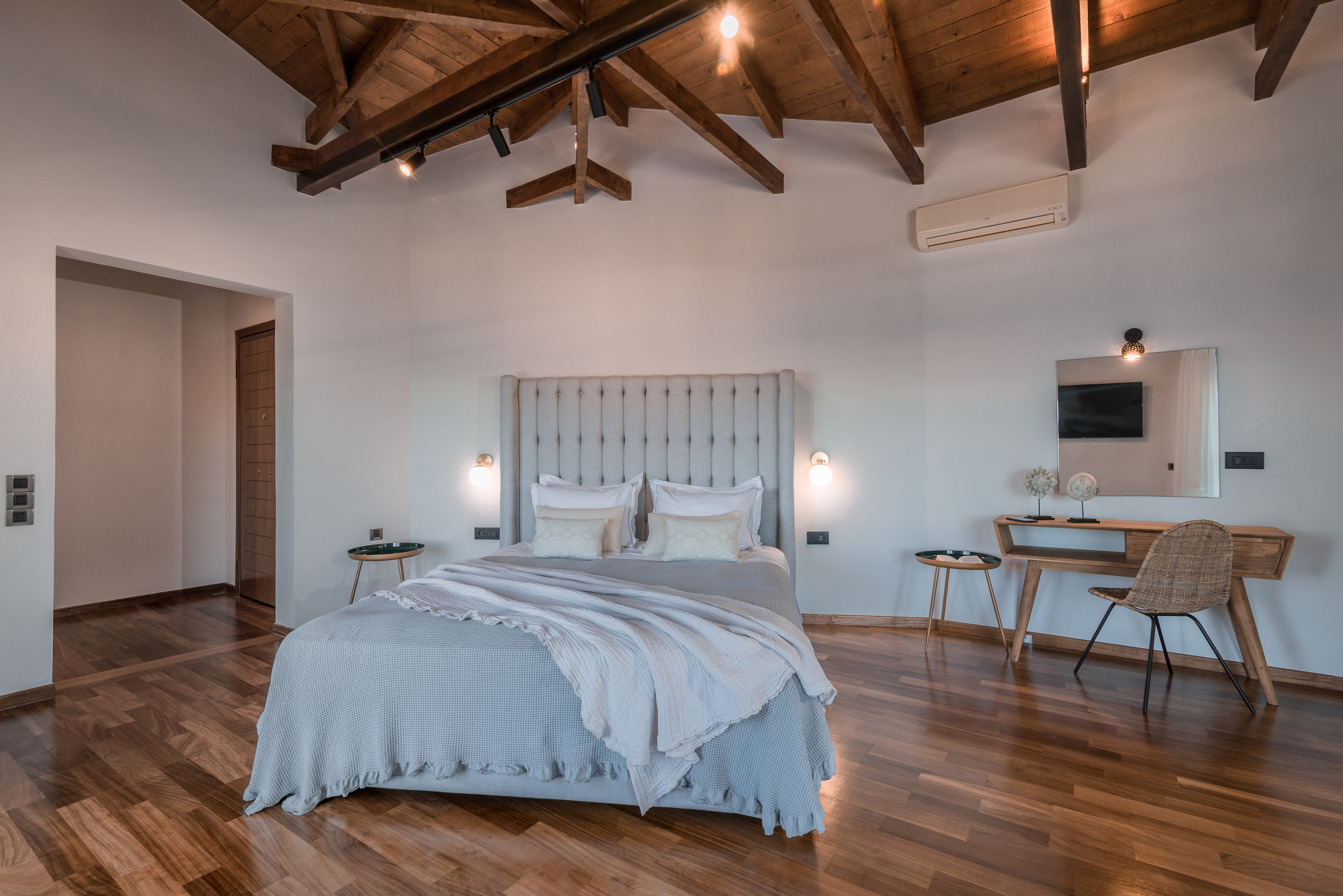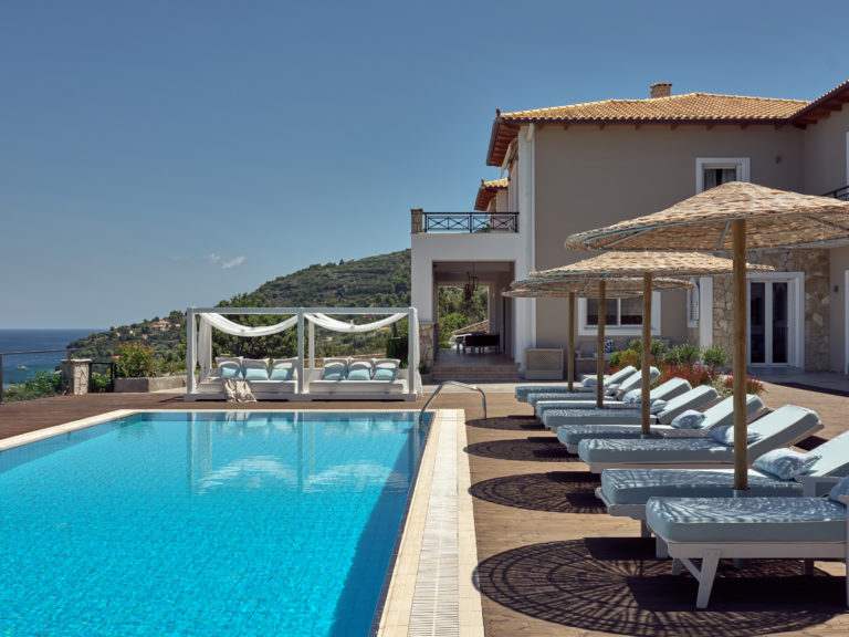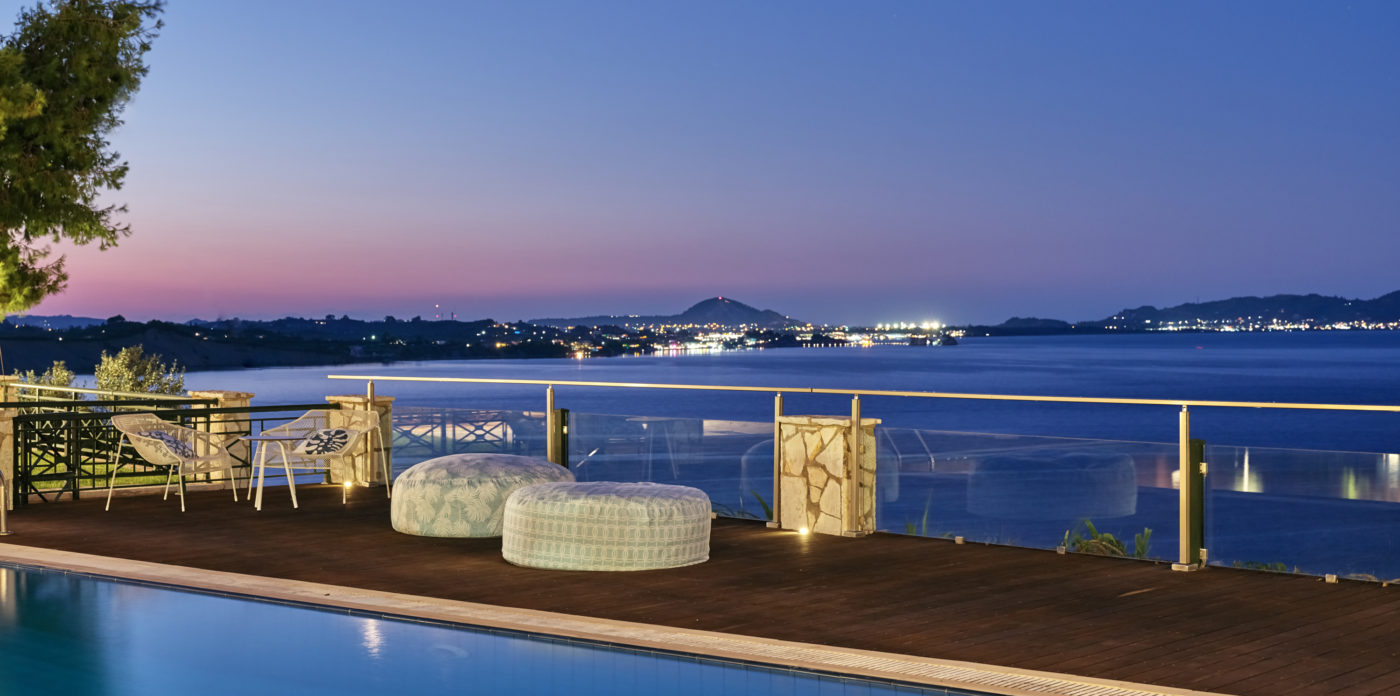 Ο επάνω όροφος αποτελείται από πέντε δωμάτια επισκεπτών, το ένα με τζάκι. Τρία από αυτά έχουν en suite μπάνια εξοπλισμένα με τζακούζι, γυναικείο μπουντουάρ, ιδιωτικό playroom (multi gym, ποδήλατο, και ροζ τραπέζι pong και πίνακας βελάκια). Όλα τα υπνοδωμάτια βγαίνουν σε μεγάλες βεράντες που προσφέρουν φανταστική θέα στον κόλπο του Λαγανά και στο νησί Μαραθονήσι (θαλάσσιο πάρκο για την κατοίκηση της προστατευόμενης θαλάσσιας χελώνας Caretta-Caretta) και μέχρι την Πελοπόννησο.