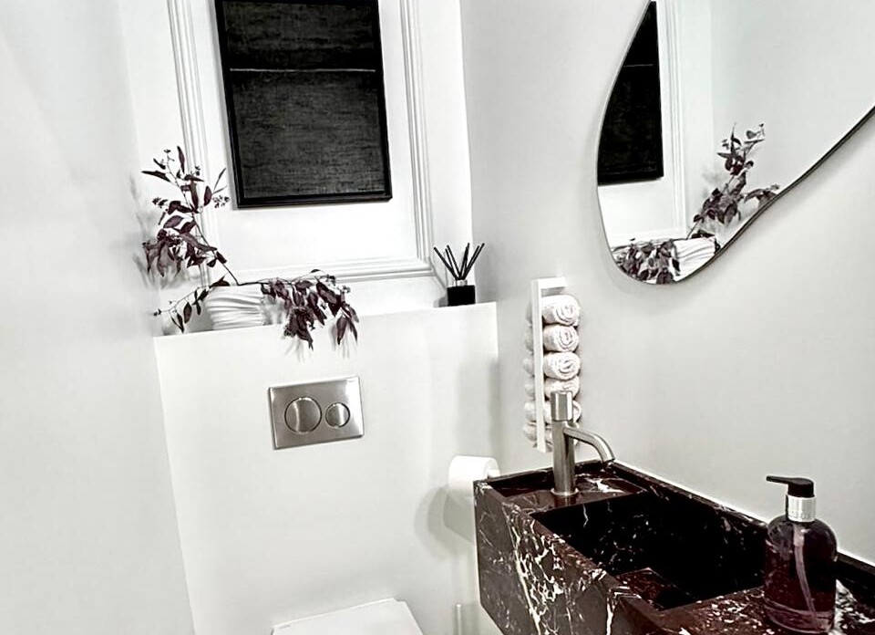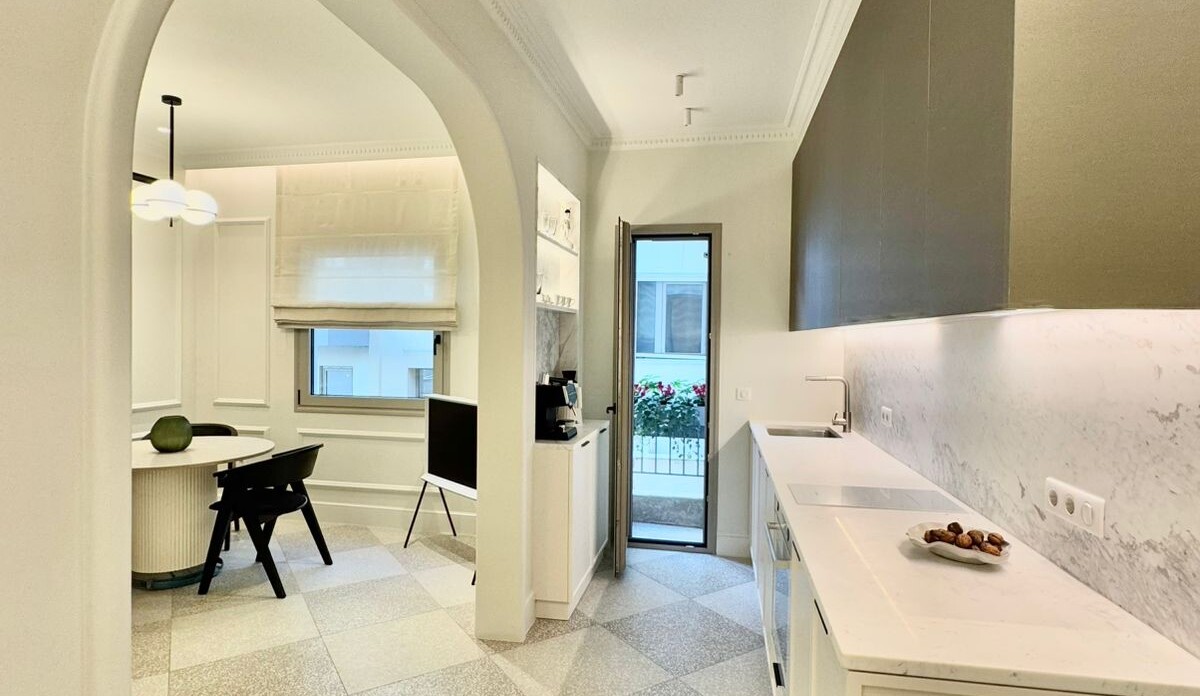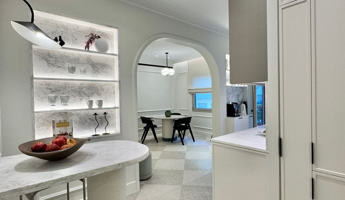 Ο συνολικός σχεδιασμός συνδυάζει κλασικά στοιχεία, όπως τα περίπλοκα διακοσμητικά στοιχεία με μοντέρνες πινελιές, όπως τα κομψά ντουλάπια και οι συσκευές από ανοξείδωτο ατσάλι. Αυτή η αρμονική ισορροπία κλασικής και σύγχρονης πολυτέλειας δημιουργεί μια υψηλή αισθητική, μεγιστοποιώντας την αίσθηση του χώρου και του φωτός.