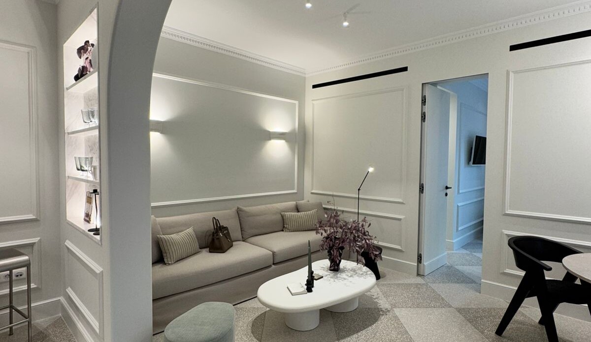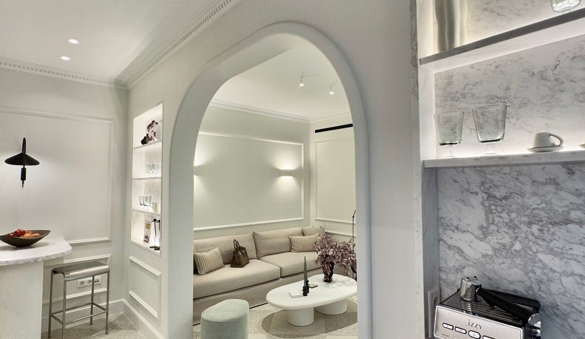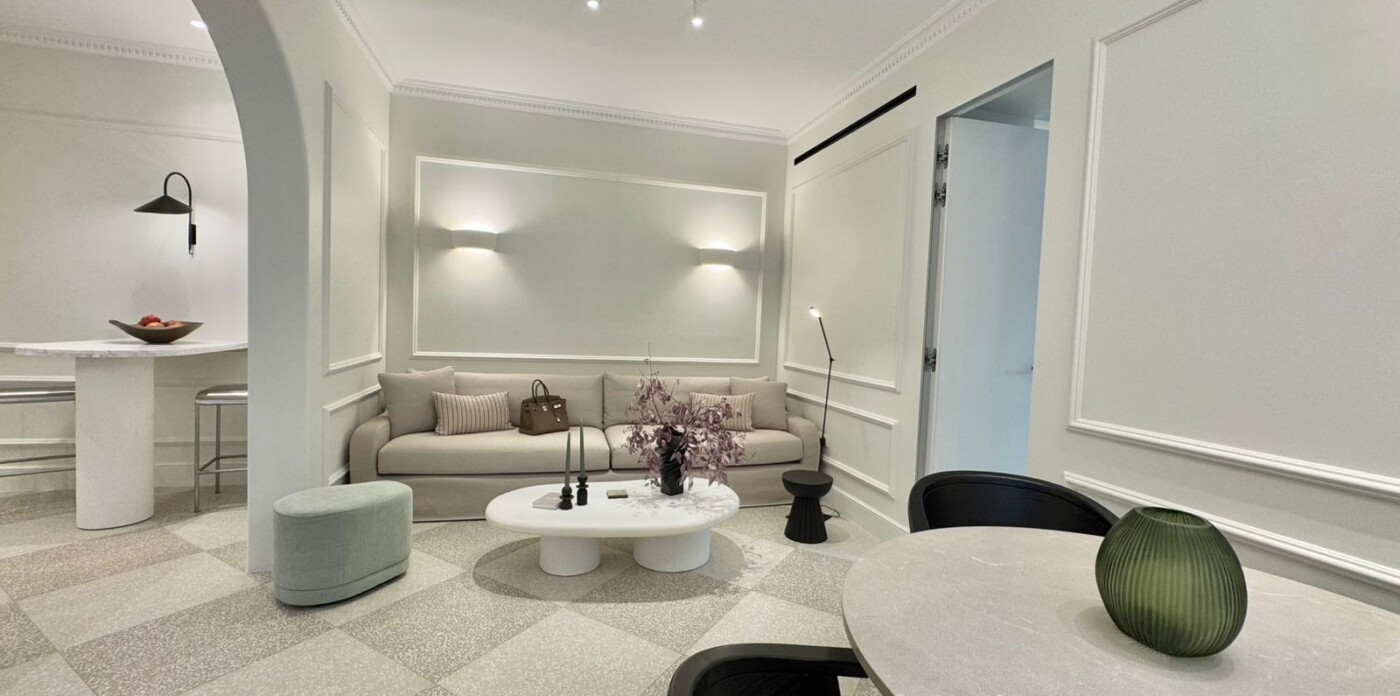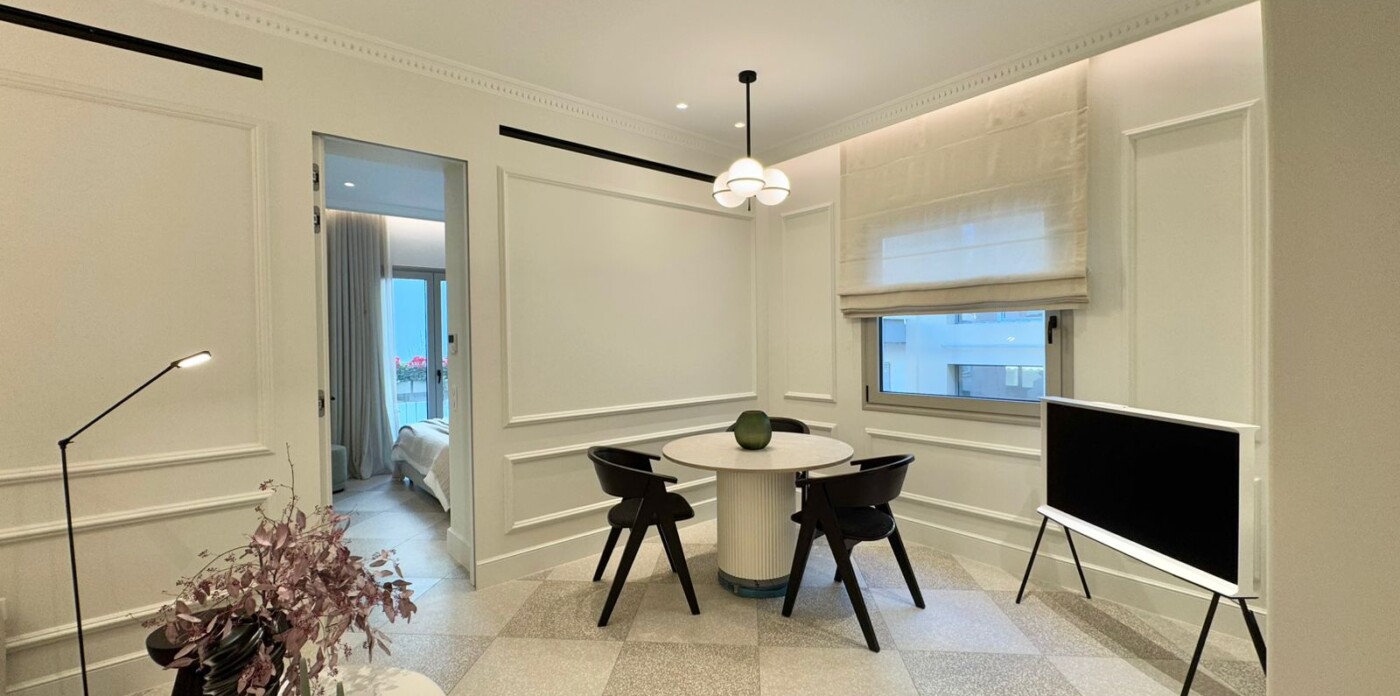 Το ολοκαίνουργιο διαμέρισμα προσφέρει μια γαλήνια όαση με τον κομψό και μινιμαλιστικό εσωτερικό σχεδιασμό του, που χαρακτηρίζεται από μια απαλή ουδέτερη χρωματική παλέτα λευκών, κρεμ και γκρι χρωμάτων. Τα υλικά και τα φινιρίσματα υψηλής ποιότητας είναι εμφανή, όπως το δάπεδο από τεράτζο, τα προσαρμοσμένα καλούπια τοίχων και τα φωτιστικά σώματα σχεδιαστών που δημιουργούν μια εκλεπτυσμένη ατμόσφαιρα.