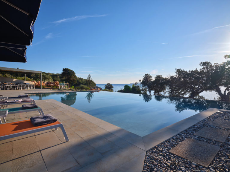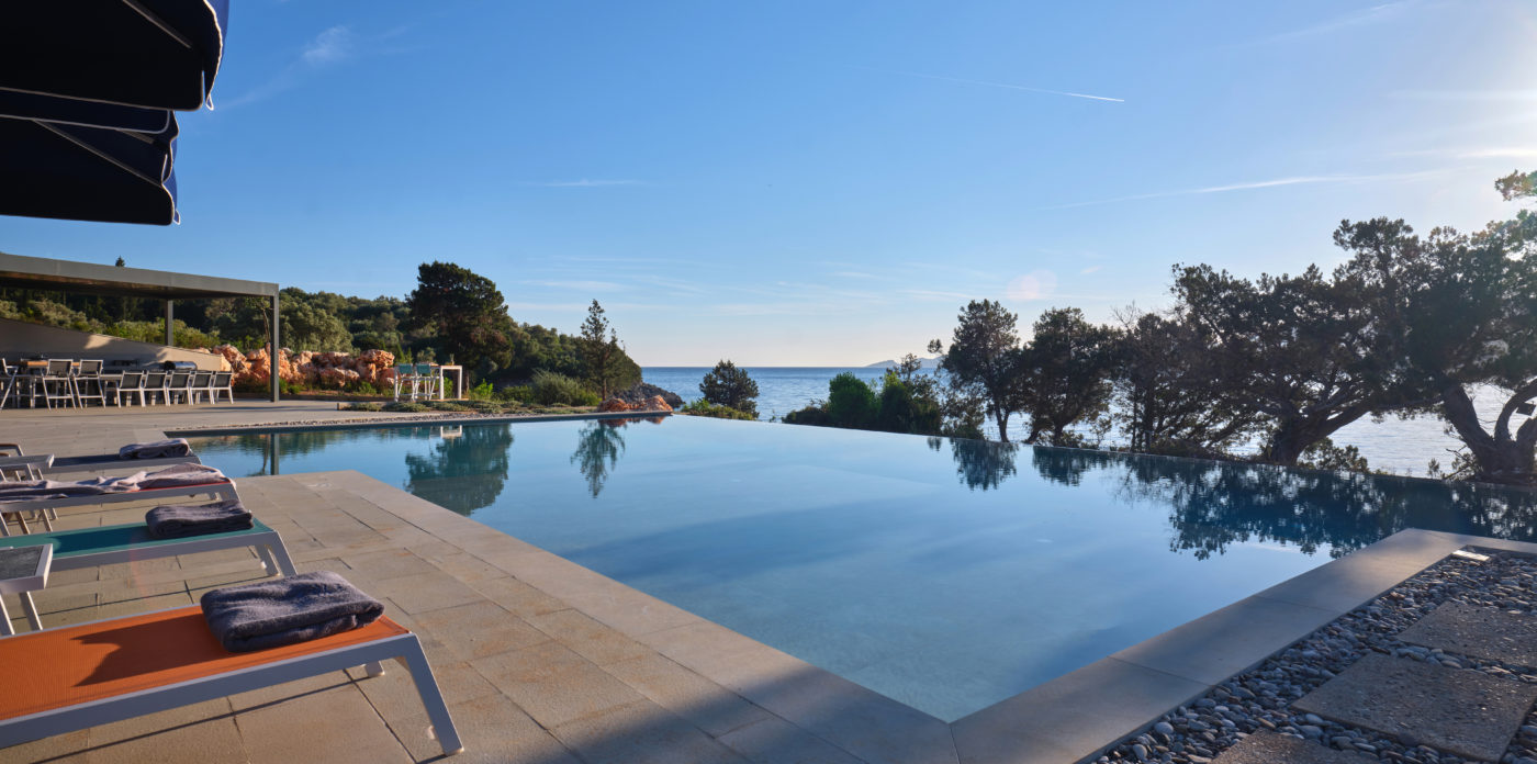 Στον εξωτερικό χώρο της βίλας θα απολαύσετε τα πολύχρωμα έπιπλα που δημιουργούν μια ζεστή, φιλόξενη και ζωντανή ατμόσφαιρα. Κορυφαία σημεία: η πισίνα υπερχείλισης (116m2), μήκους 20 μέτρων, με περιοχή ρηχών νερών για χαλάρωση, ένα θερμαινόμενο τζακούζι με πίδακες για οκτώ άτομα και δύο πλήρως καλυμμένες πέργκολες.
