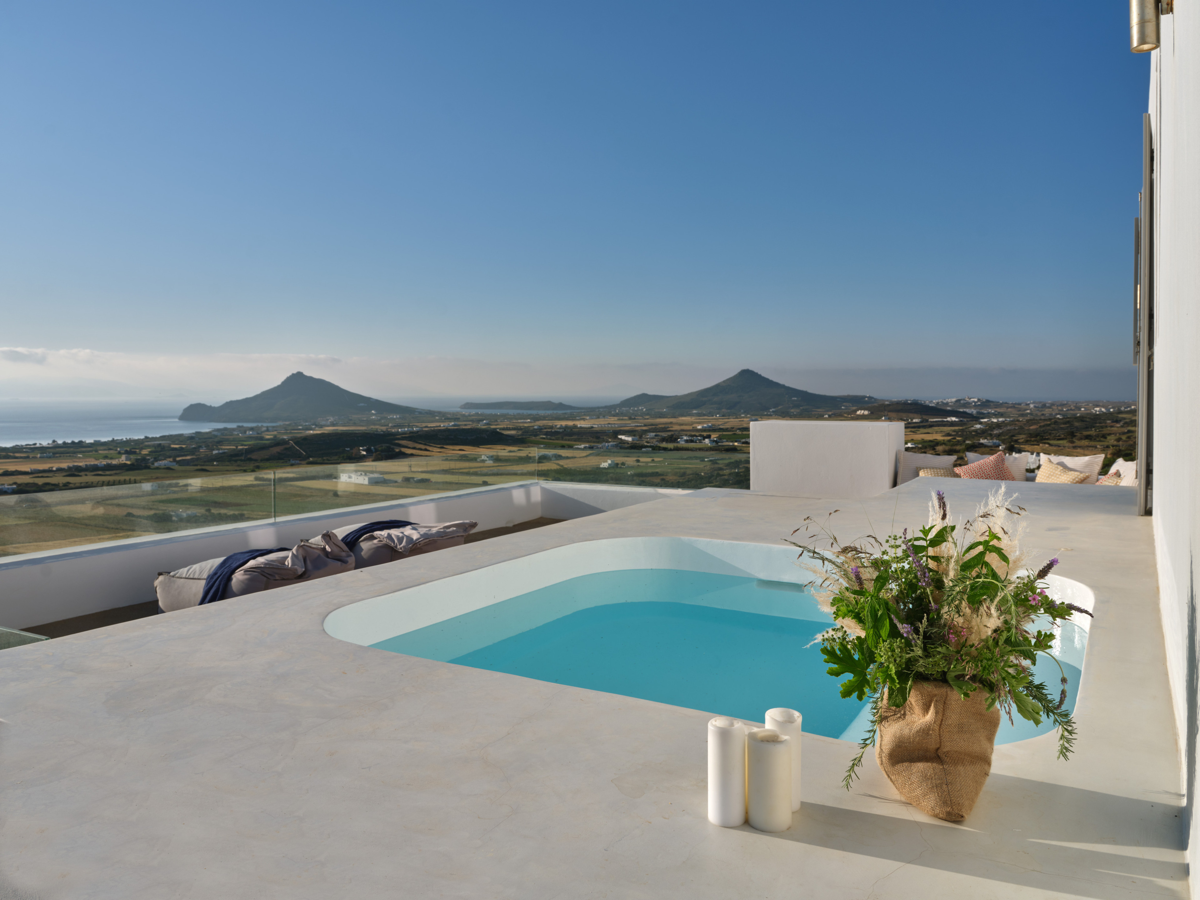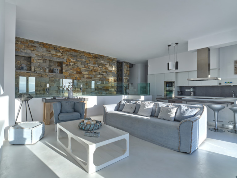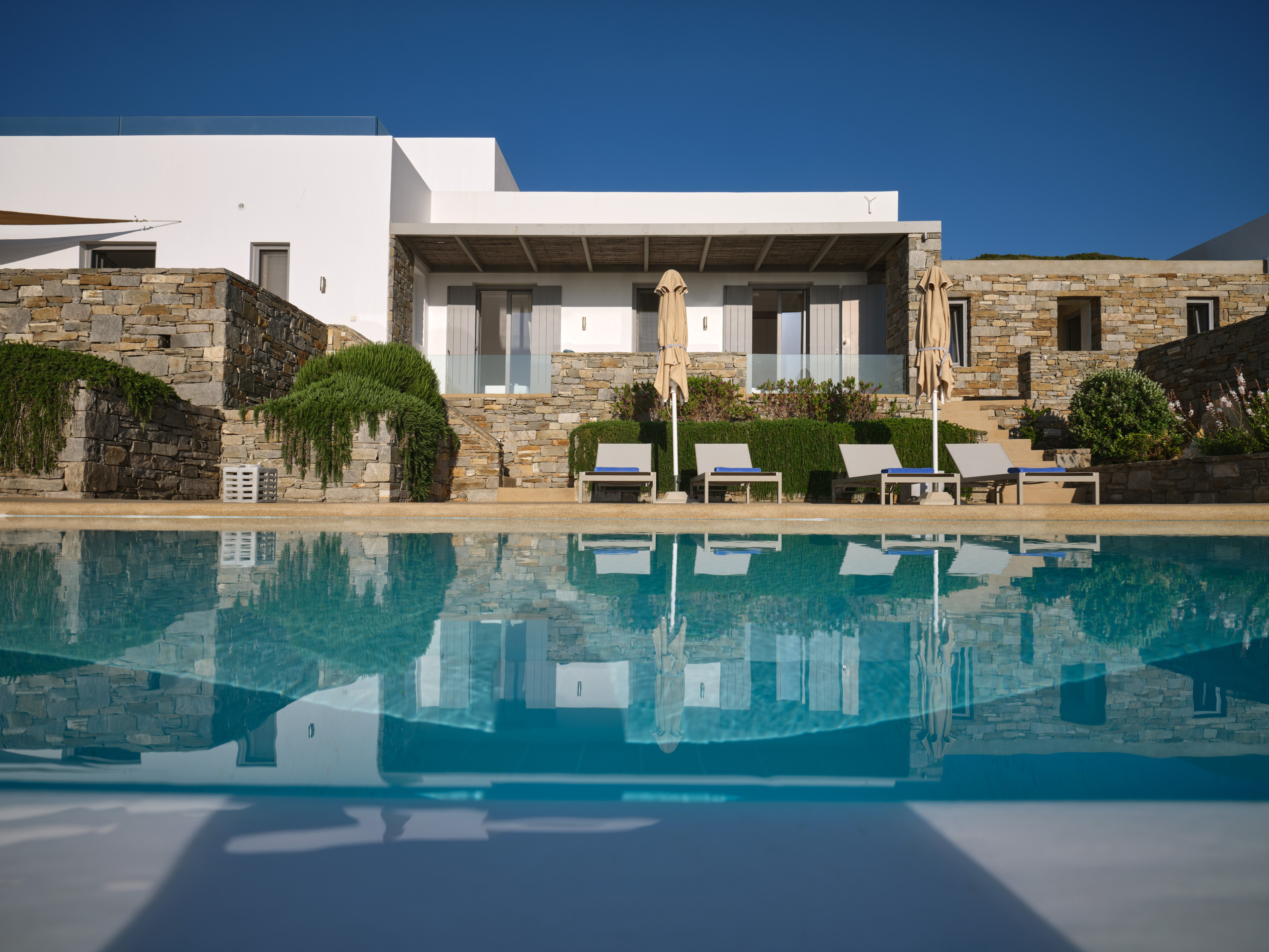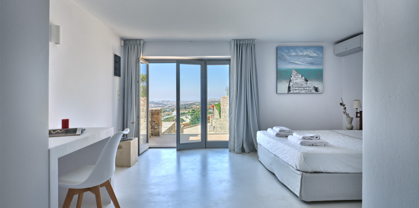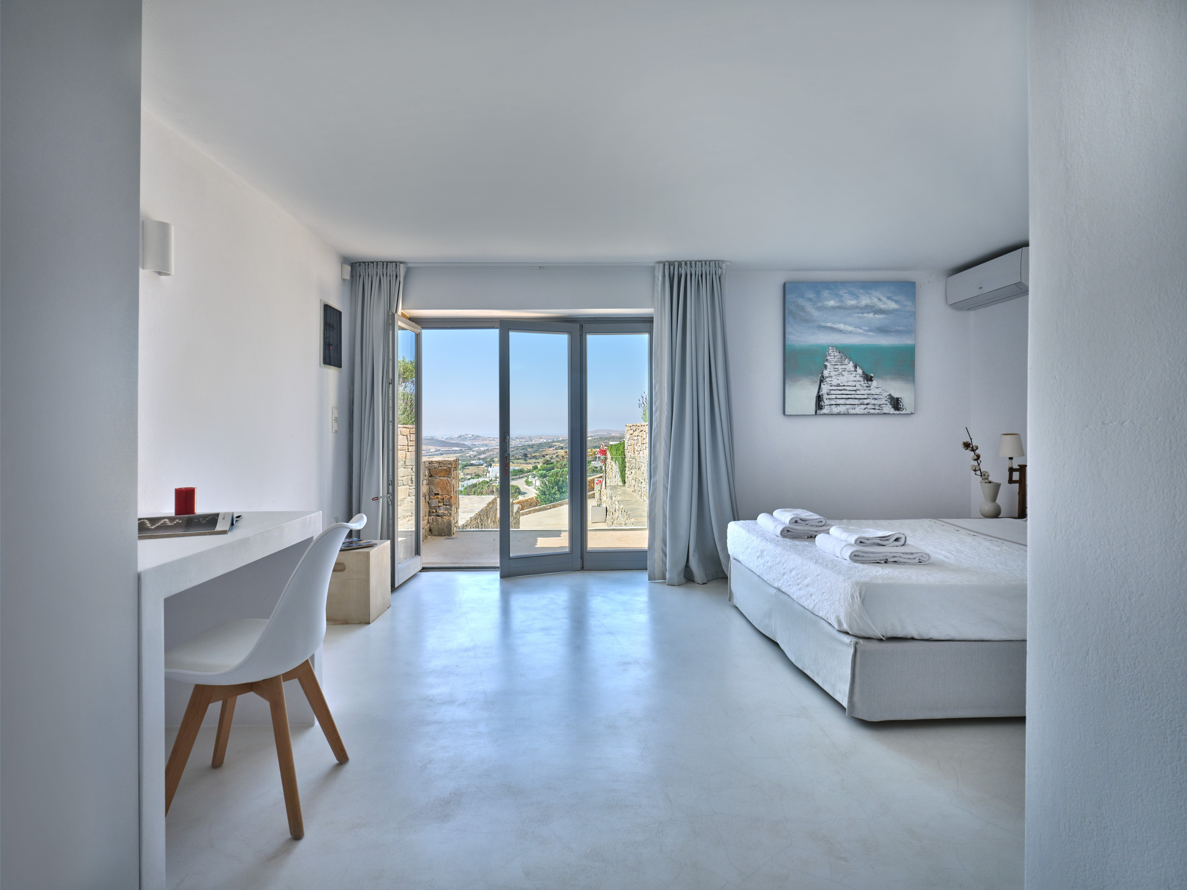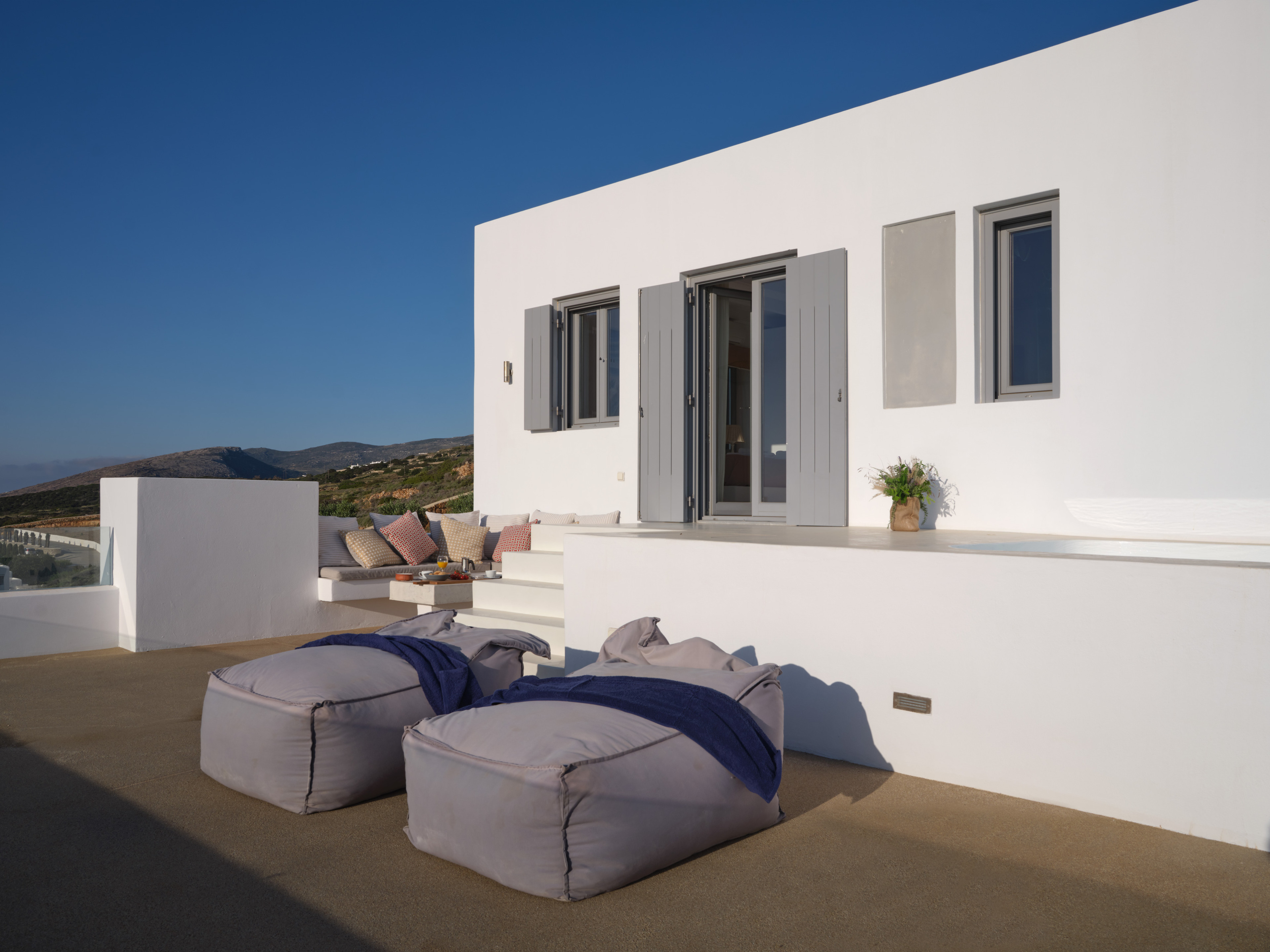 Από τη βεράντα, το Bianca μοιάζει να είναι πλήρως ενσωματωμένο στο τοπίο της Πάρου. Μινιμαλιστική, χαλαρωτική και χτισμένη για να μεγιστοποιεί την απίστευτη θέα. Οι εσωτερικοί του χώροι έχουν την ίδια απλότητα και η φυσική πέτρα και τα ποιοτικά έπιπλα δημιουργούν μια ατμόσφαιρα απόλυτης ευδαιμονίας και χαλάρωσης.