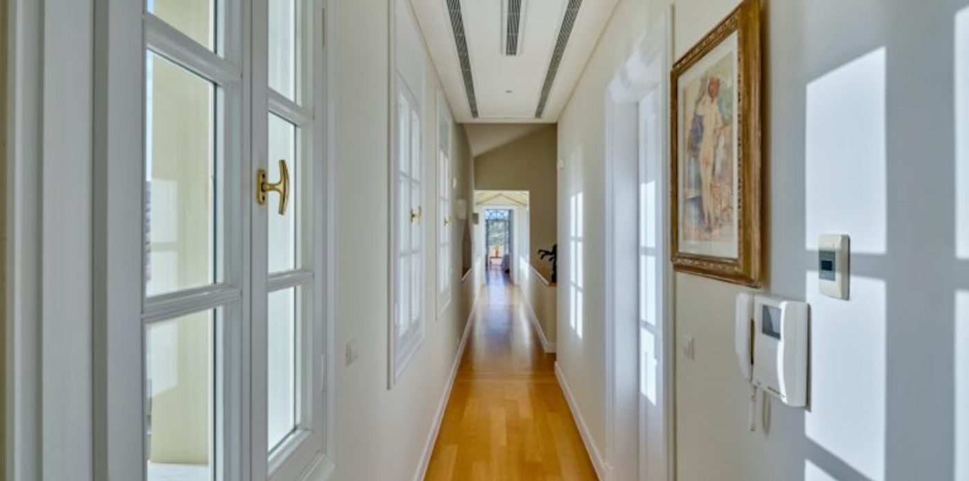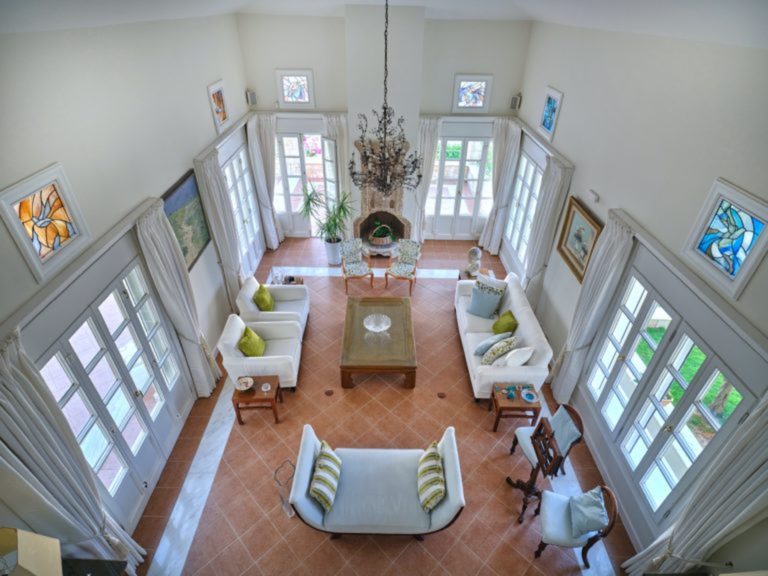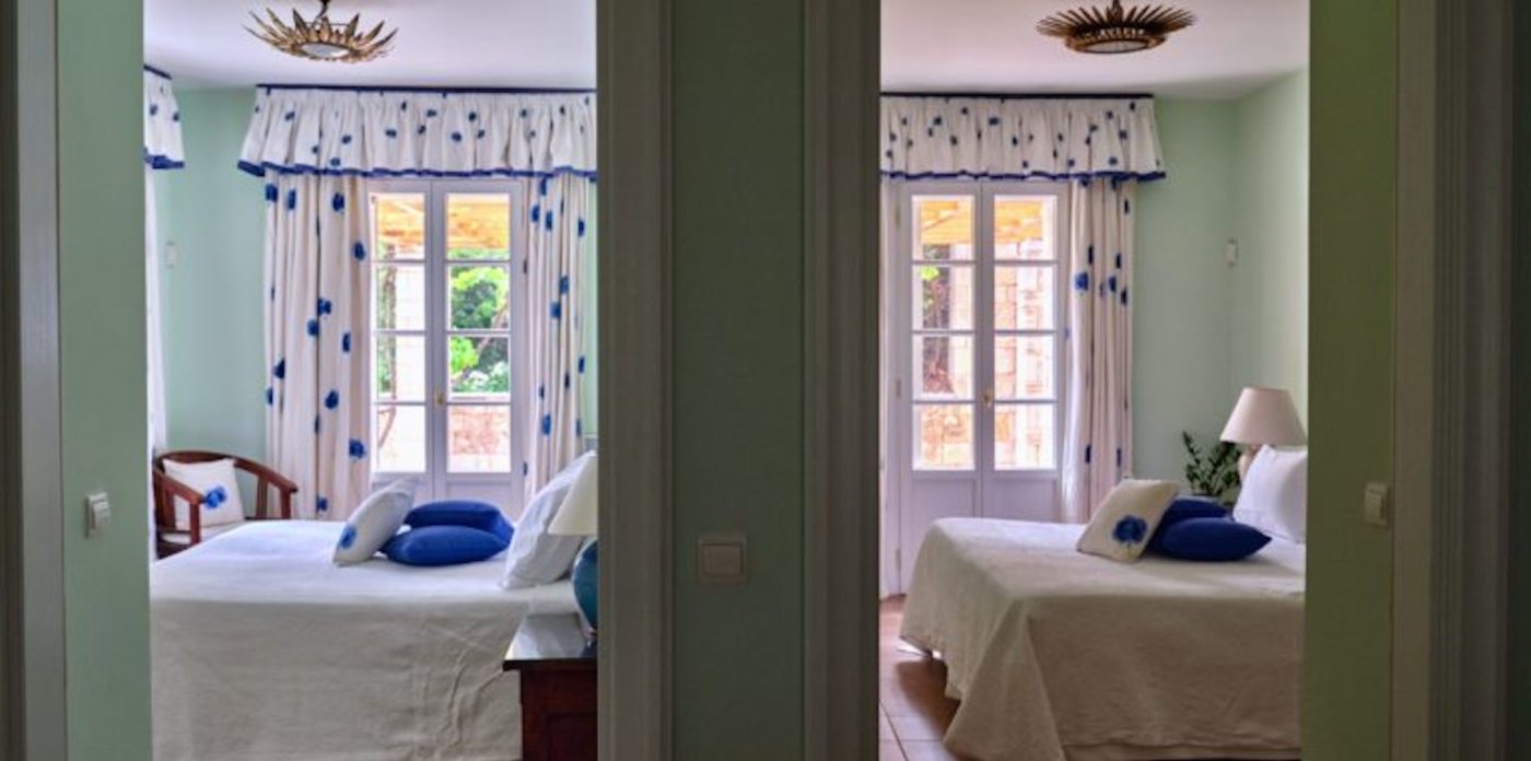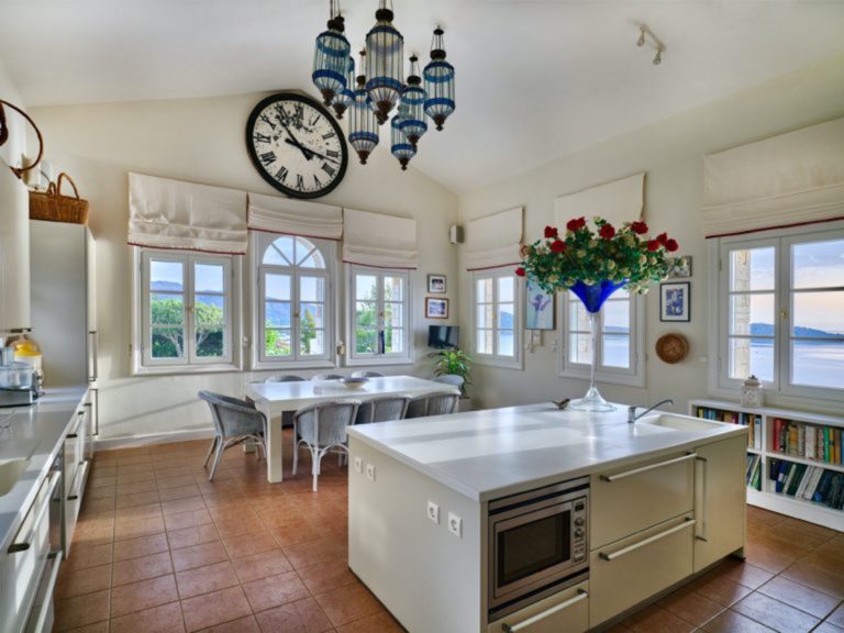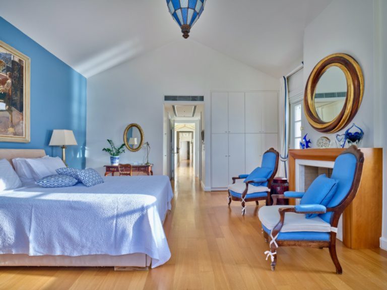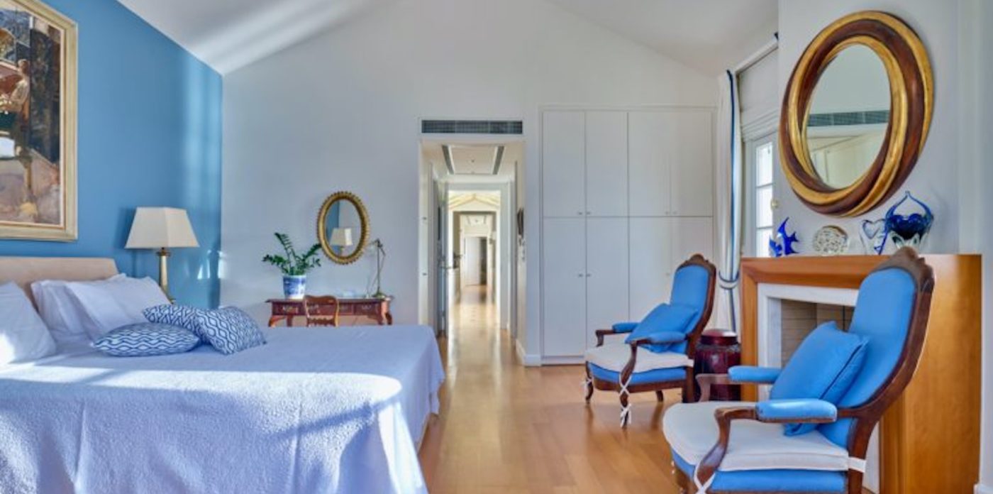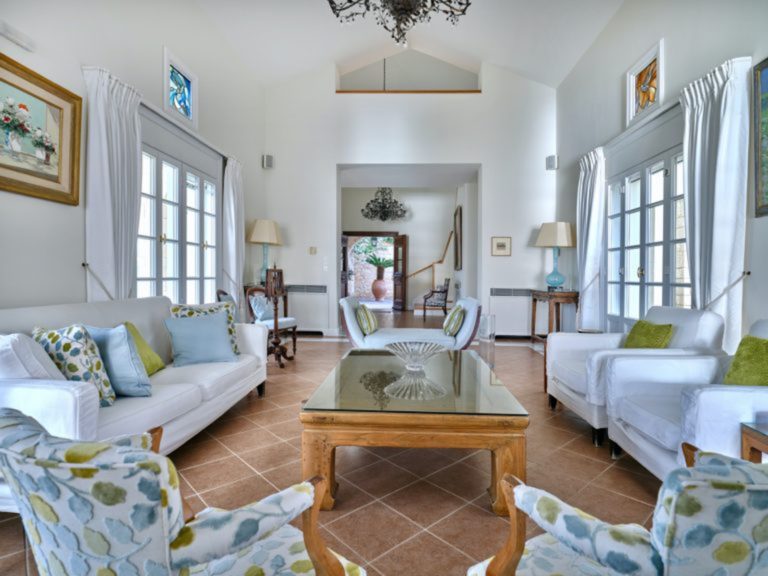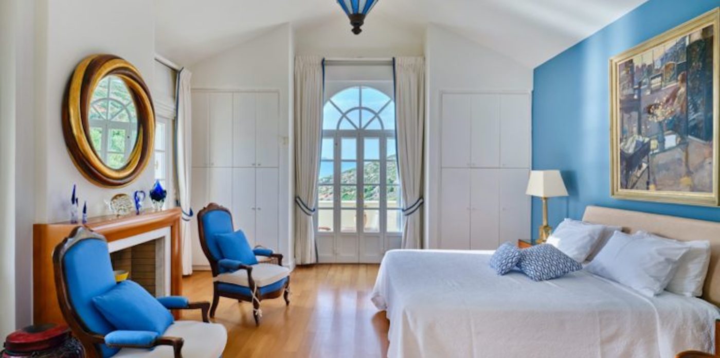 Το σαλόνι έχει όμορφη θέα στη θάλασσα και διαθέτει ένα αυθεντικό τζάκι εξακοσίων ετών που δημιουργεί ένα υπέροχο σημείο εστίασης. Κάθε ένα από τα έξι υπνοδωμάτια στο κυρίως σπίτι διαθέτει ιδιωτικό μπάνιο και ιδιωτικό μπαλκόνι ή βεράντα. Υπάρχει ένα επιπλέον ξεχωριστό διαμέρισμα/κατοικία κάτω από το γήπεδο τένις με δύο υπνοδωμάτια, ανοιχτή κουζίνα, τραπεζαρία και καθιστικό.