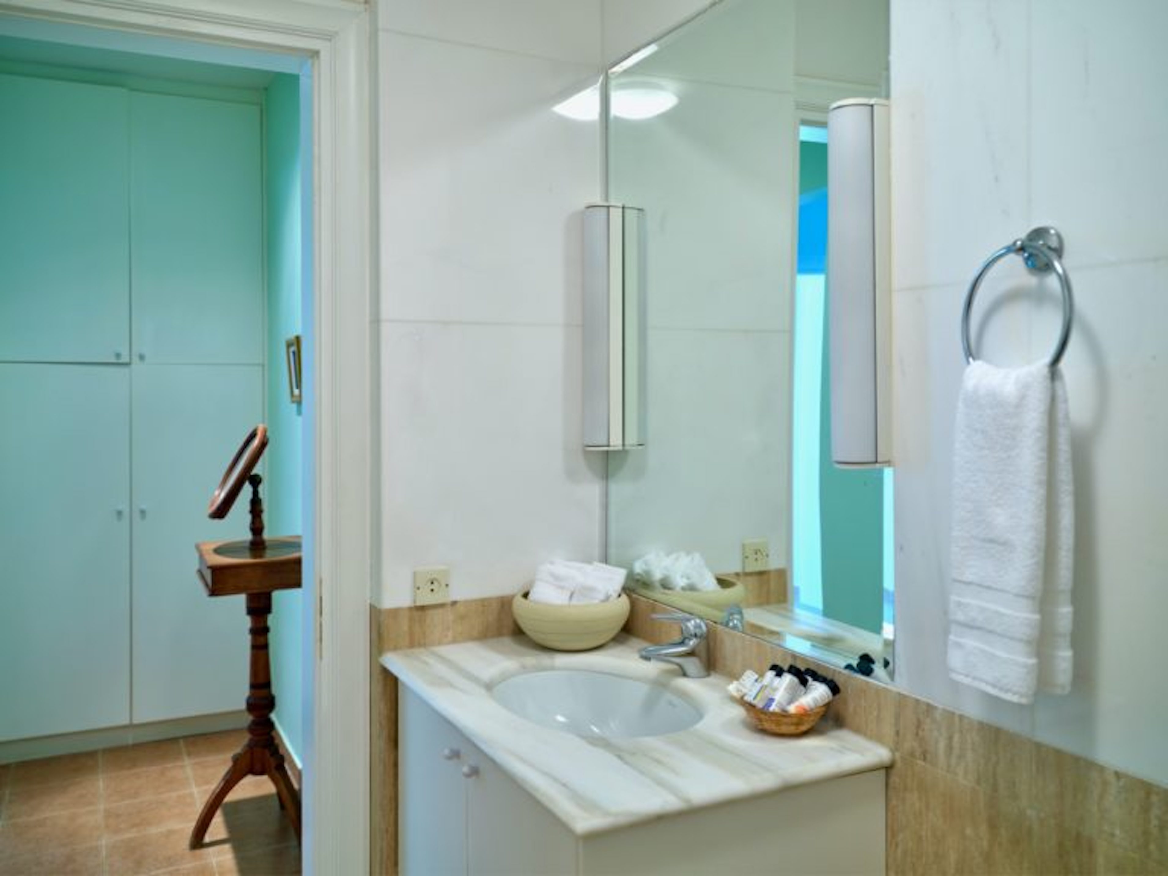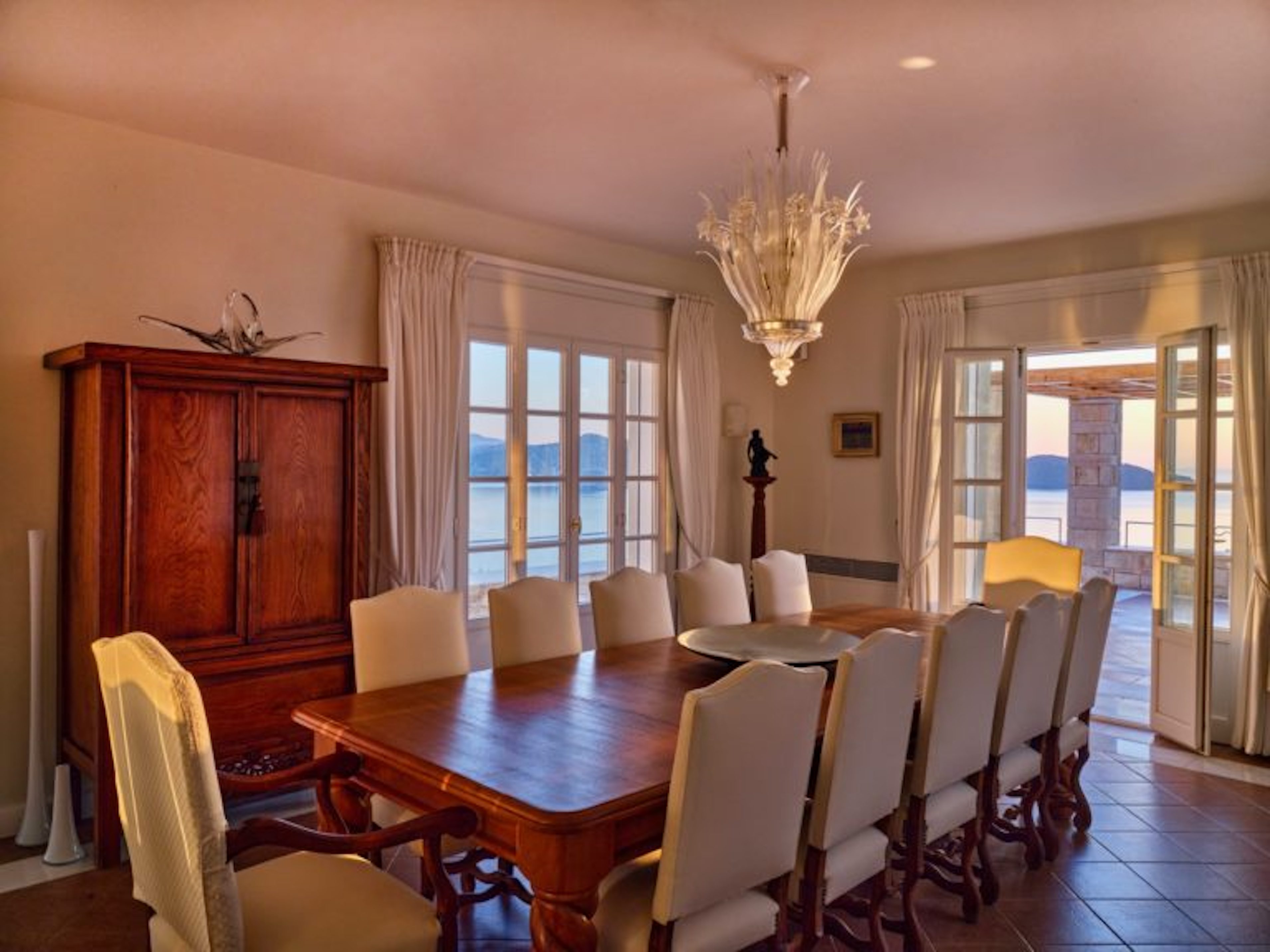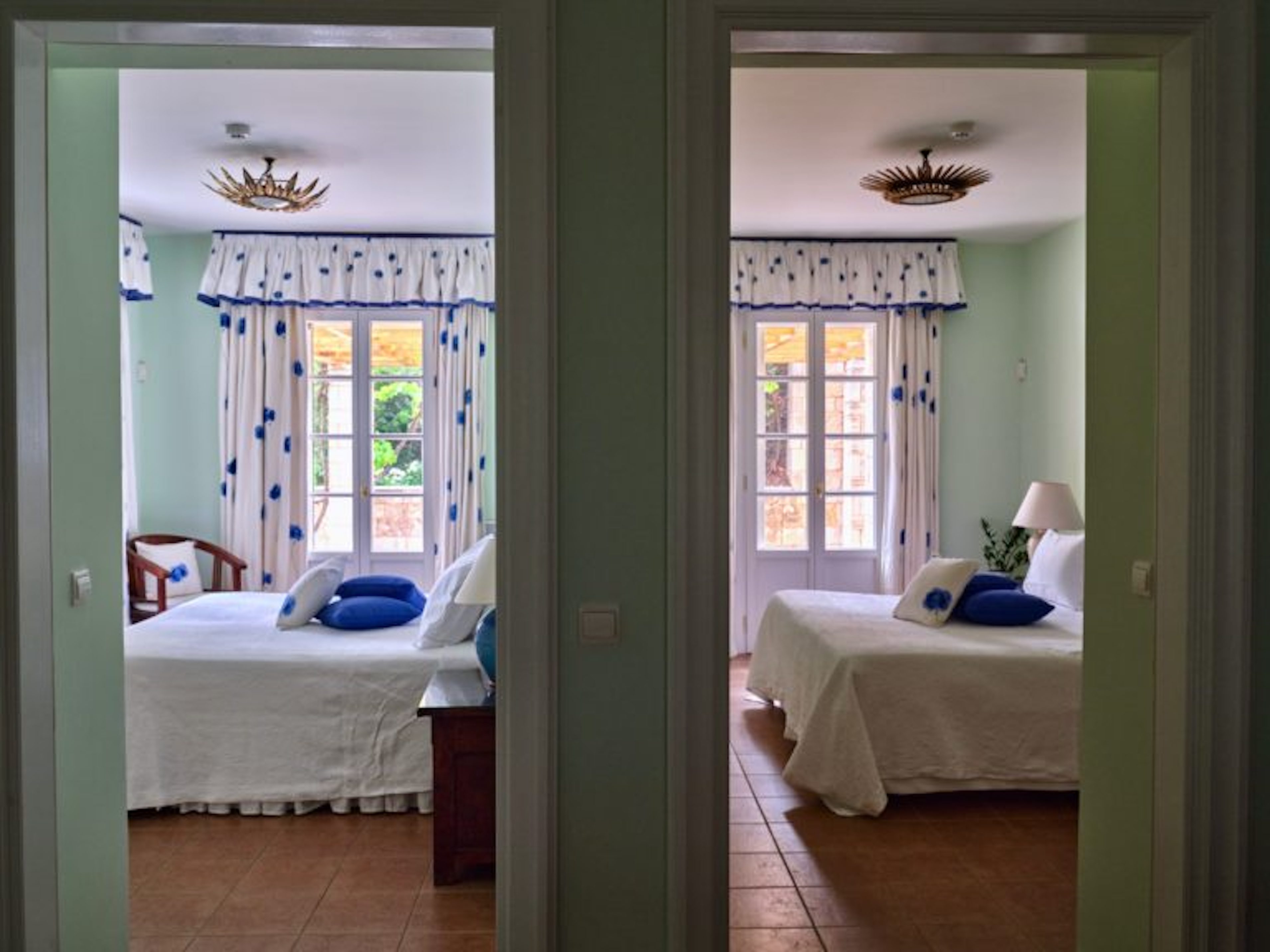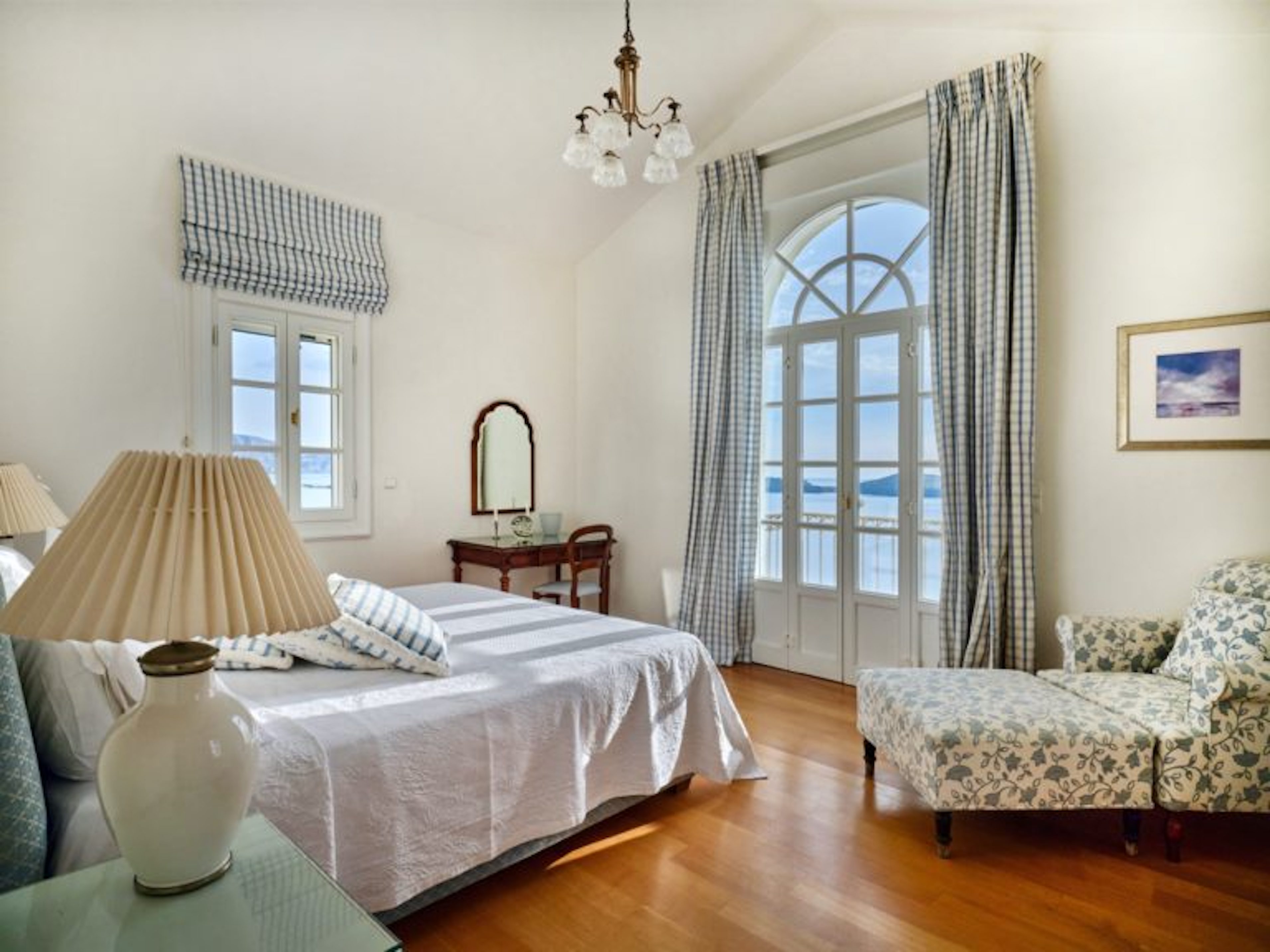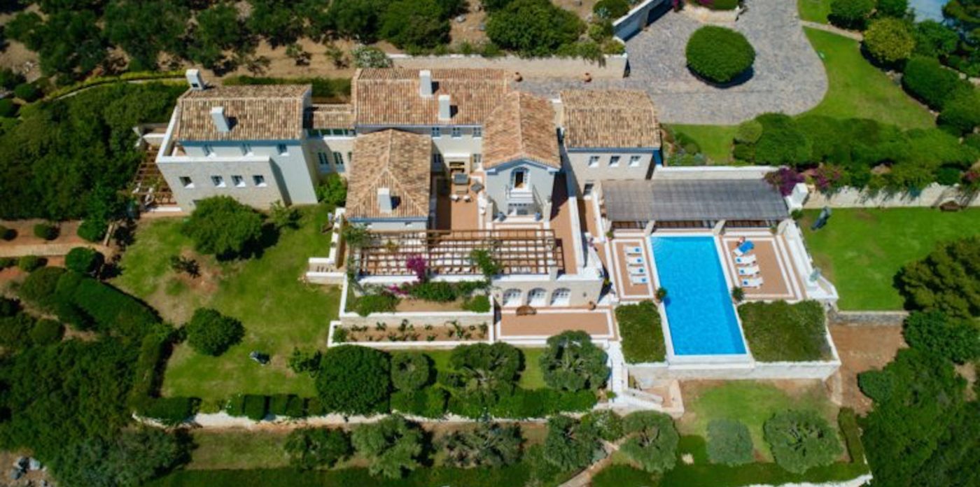 Το σαλόνι έχει όμορφη θέα στη θάλασσα και διαθέτει ένα αυθεντικό τζάκι εξακοσίων ετών που δημιουργεί ένα υπέροχο σημείο εστίασης. Κάθε ένα από τα έξι υπνοδωμάτια στο κυρίως σπίτι διαθέτει ιδιωτικό μπάνιο και ιδιωτικό μπαλκόνι ή βεράντα. Υπάρχει ένα επιπλέον ξεχωριστό διαμέρισμα/κατοικία κάτω από το γήπεδο τένις με δύο υπνοδωμάτια, ανοιχτή κουζίνα, τραπεζαρία και καθιστικό.