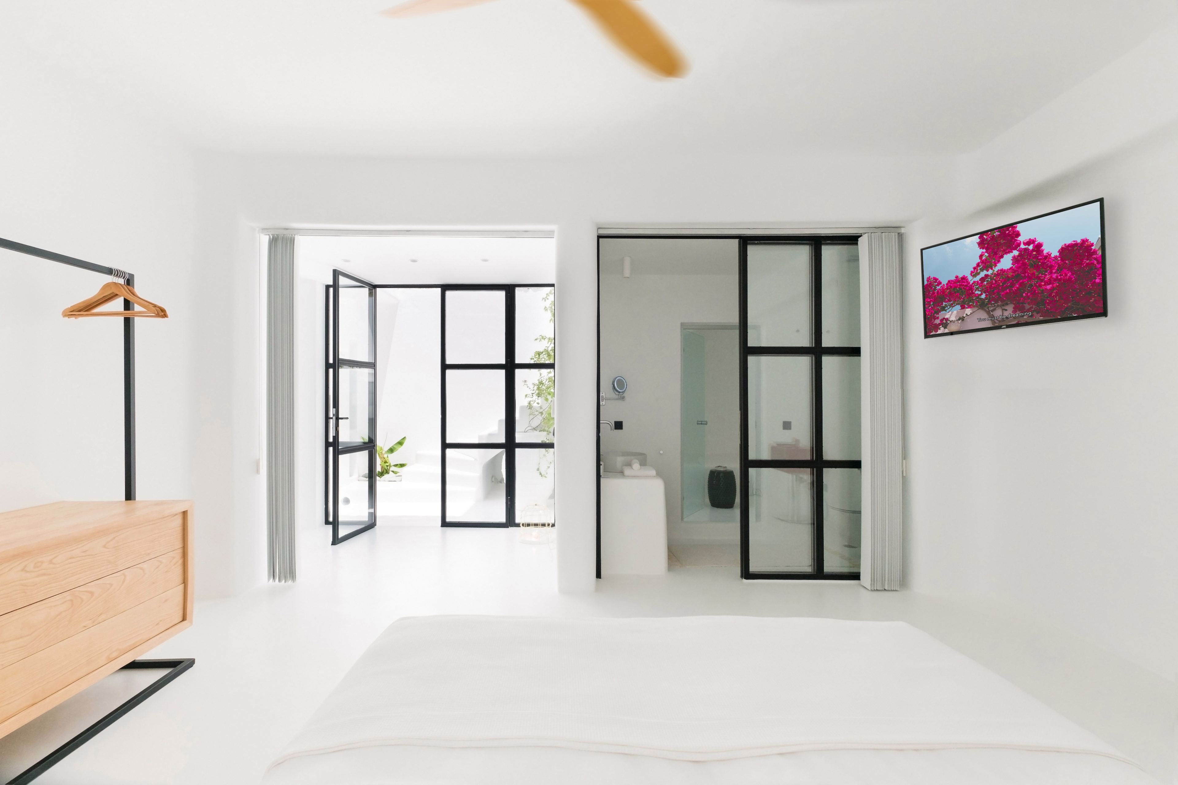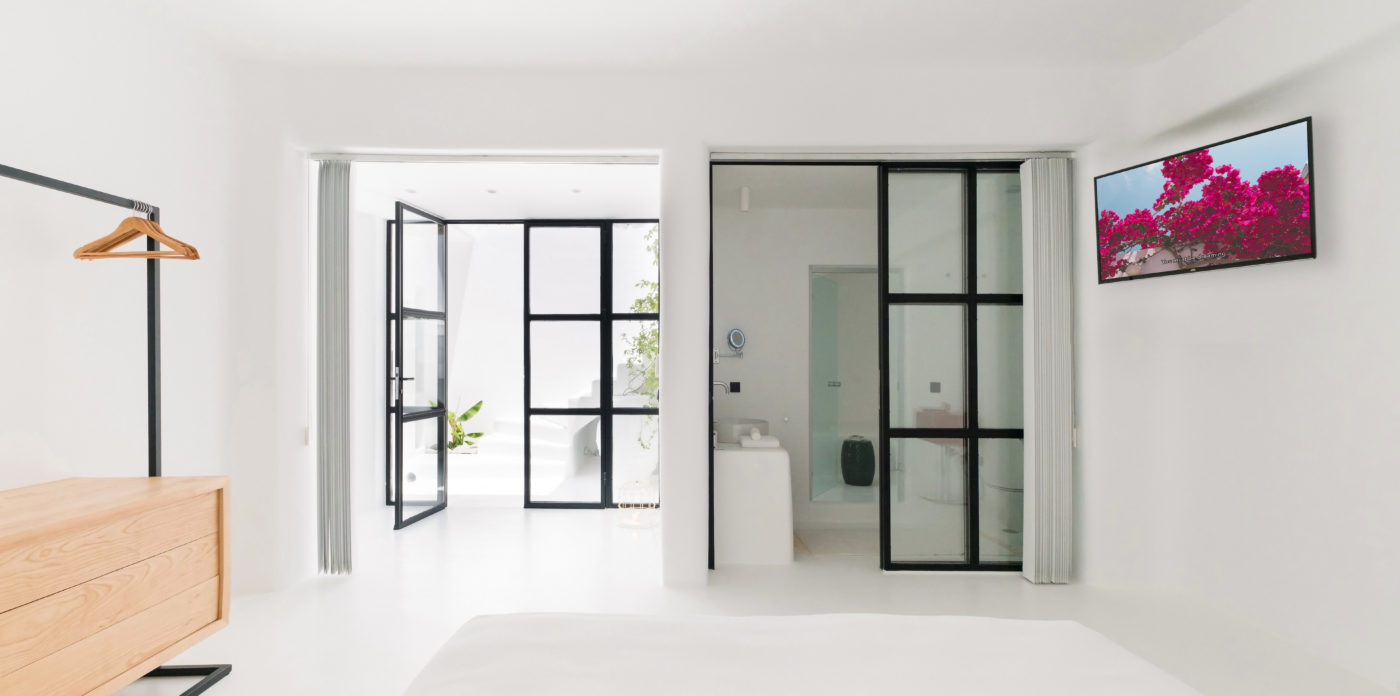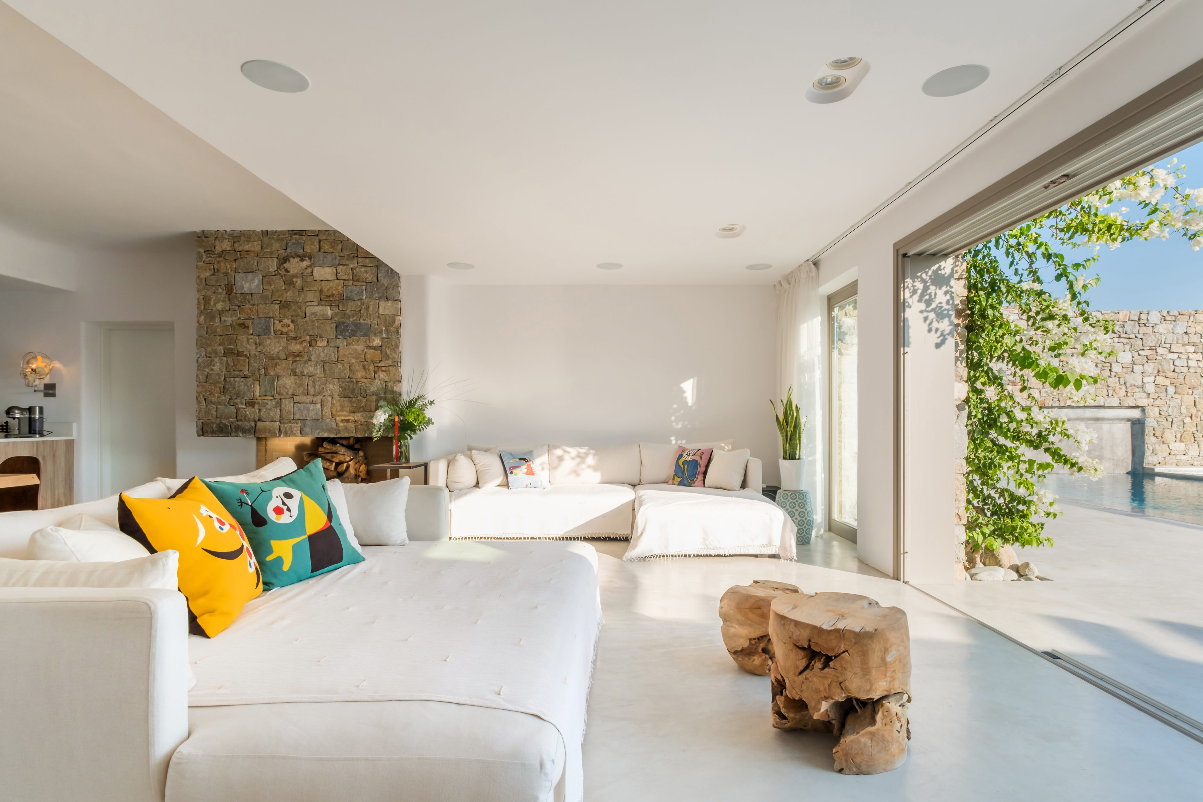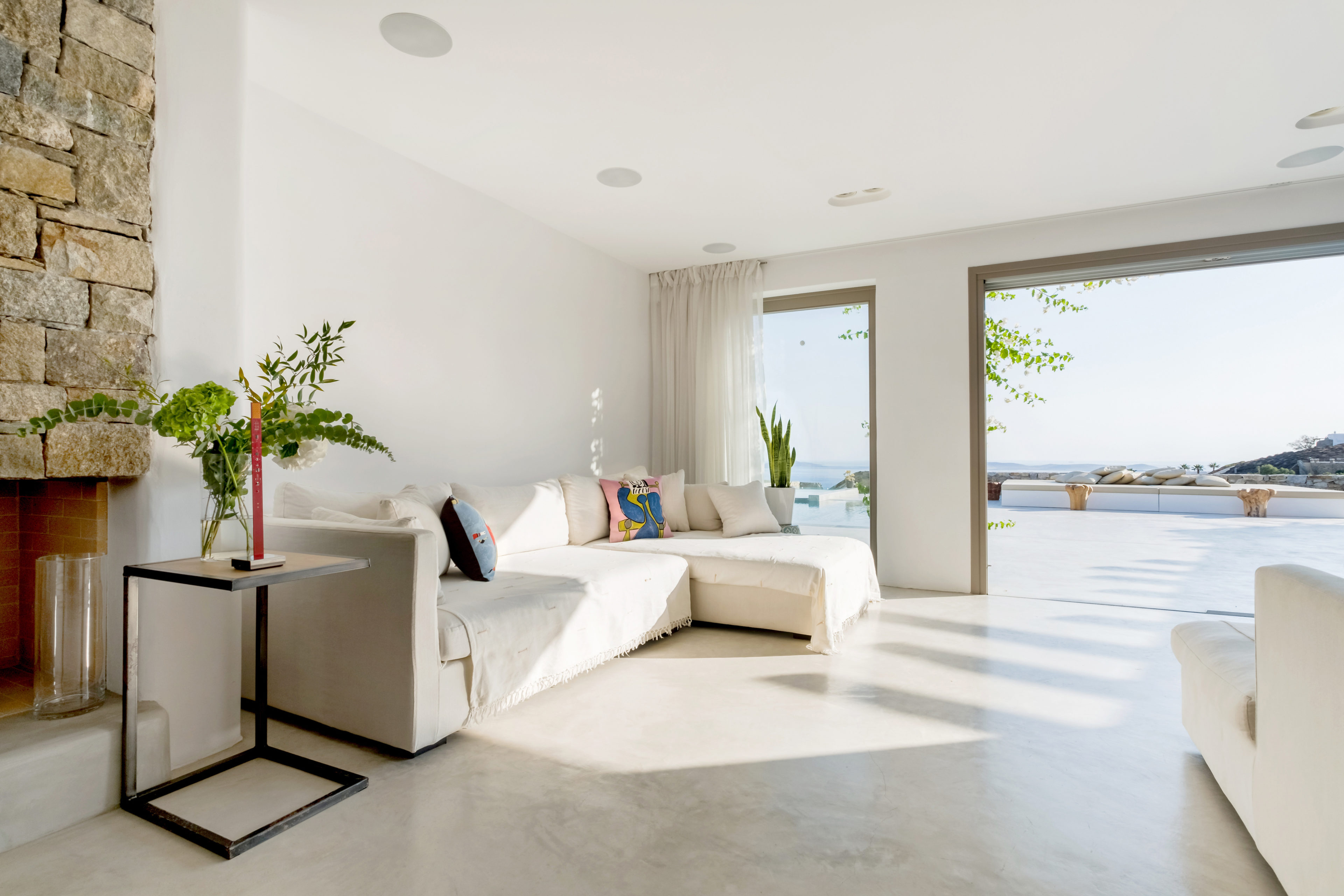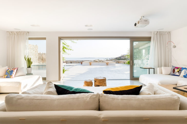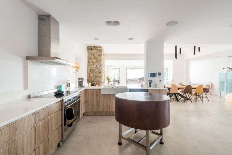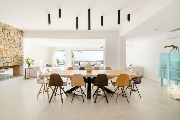 Ένα ενιαίο σαλόνι και τραπεζαρία μαζί με την πλήρως εξοπλισμένη κουζίνα αποτελούν την καρδιά των εσωτερικών χώρων της βίλας. Οι γυάλινες πόρτες από το δάπεδο μέχρι την οροφή φέρνουν το φυσικό φως στο εσωτερικό, αναδεικνύοντας την αισθητική της λευκής διακόσμησης.