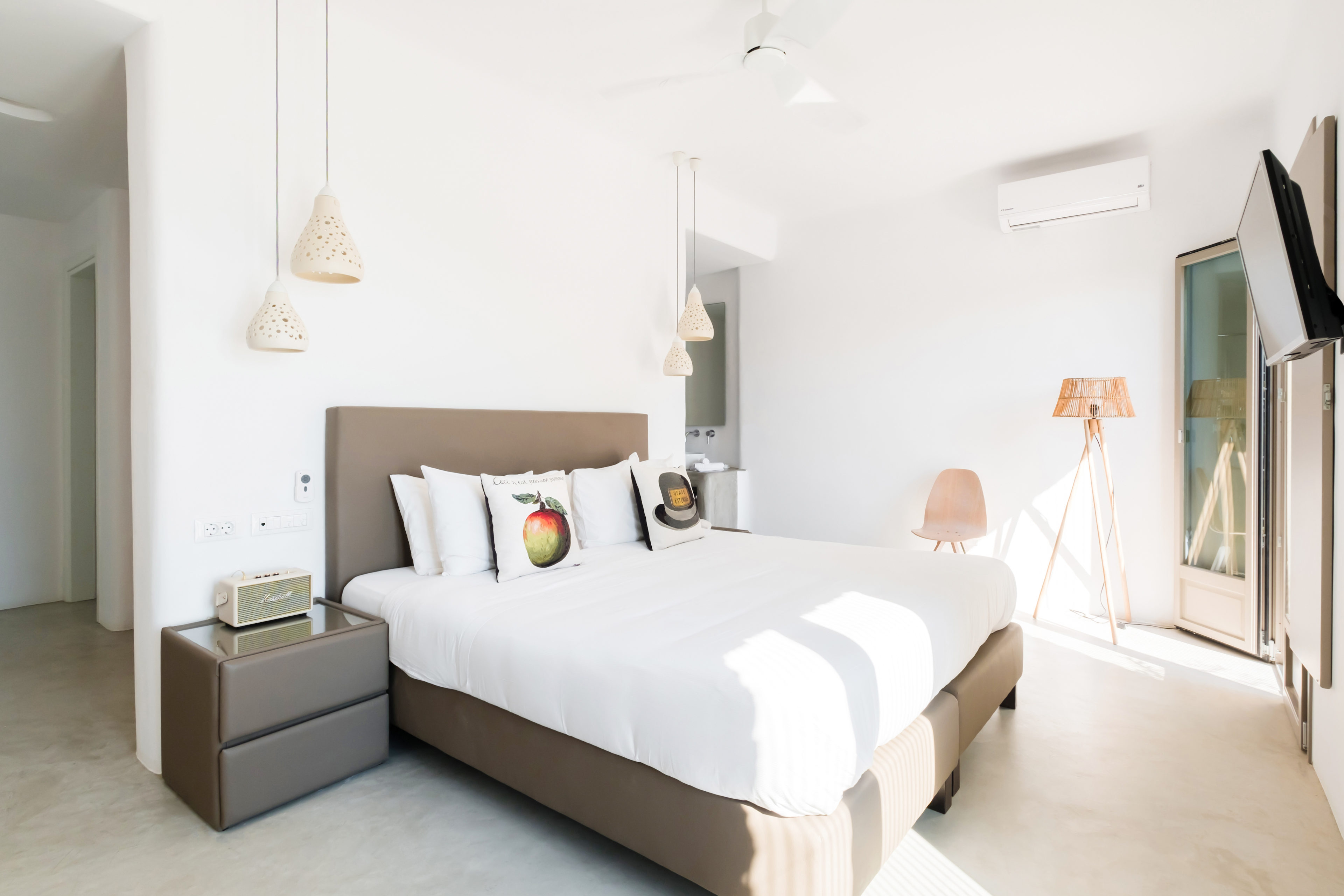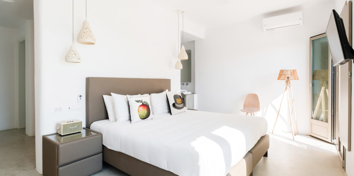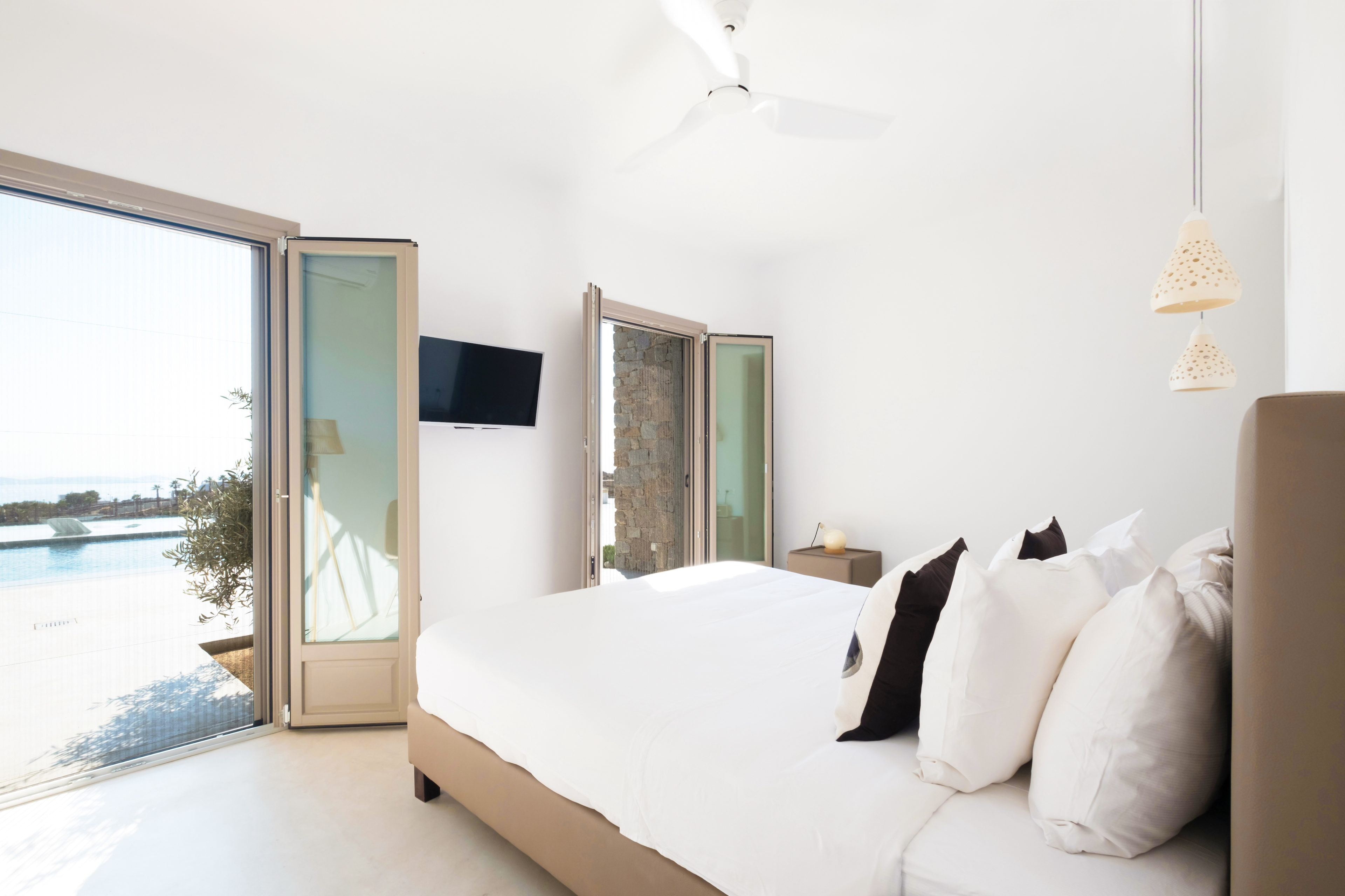 Κάθε ένα από τα έξι κύρια υπνοδωμάτια με ιδιωτικό μπάνιο διαθέτει κρεβάτια king size και έχει μαγευτική θέα στη θάλασσα. Όλα έχουν πρόσβαση στις όμορφες βεράντες ή/και μπαλκόνια της βίλας.