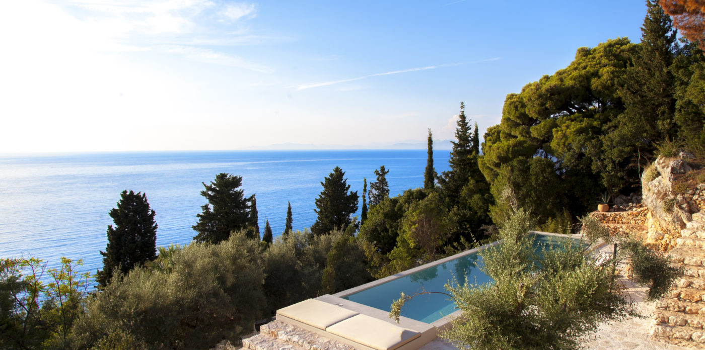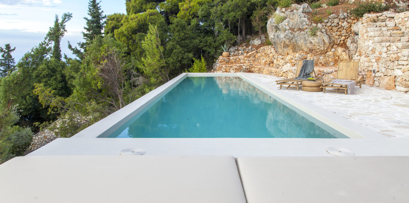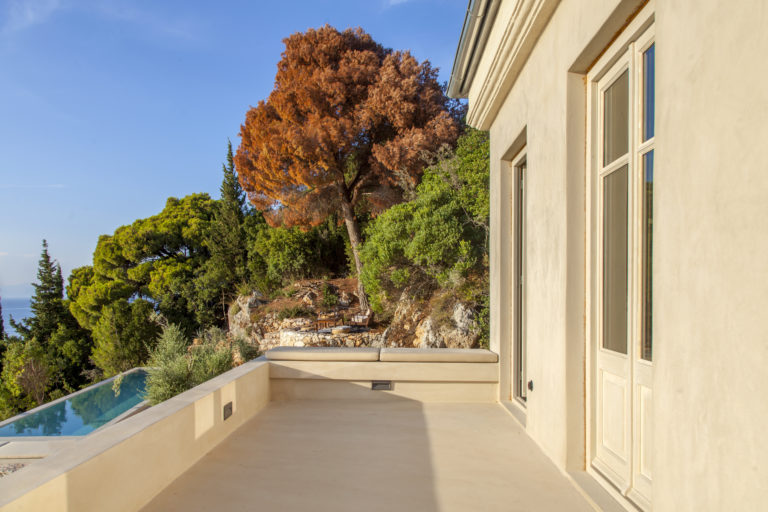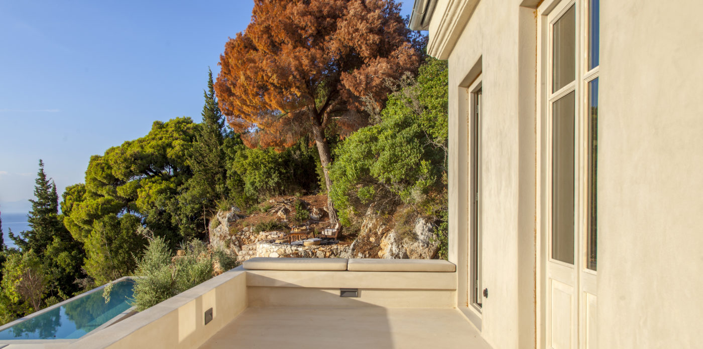 Οι εξωτερικοί χώροι της αποτελούνται από μια σειρά από βεράντες, κάποιες σκιερές, κάποιες άλλες για να ξαπλώνετε στον ζεστό ήλιο, που περιβάλλουν τη βίλα σε πολλά διαφορετικά επίπεδα με φόντο τα ζωντανά χρώματα του βουνού. Απολαύστε την πισίνα υπερχείλισης με θέα το Ιόνιο Πέλαγος, ενώ πίνετε τα παγωμένα κοκτέιλ σας όλες τις ώρες της ημέρας.