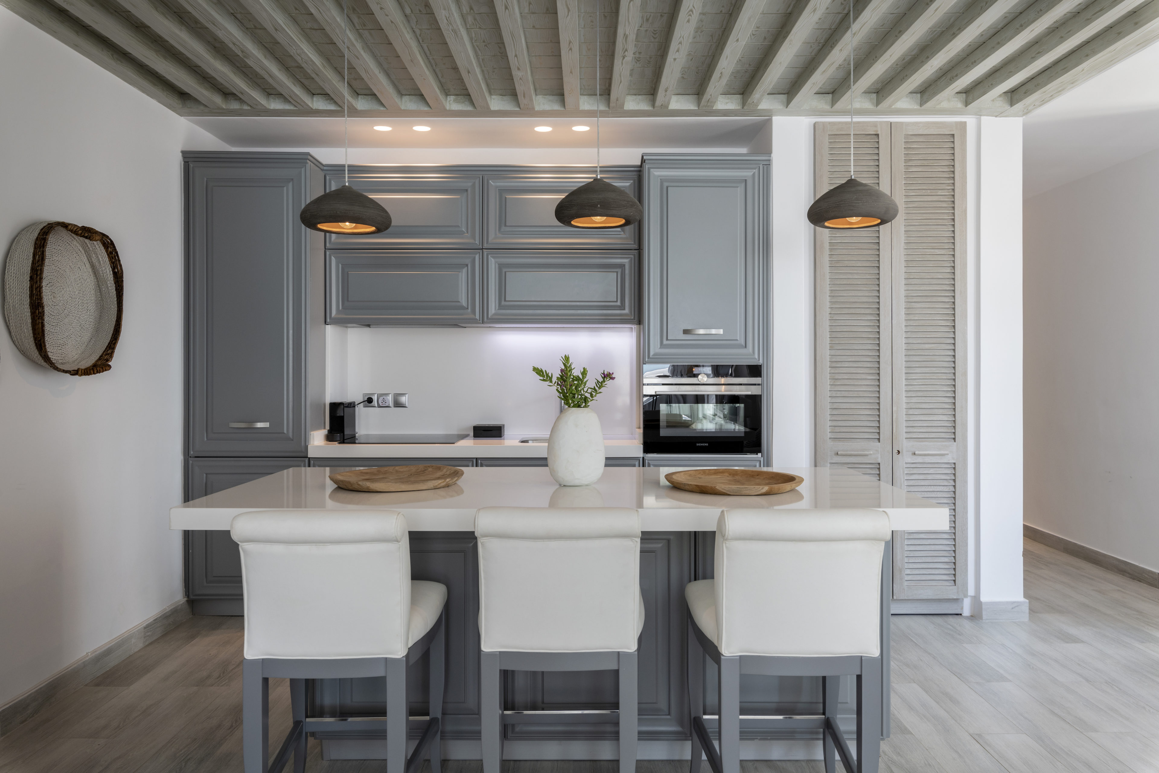 Η βίλα διαθέτει κομψούς εσωτερικούς χώρους και μπαλκόνια με πανοραμική θέα στη θάλασσα. Σε αρμονία με τη φύση της, οι εσωτερικοί χώροι έχουν σχεδιαστεί χρησιμοποιώντας μια δροσερή, ουδέτερη παλέτα με χρωματικές πινελιές, για να δημιουργήσουν πολυτελείς και εμπλουτισμένους χώρους, με φόντο την αστραφτερή παραλία Ψαρού.