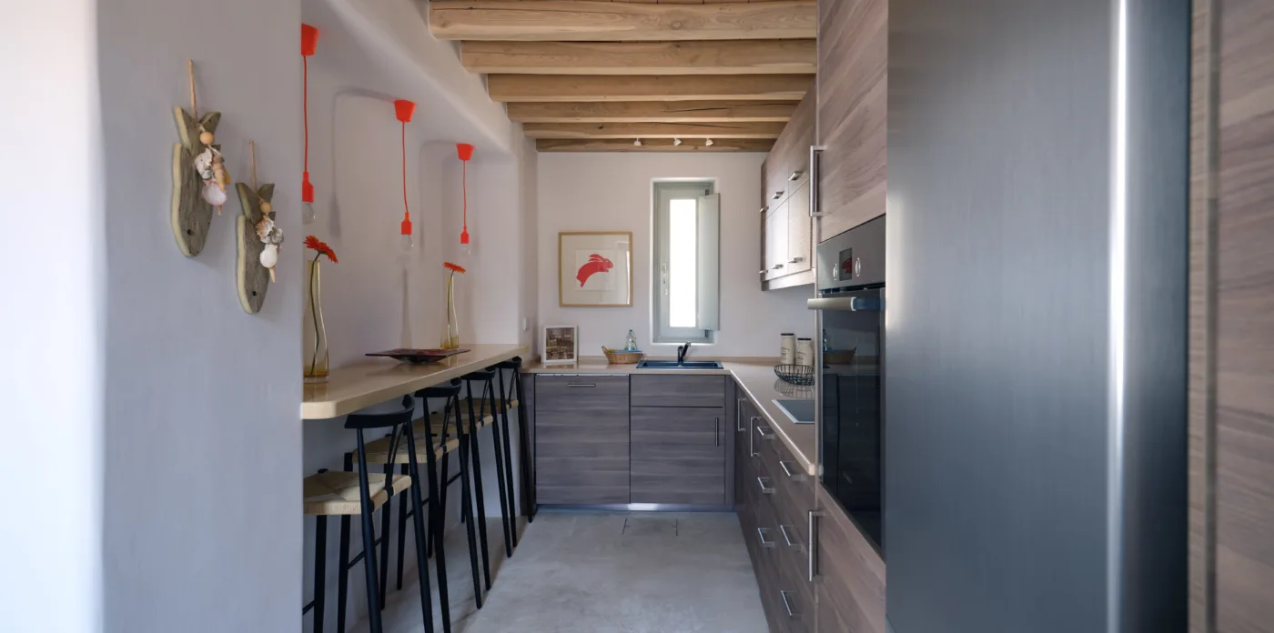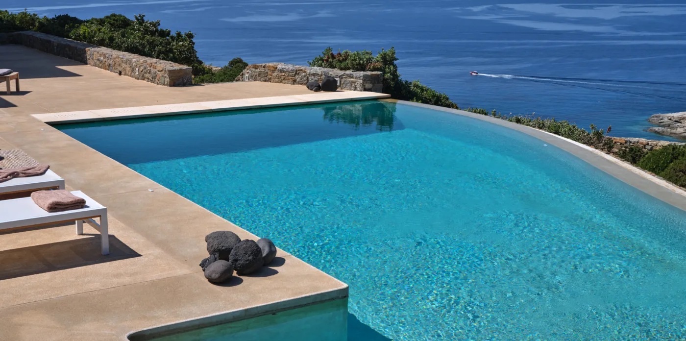 Καθώς βγαίνετε έξω, η πισίνα υπερχείλισης λειτουργεί ως συνέχεια της ατελείωτης θάλασσας, προσφέροντας θέα που κόβει την ανάσα. Οι εσωτερικοί χώροι αποτελούνται από ζεστούς ουδέτερους τόνους, ξύλινες λεπτομέρειες, ένα σαλόνι ανοιχτού χώρου και μια μεγάλη τραπεζαρία που μπορεί να φιλοξενήσει έως και δέκα άτομα. Δύο πλήρως εξοπλισμένες σύγχρονες κουζίνες και ένας μικρότερος χώρος καθιστικού συμπληρώνουν τις ανέσεις.
