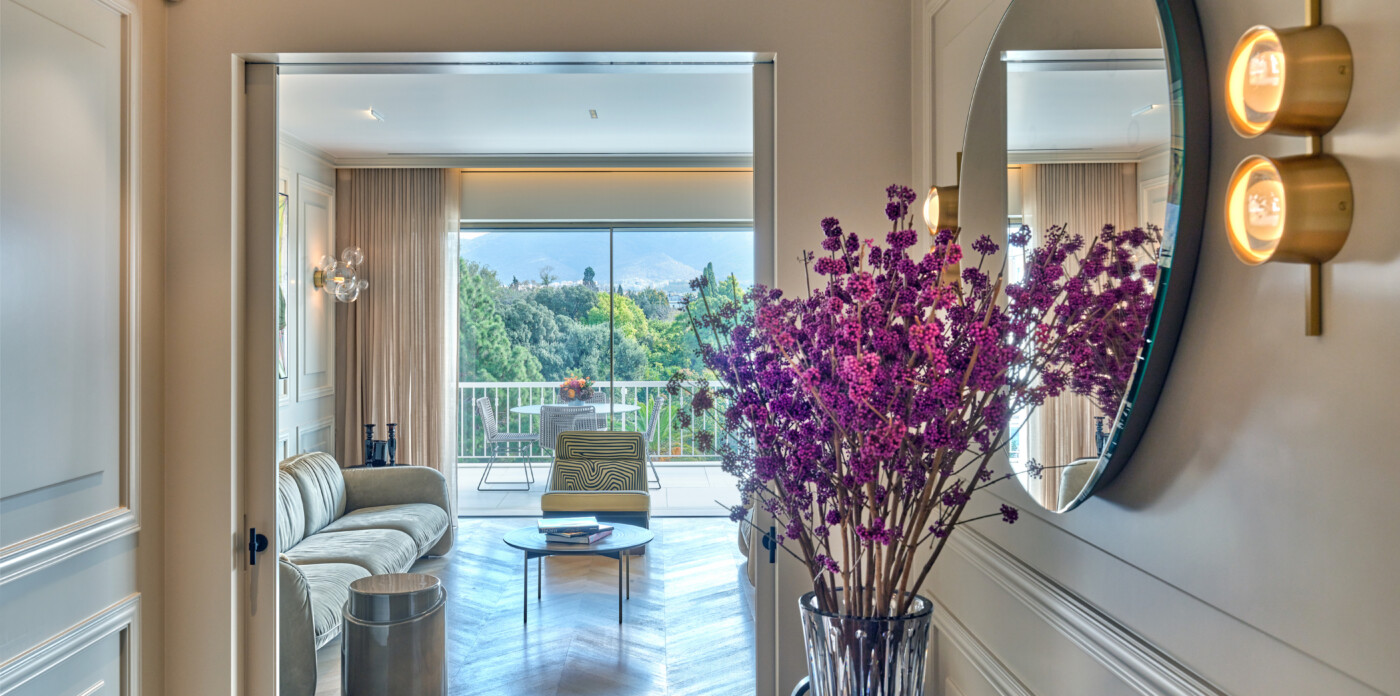 Στο εσωτερικό του, το Reina 185 τ.μ. είναι ένα αριστούργημα σύγχρονου σχεδιασμού, συνδυάζοντας τη λειτουργικότητα με την εκλεπτυσμένη αισθητική. Η ανοιχτή διαρρύθμιση διαθέτει εκλεπτυσμένες λεπτομέρειες και πολυτελή επίπλωση. Ζεστά παρκέ δάπεδα με μοτίβο ψαροκόκαλου, ουδέτεροι τόνοι και ζωηρά έργα τέχνης αναδεικνύουν το καθιστικό και την τραπεζαρία. Δύο εντυπωσιακοί πολυέλαιοι προσθέτουν μια μοντέρνα καλλιτεχνική πινελιά, ενώ οι συρόμενες γυάλινες πόρτες από το δάπεδο μέχρι την οροφή γεμίζουν το χώρο με φυσικό φως και συνδέουν άψογα τους εσωτερικούς χώρους με τη βεράντα.