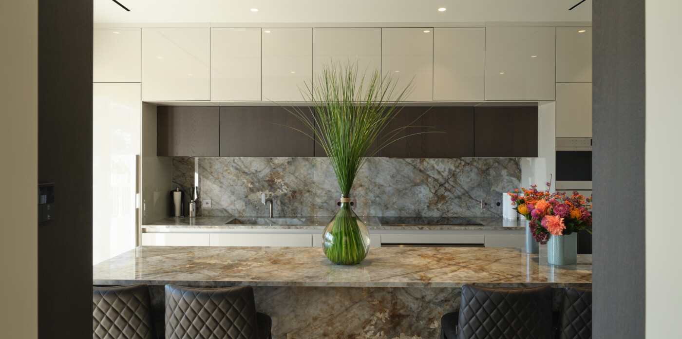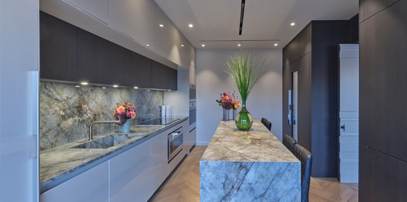Η κουζίνα, με τις κομψές μαύρες και γκρι αποχρώσεις της, είναι ένας υπερσύγχρονος χώρος που αποπνέει μια τολμηρή αλλά και διαχρονική ατμόσφαιρα. Μια όμορφη νησίδα κατασκευασμένη από γυαλισμένο γκρι μάρμαρο, με τα μοναδικά φλεβώδη μοτίβα της, χρησιμεύει ως εκπληκτικό κεντρικό στοιχείο και προσθέτει μια πινελιά φυσικής πολυτέλειας.