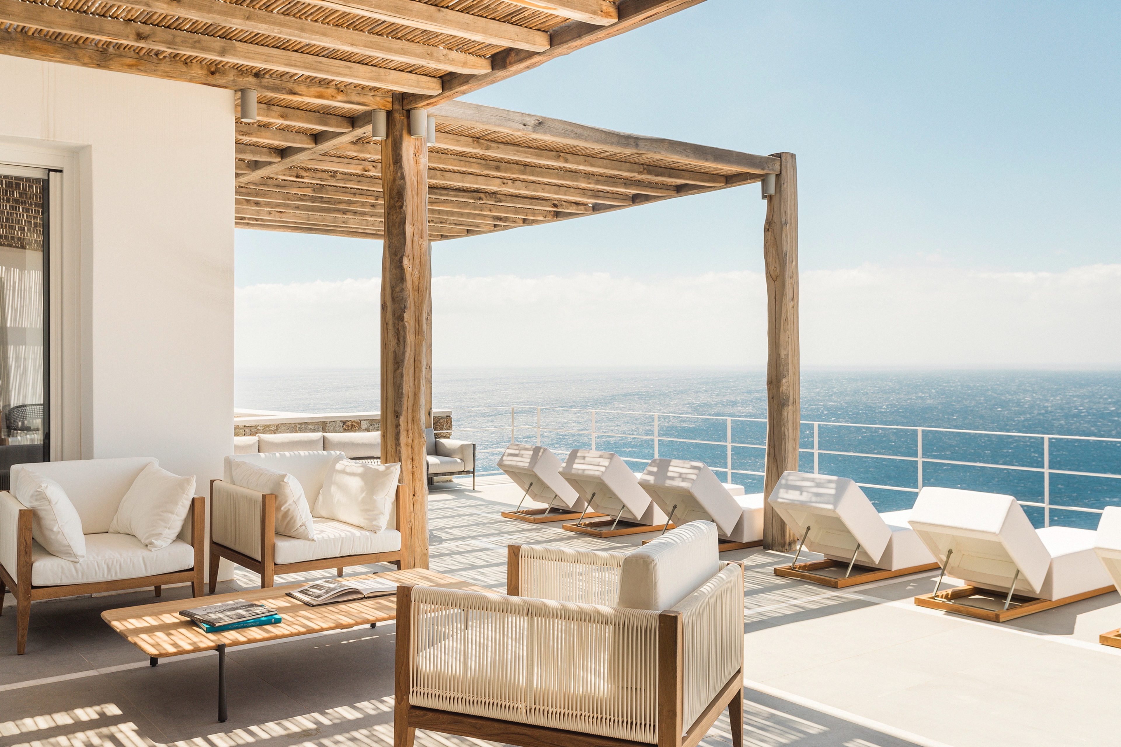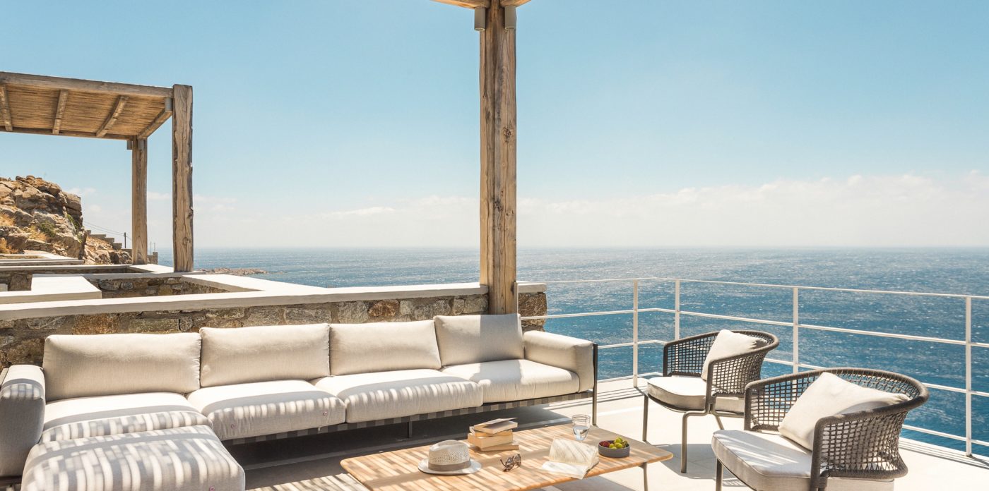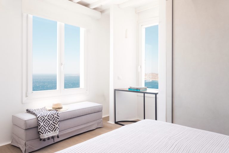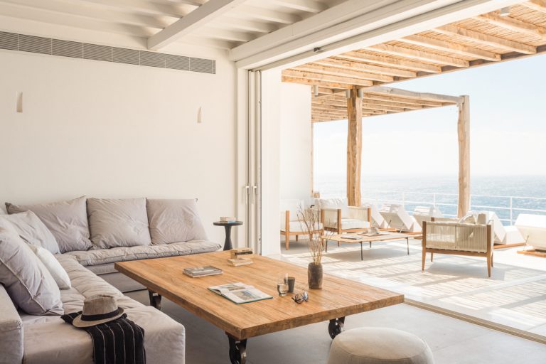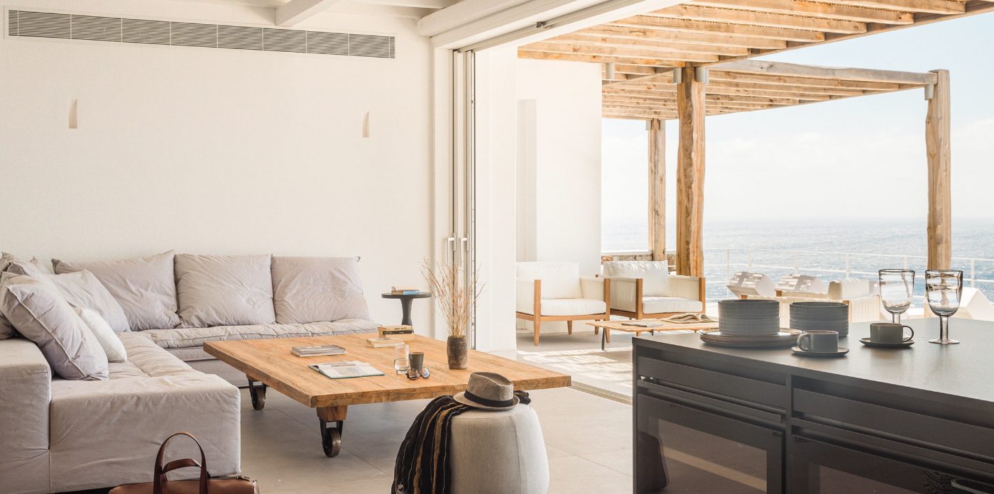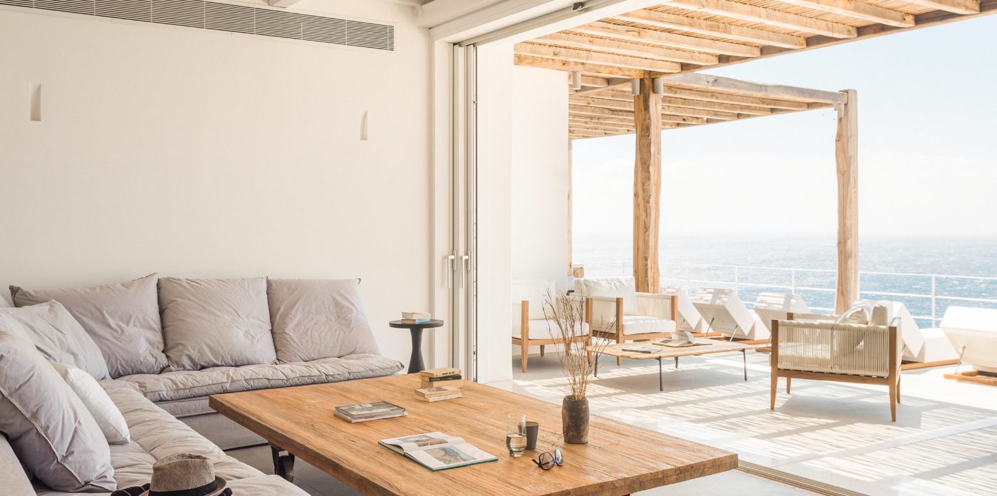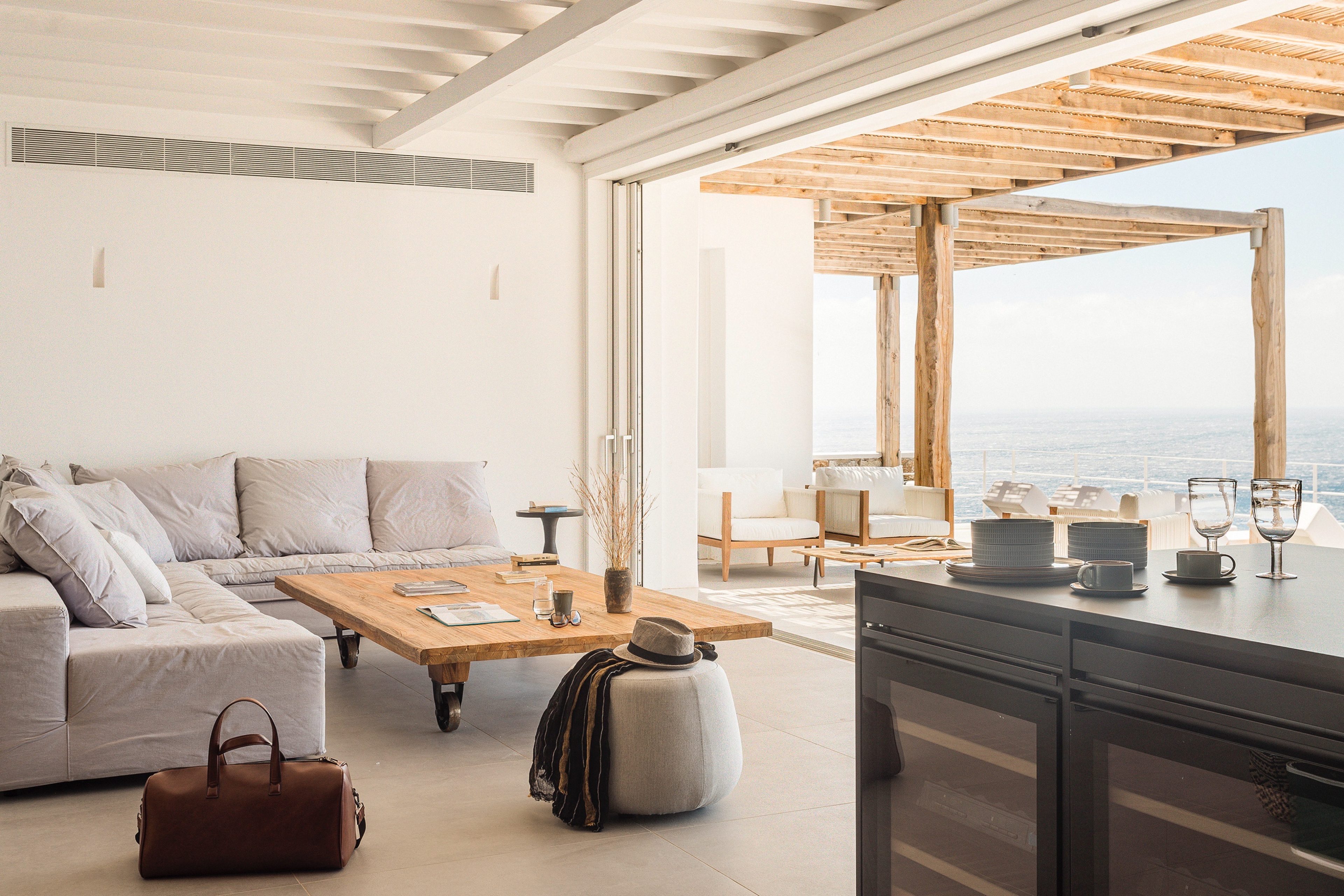 Οι απλές, γήινες αποχρώσεις, που τονίζονται από πινελιές μαύρου και λευκού, δημιουργούν μια χαλαρωτική αίσθηση σε όλο το εσωτερικό του καταλύματος. Από τα χειροποίητα έπιπλα κατά παραγγελία μέχρι τα άψογα υλικά και τελειώματα, αυτό το ακίνητο θα ξεχωρίσει ακόμη και ανάμεσα στα πιο επαινετά ακίνητα του νησιού. Ρίξτε μια ματιά από τις μεγάλες γυάλινες πόρτες της βεράντας στην εντυπωσιακή θέα στη θάλασσα. Ανοίξτε αυτές τις πόρτες και μπορείτε εύκολα να γεμίσετε τον εσωτερικό χώρο με φρέσκια θαλασσινή αύρα και φυσικό ηλιακό φως. Ο ανοιχτός σχεδιασμός προωθεί μια ατμόσφαιρα ελεύθερης ροής, καθιστώντας εύκολη την απόλαυση της θέας από το τραπέζι του δείπνου ή τον καναπέ του καθιστικού.