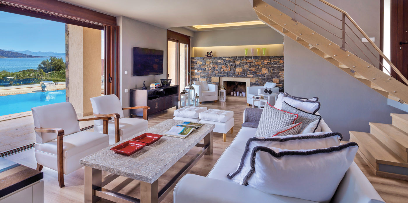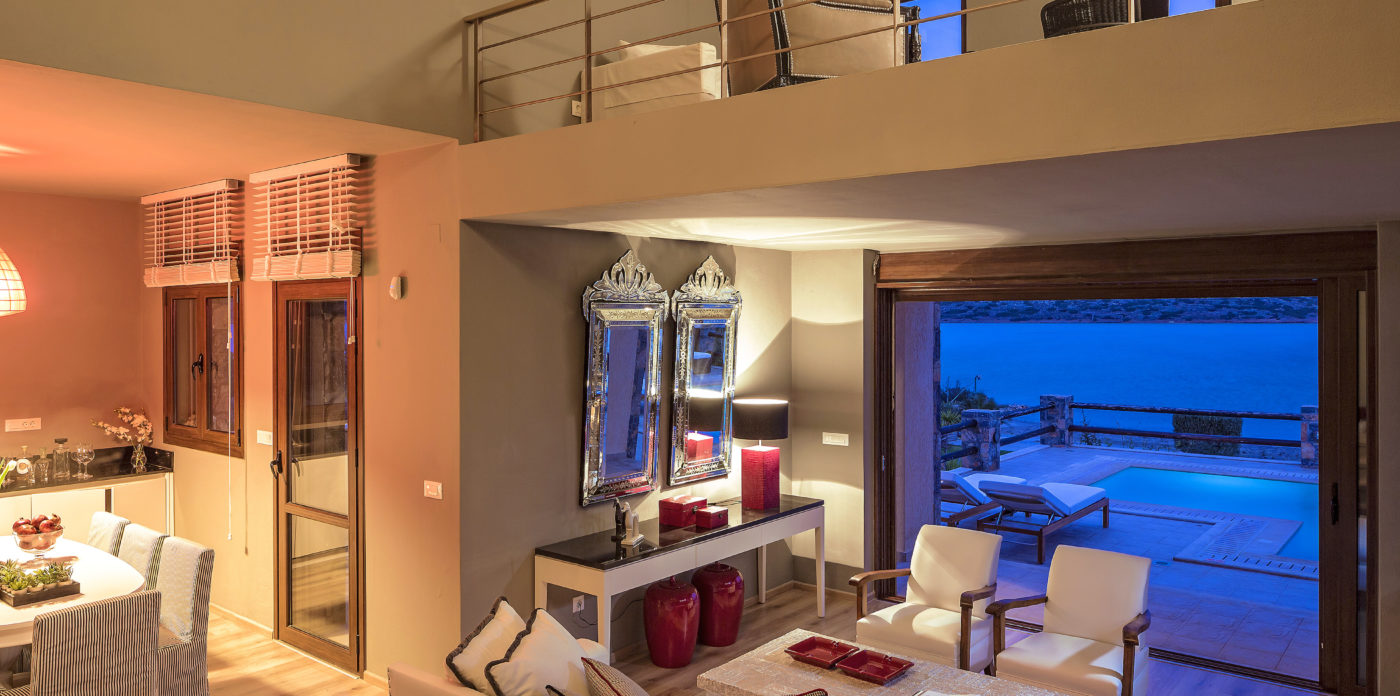 Το κομψά διακοσμημένο κύριο καθιστικό με τον άνετο καναπέ και τις άνετες πολυθρόνες προσφέρει εξαιρετική θέα στον κόλπο του Mirabello και ανοίγει στην πισίνα της βίλας.
