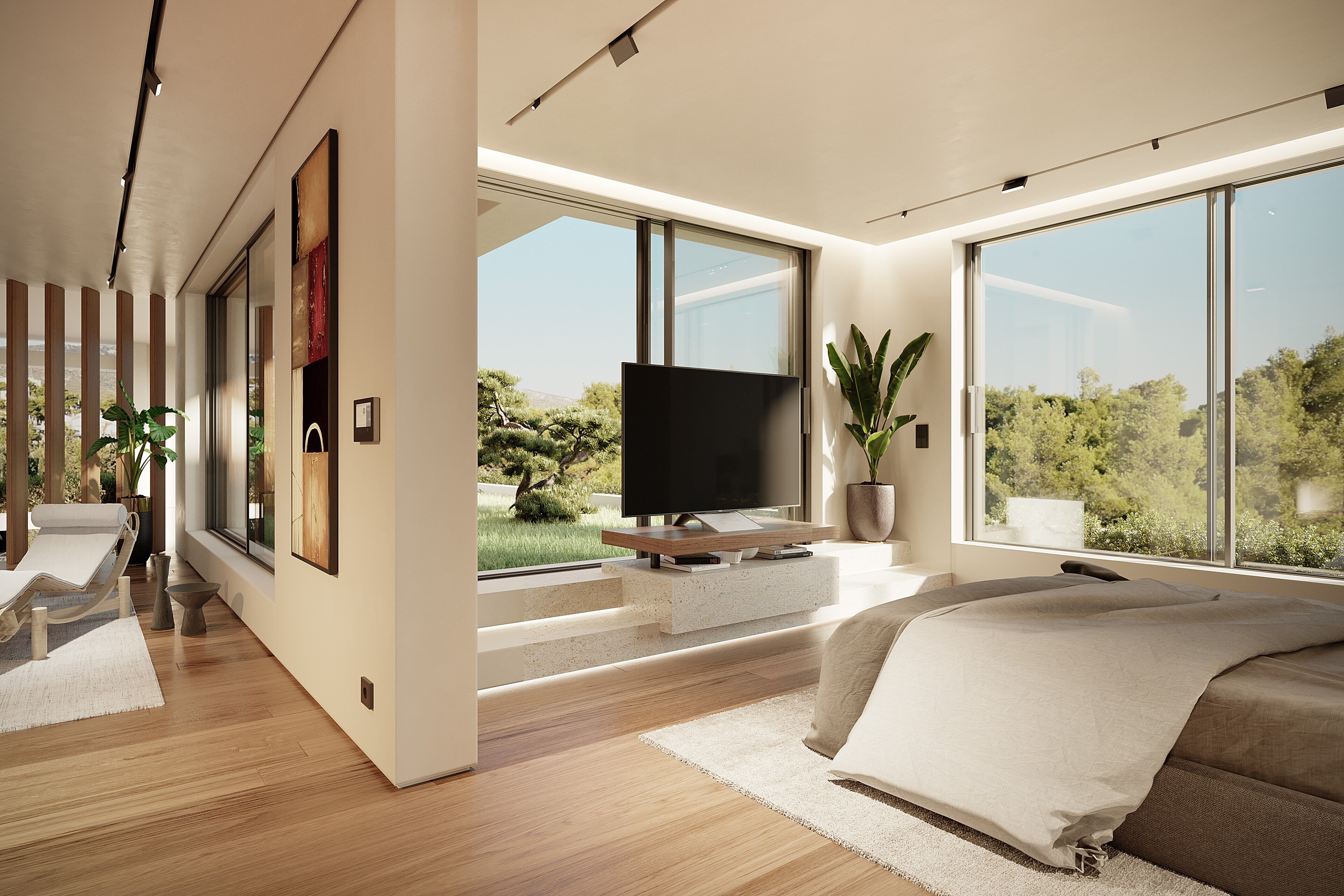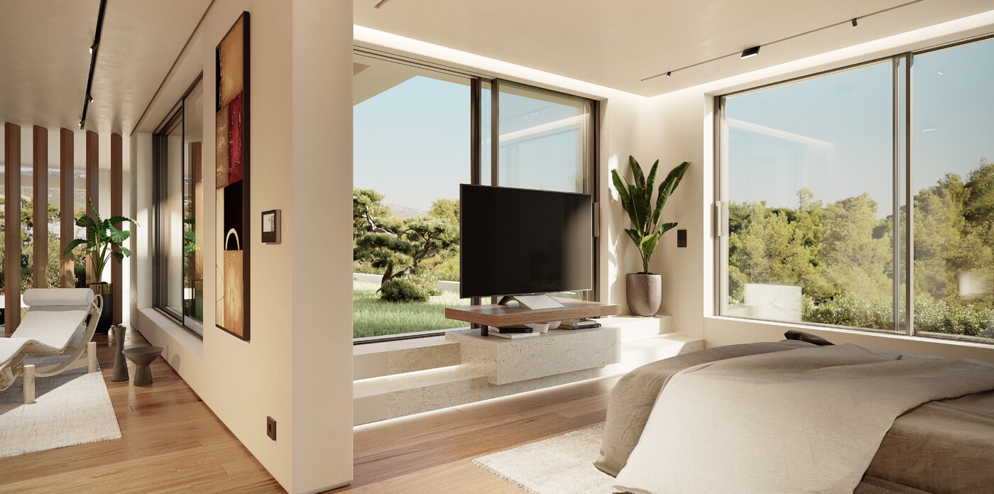 On the same floor, a sliding door separates the main living spaces from the bedrooms, ensuring privacy and tranquility. This area has two comfortable bedrooms with a shared bathroom and a luxurious master suite complete with an en-suite bathroom.