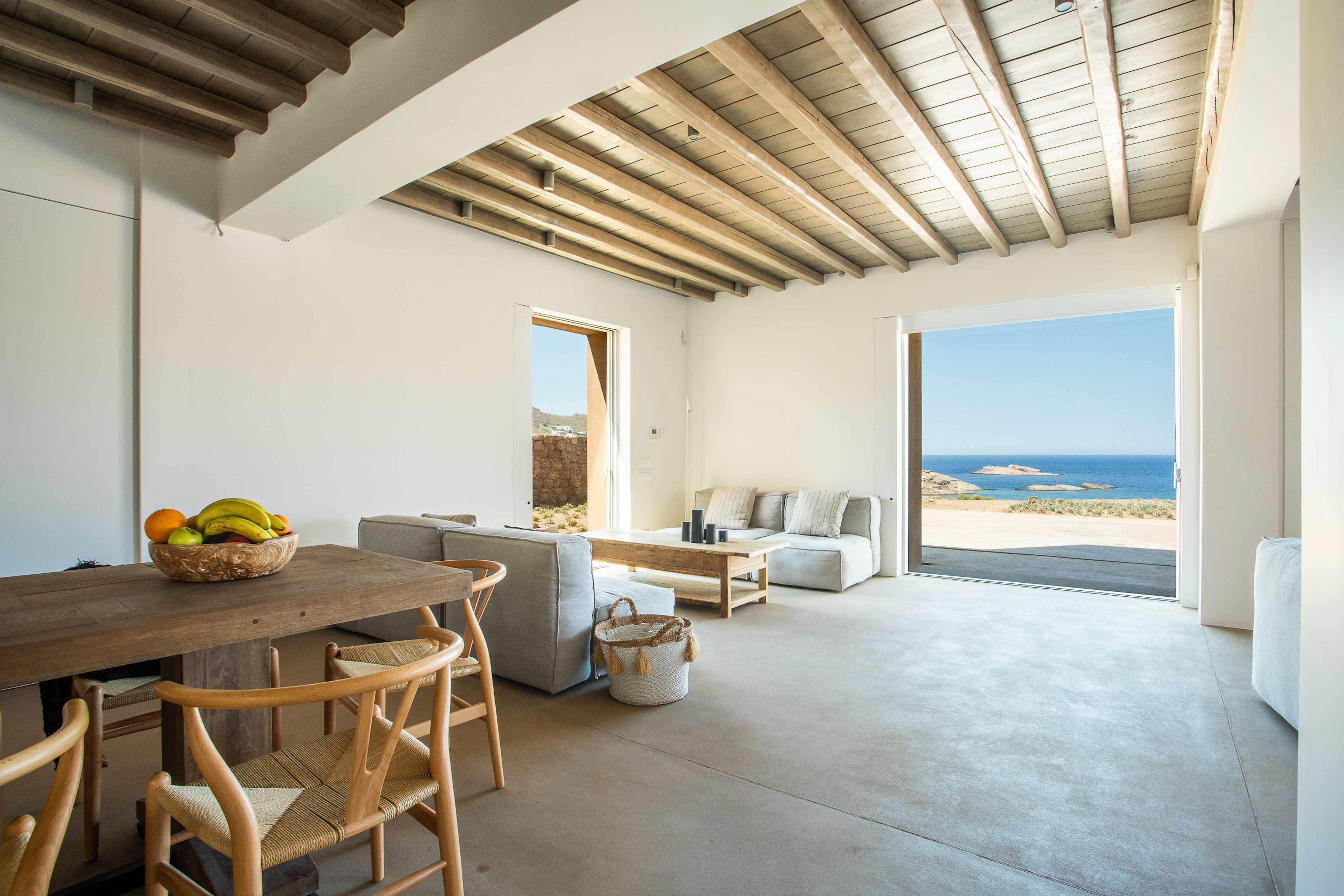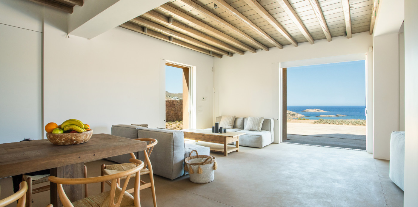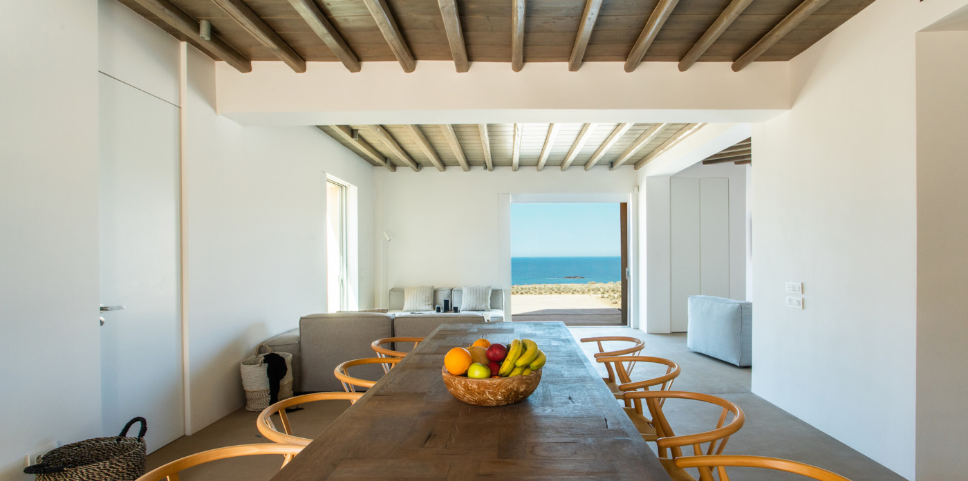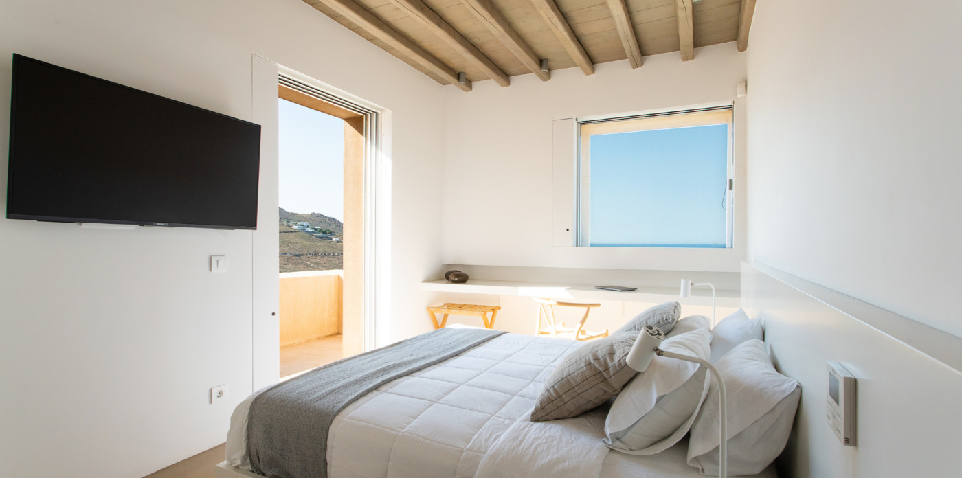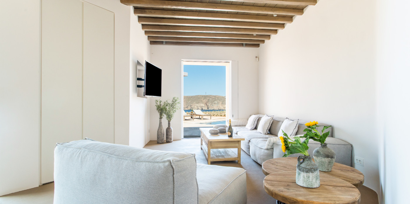 Of bold design, with strong linear features, inside and out, Almyra is an expression of cool, modern luxury. Running through the interiors is a theme of remarkable simplicity that works perfectly in each and every space. The neutral decor throughout blending wonderfully with the wooden beams and marble floors. The windows in the living room look out on to such stunning views of the sea that the openings look as if an artist has painted them, with a colour pallet inspired by nature.