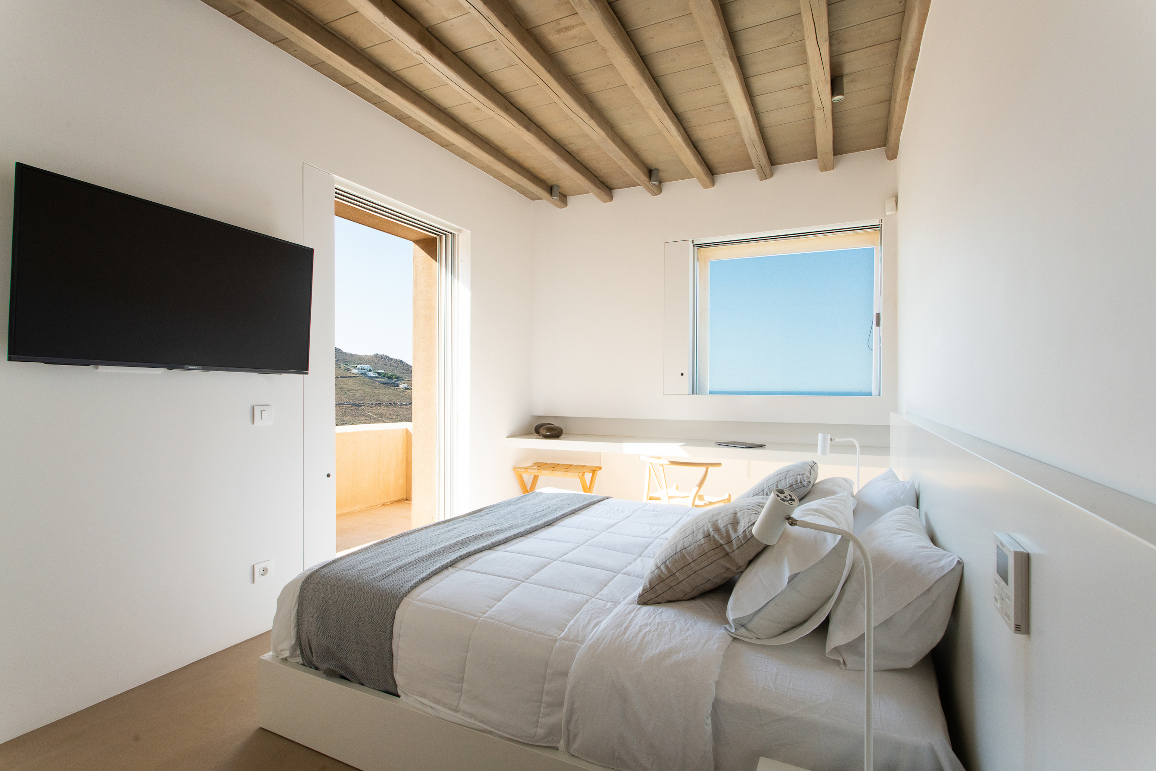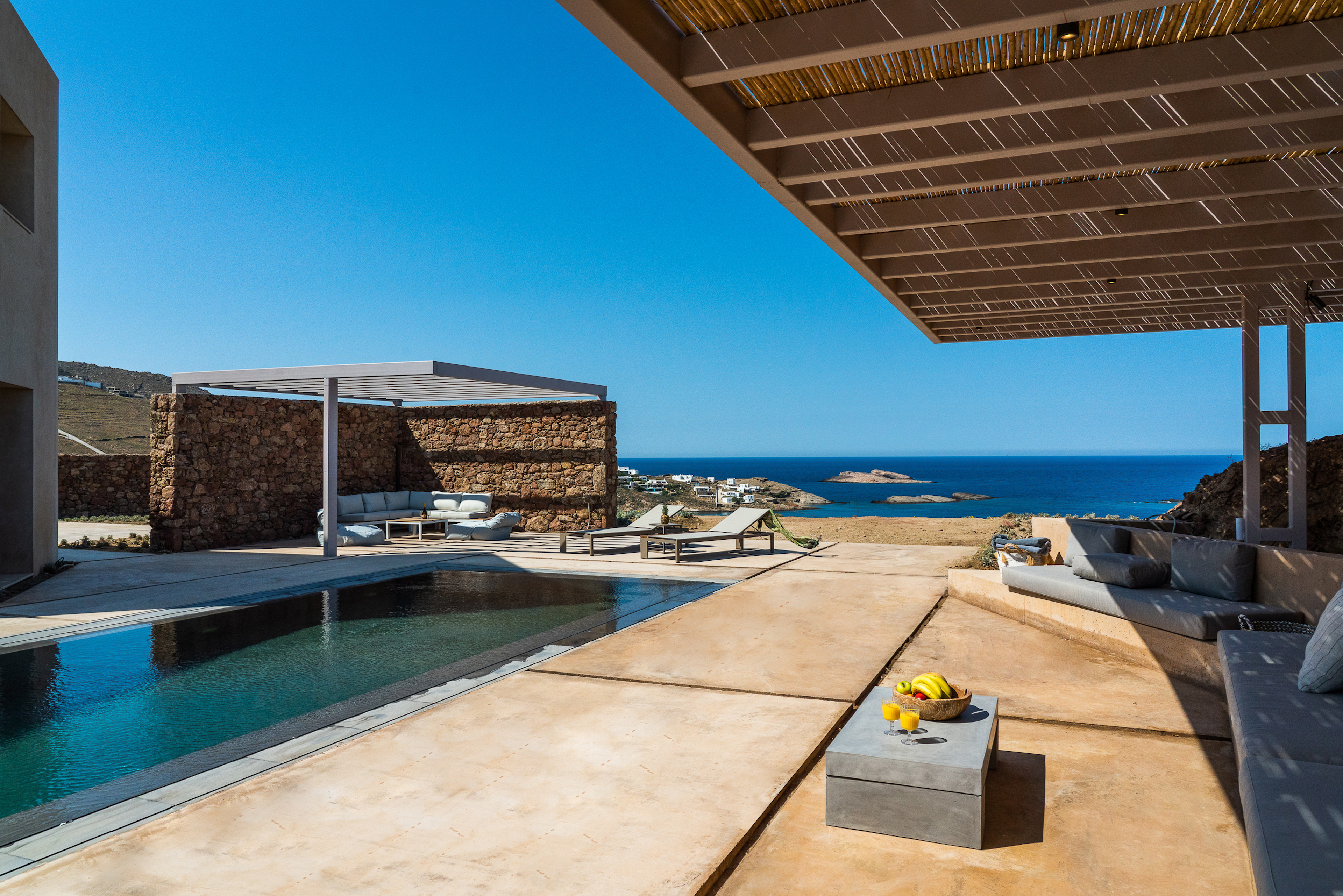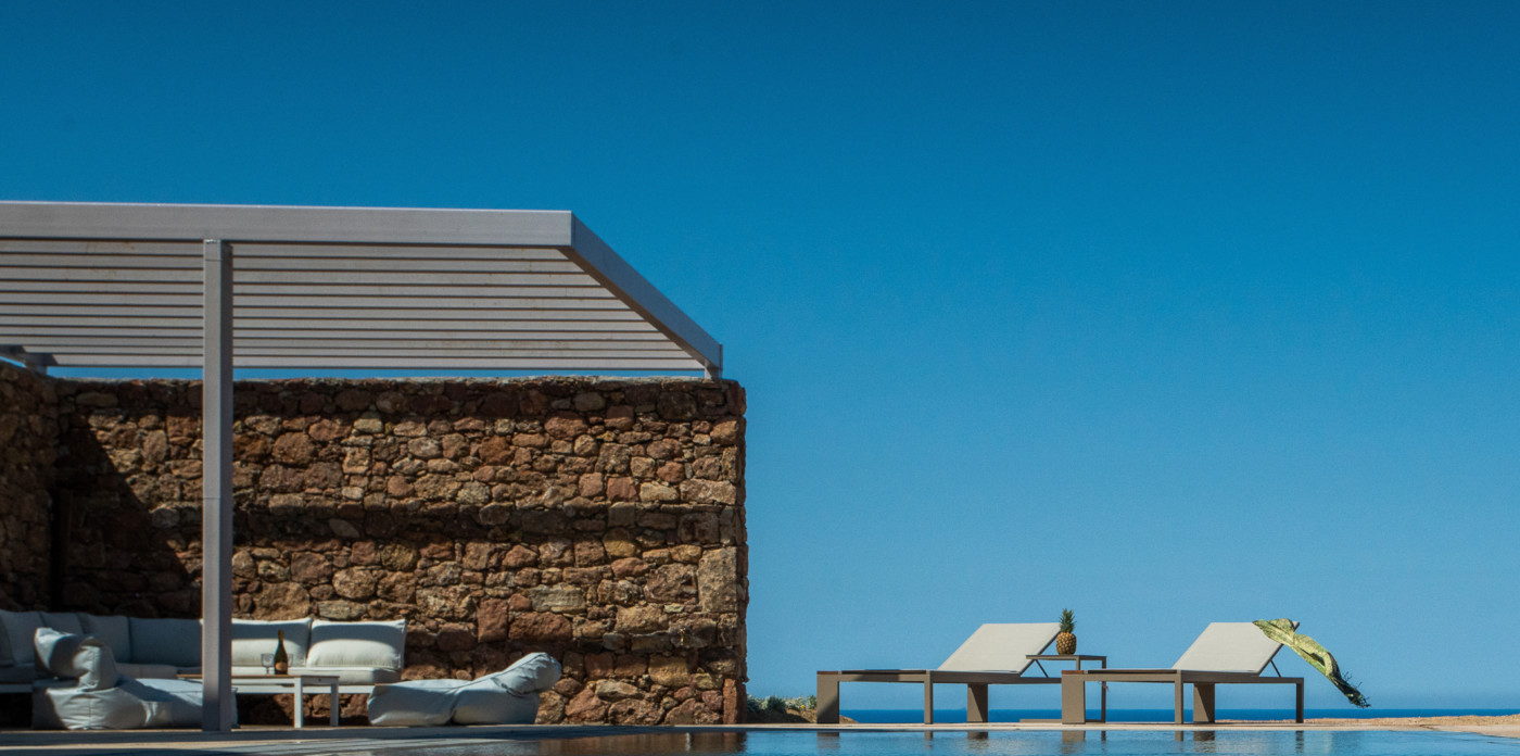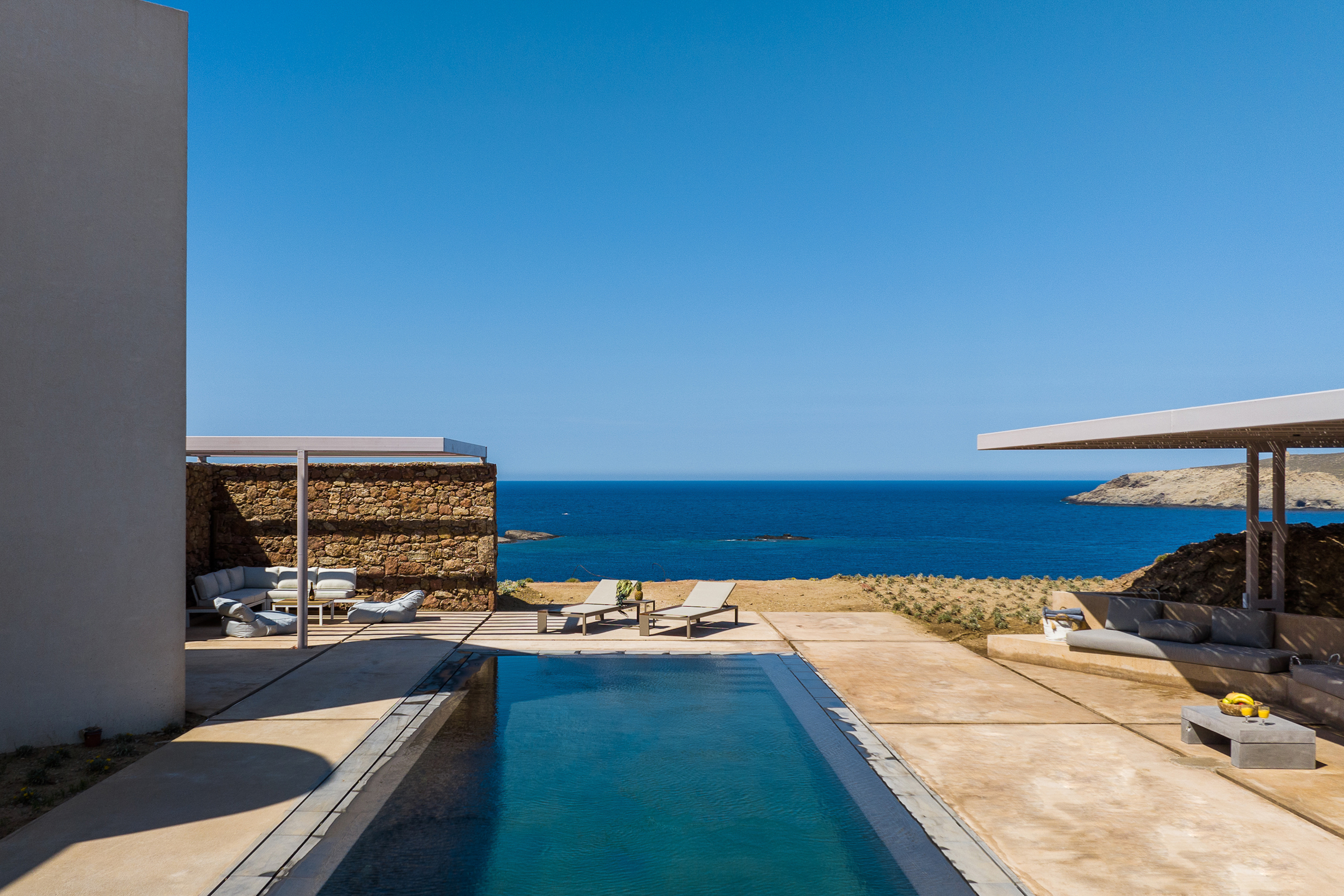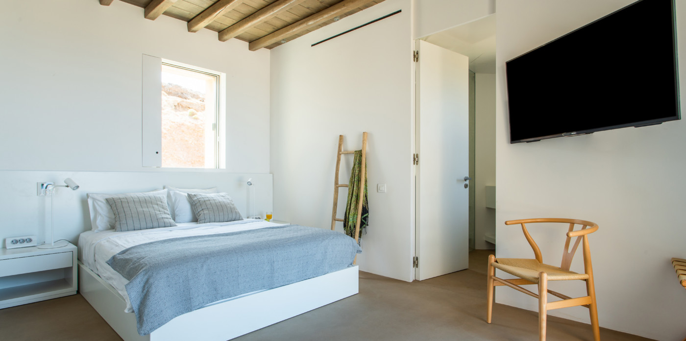 Of bold design, with strong linear features, inside and out, Almyra is an expression of cool, modern luxury. Running through the interiors is a theme of remarkable simplicity that works perfectly in each and every space. The neutral decor throughout blending wonderfully with the wooden beams and marble floors. The windows in the living room look out on to such stunning views of the sea that the openings look as if an artist has painted them, with a colour pallet inspired by nature.