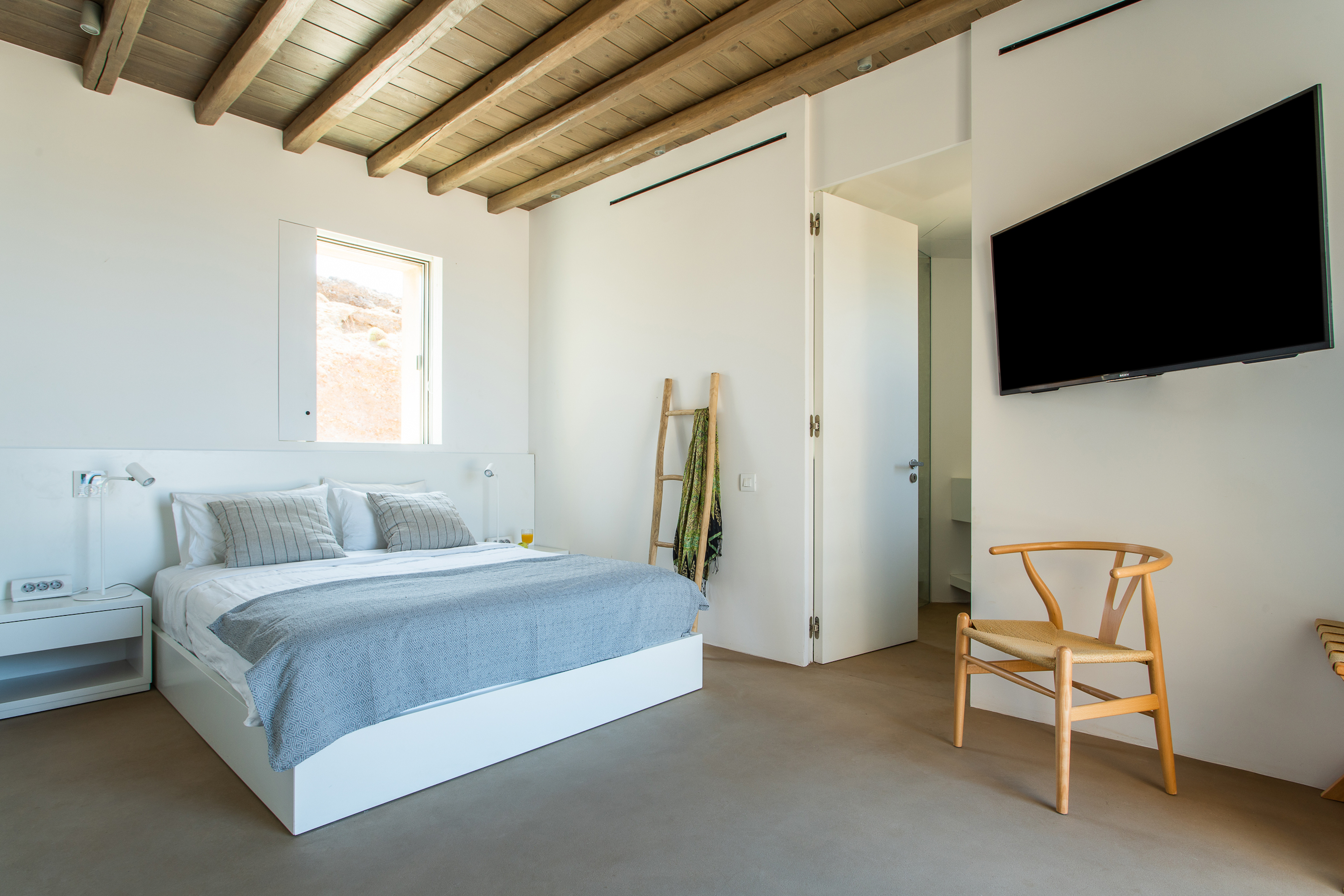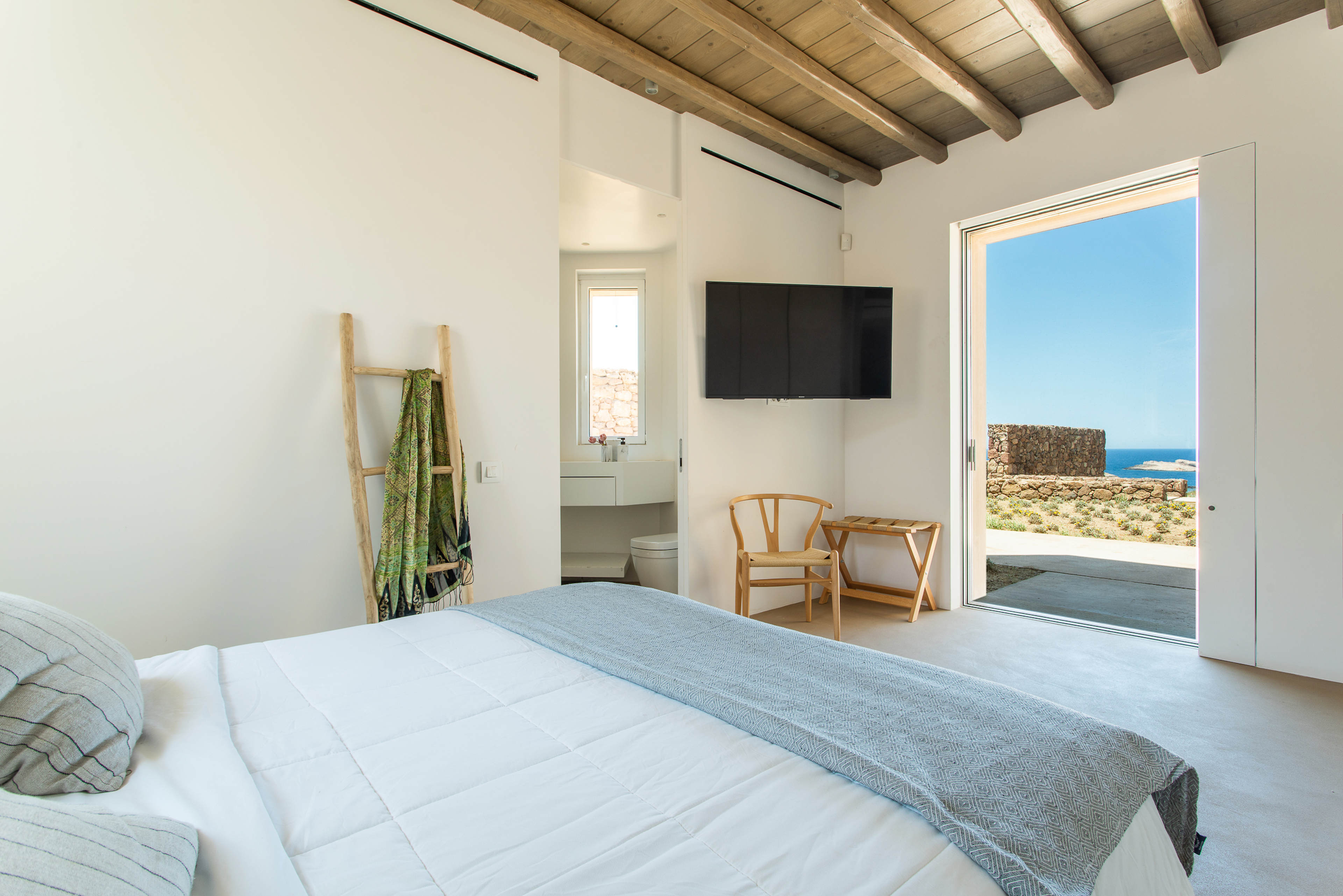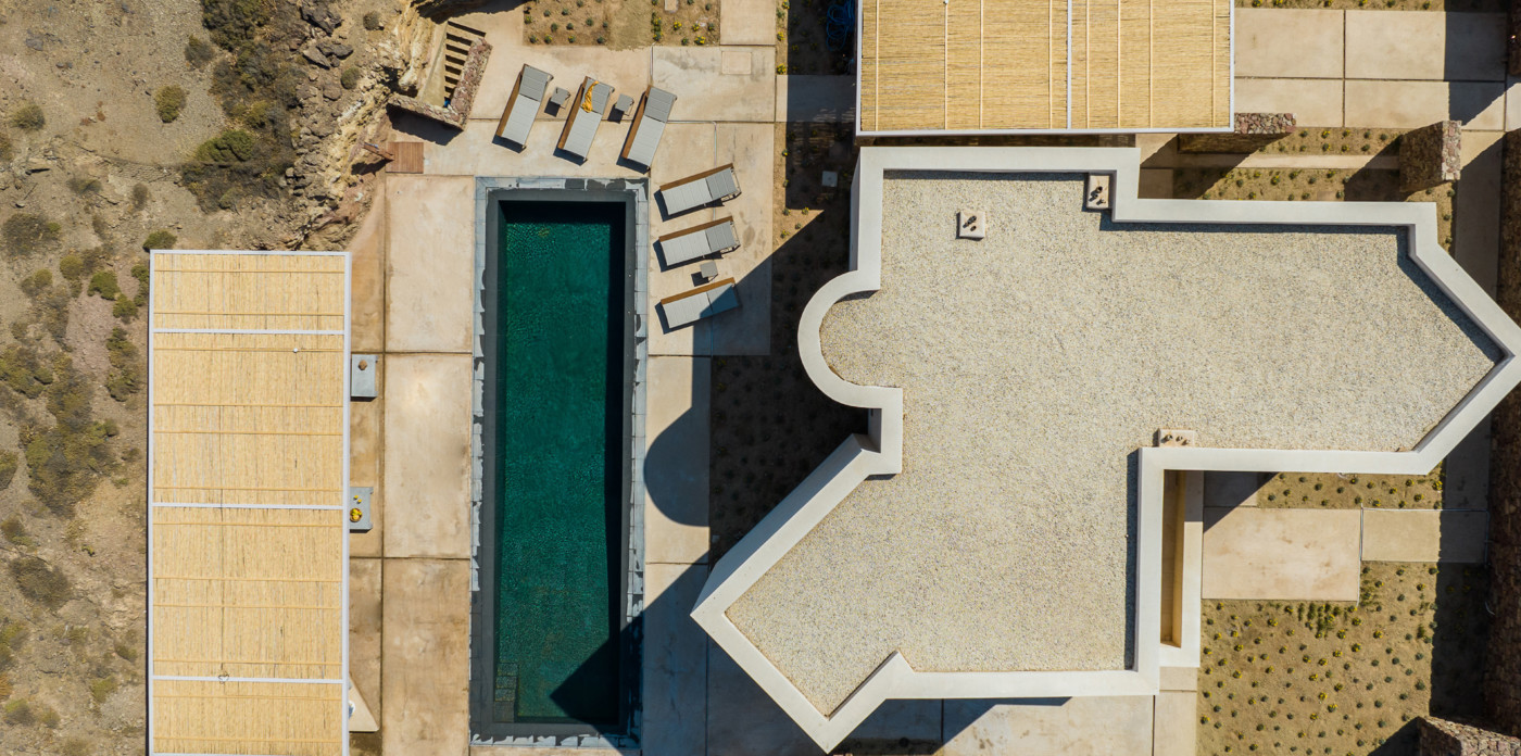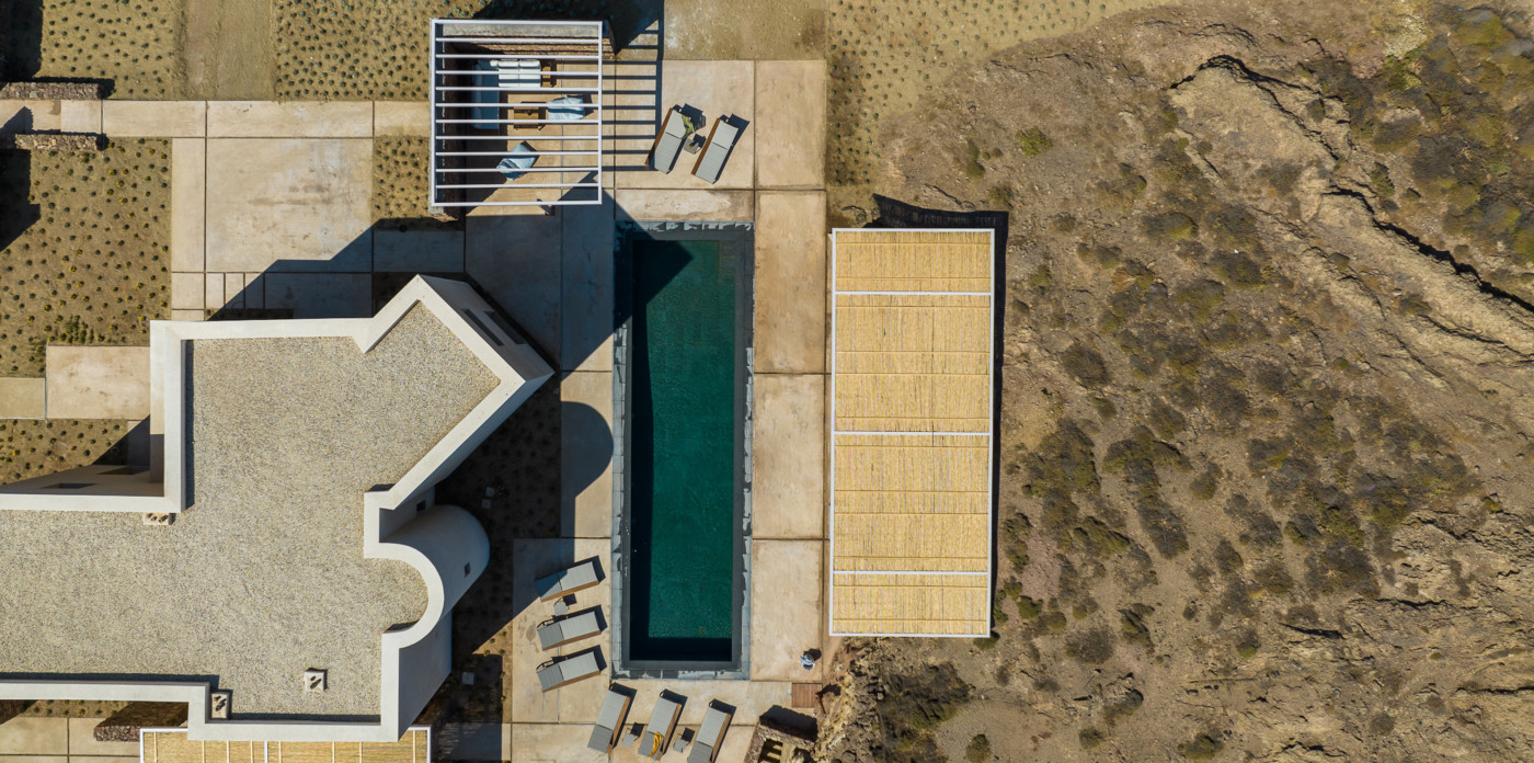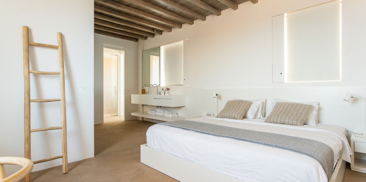 Of bold design, with strong linear features, inside and out, Almyra is an expression of cool, modern luxury. Running through the interiors is a theme of remarkable simplicity that works perfectly in each and every space. The neutral decor throughout blending wonderfully with the wooden beams and marble floors. The windows in the living room look out on to such stunning views of the sea that the openings look as if an artist has painted them, with a colour pallet inspired by nature.