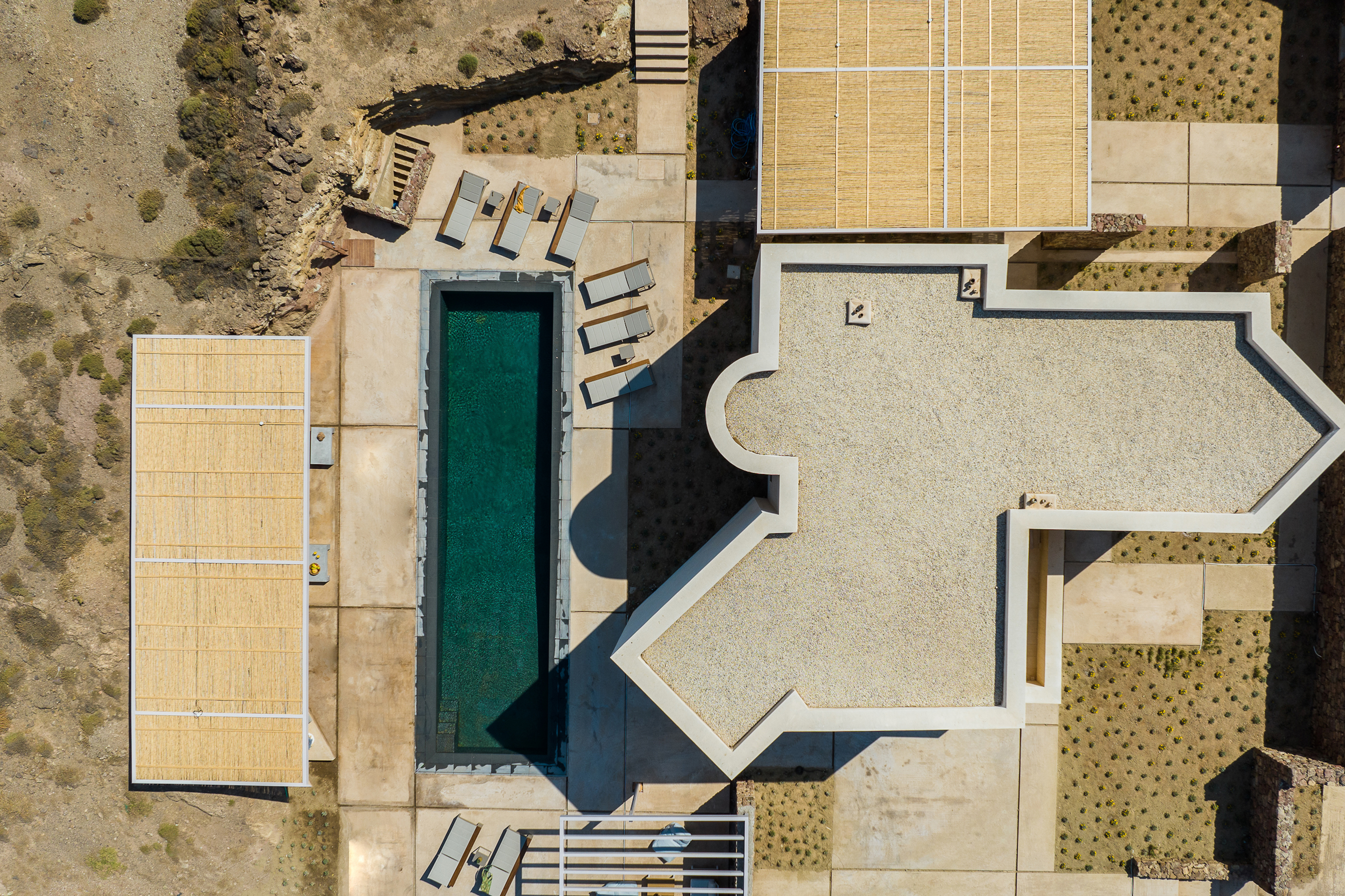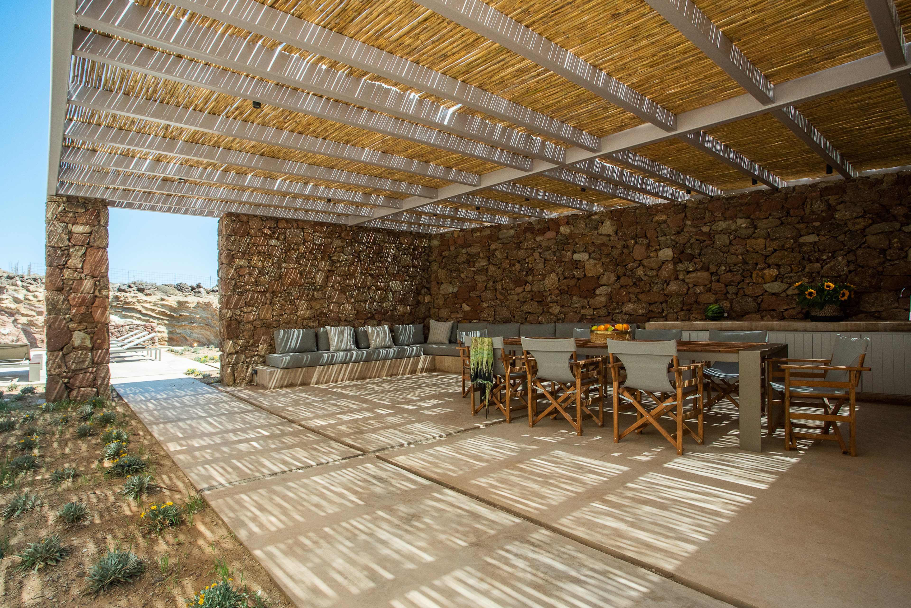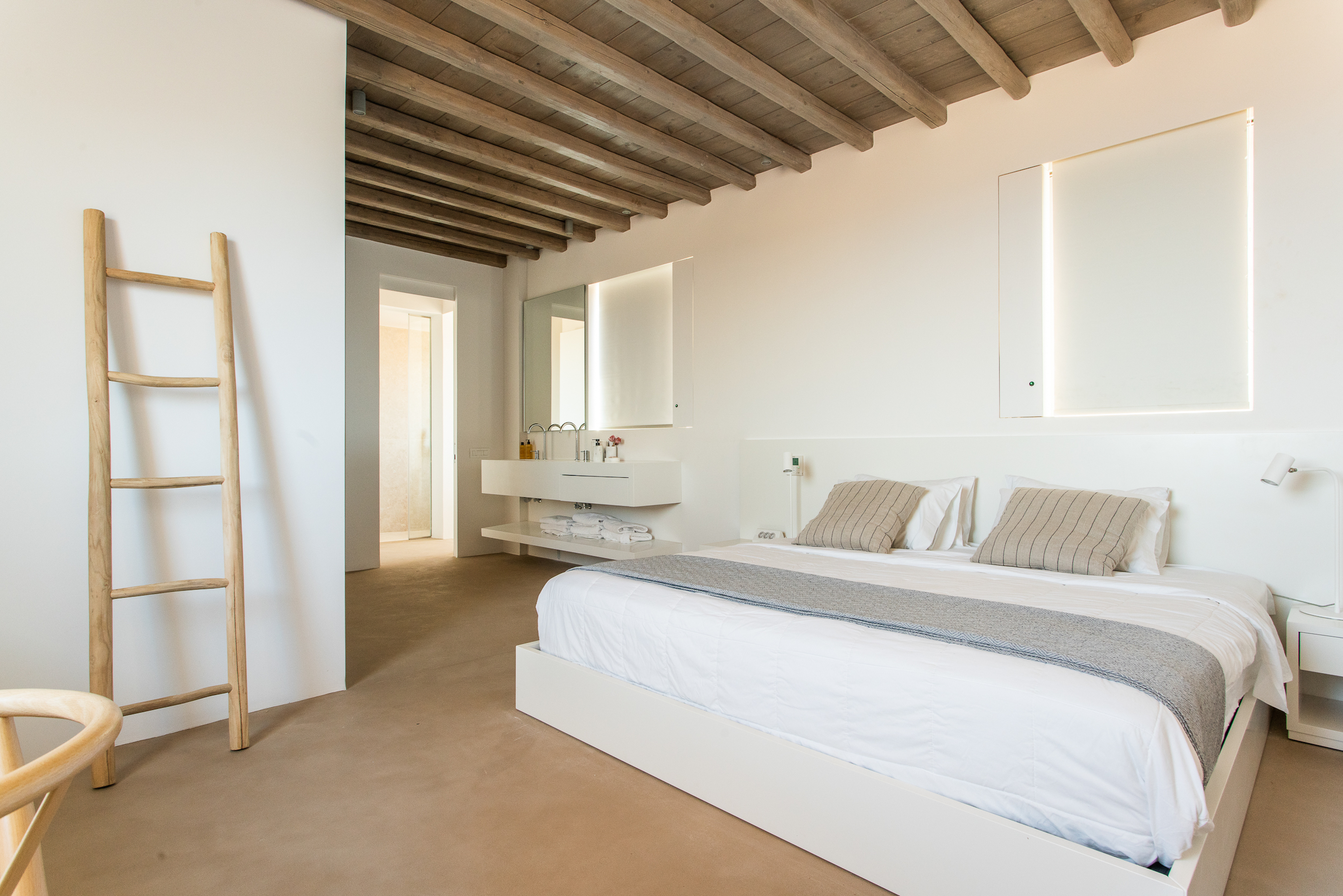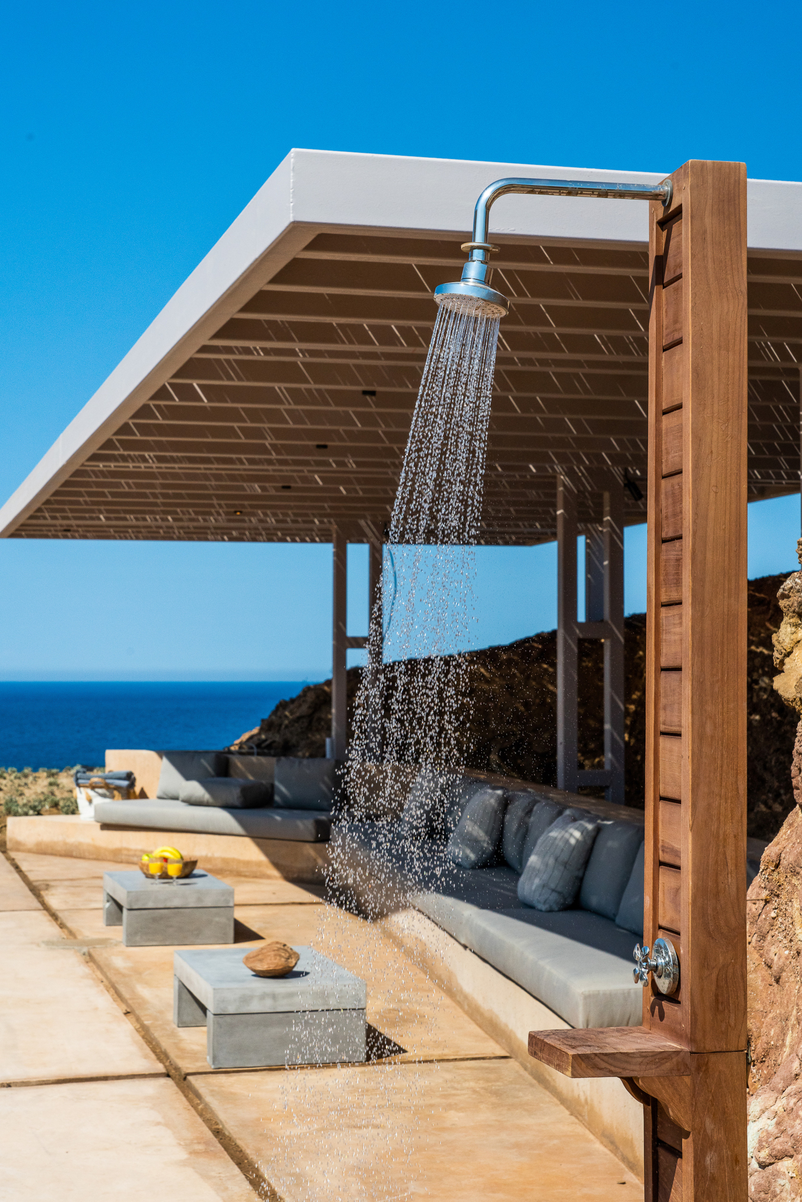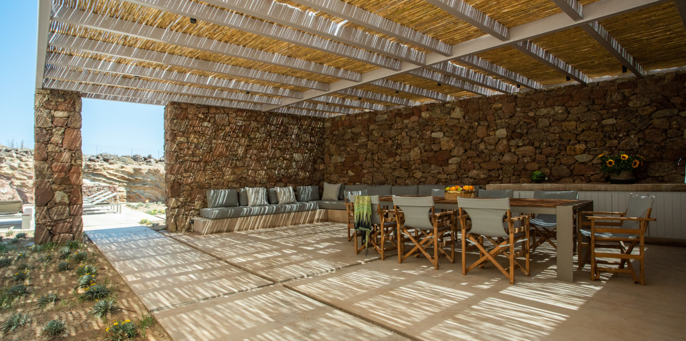 Of bold design, with strong linear features, inside and out, Almyra is an expression of cool, modern luxury. Running through the interiors is a theme of remarkable simplicity that works perfectly in each and every space. The neutral decor throughout blending wonderfully with the wooden beams and marble floors. The windows in the living room look out on to such stunning views of the sea that the openings look as if an artist has painted them, with a colour pallet inspired by nature.