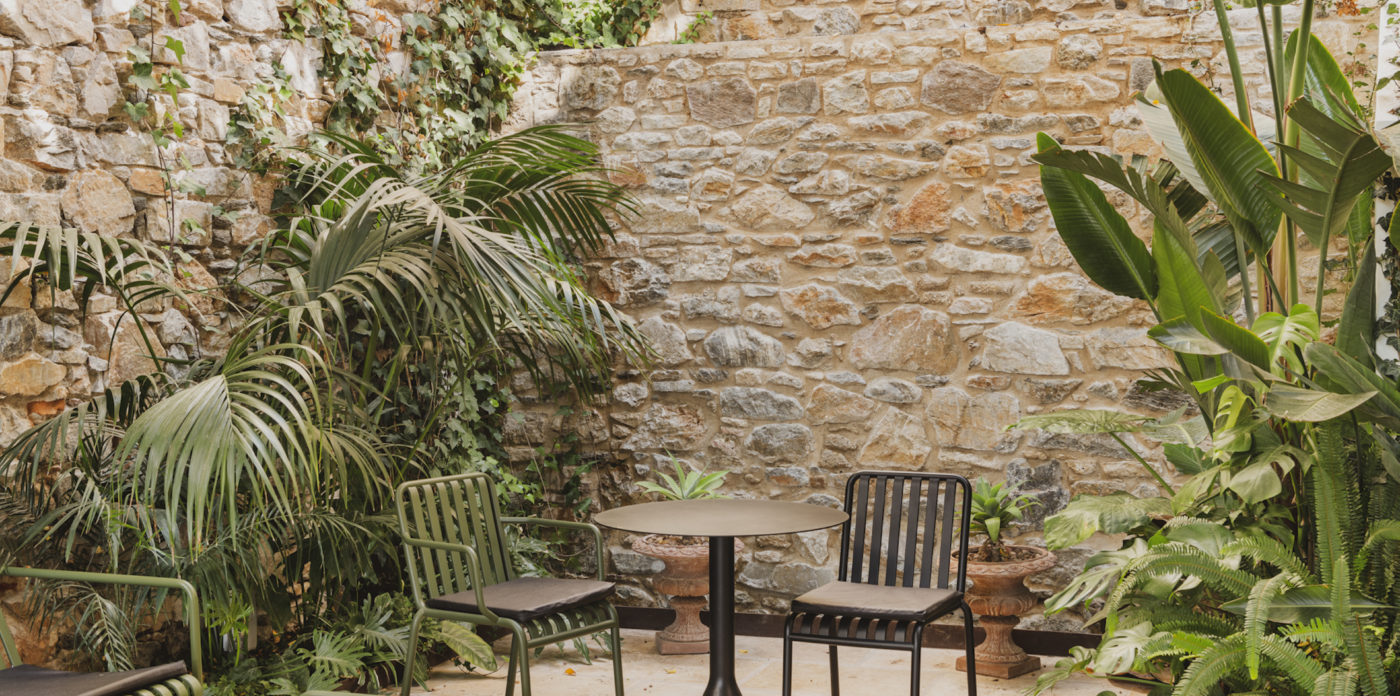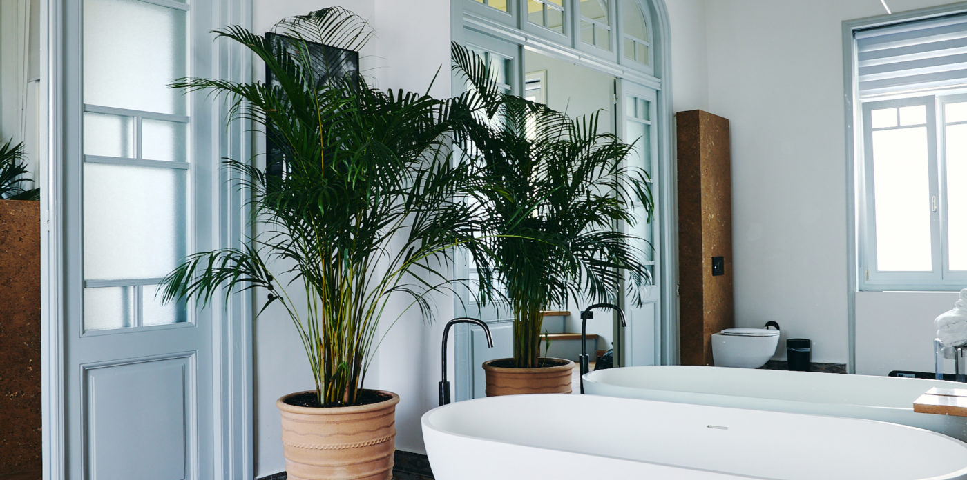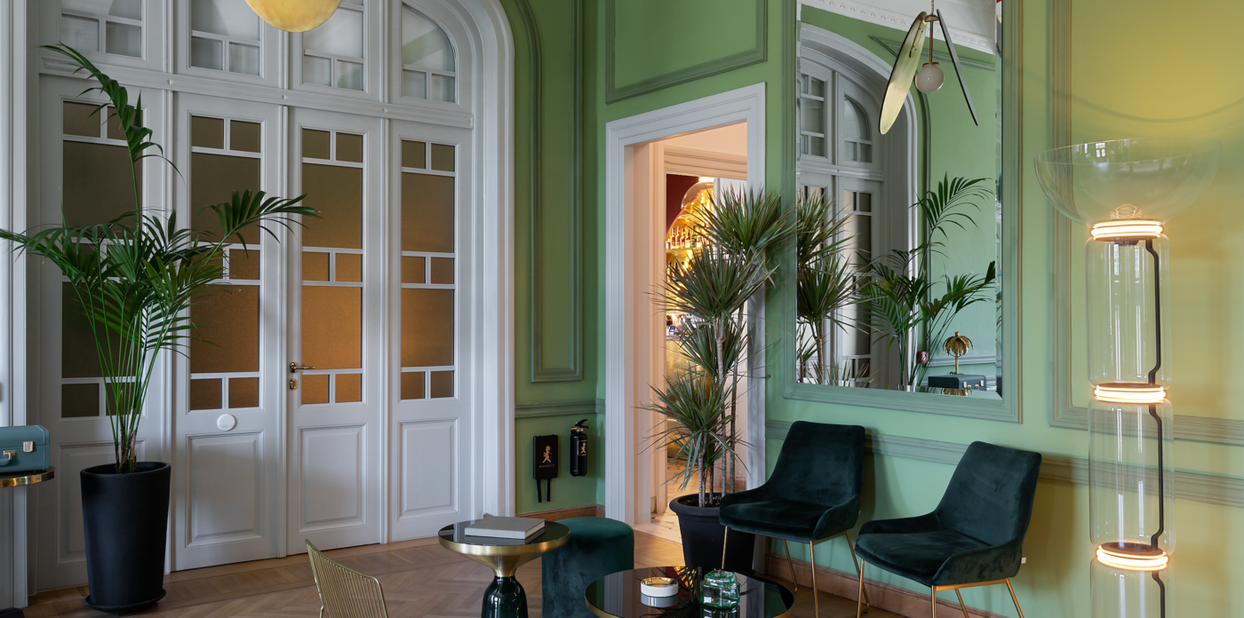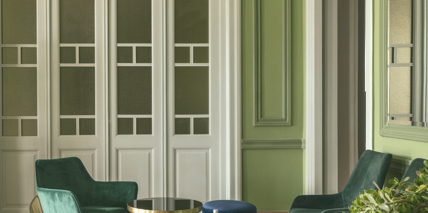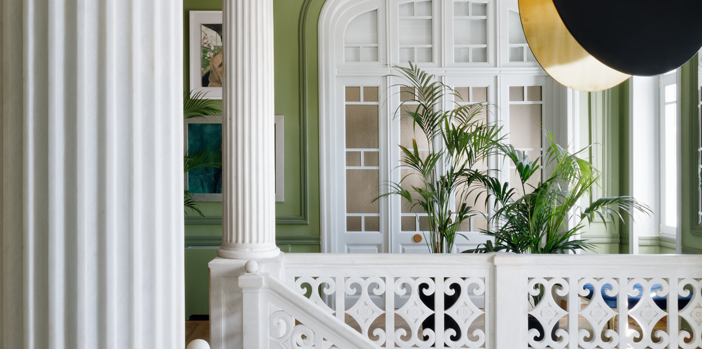 An airy, sunlit, verdant interior with high ceilings, herringbone wood flooring and arched glass doorways are some of the decorative elements evoking a feeling of grandeur and spaciousness in approximately 770 sqm of living space.