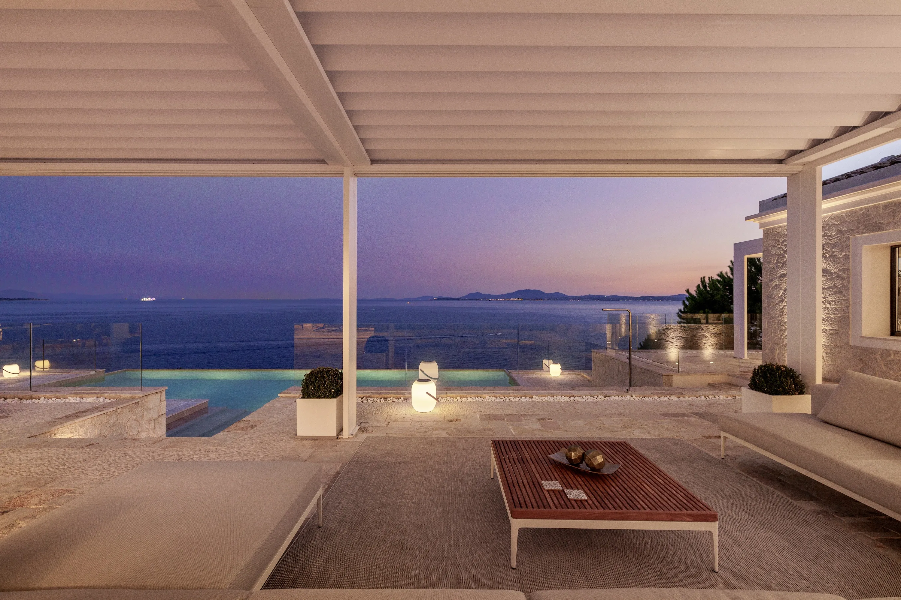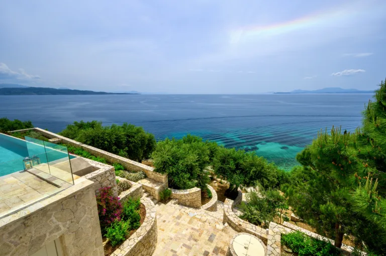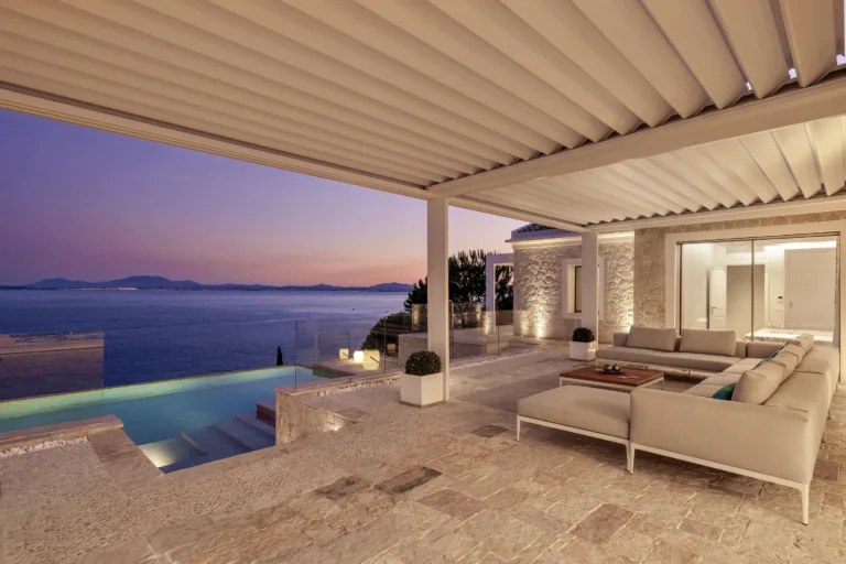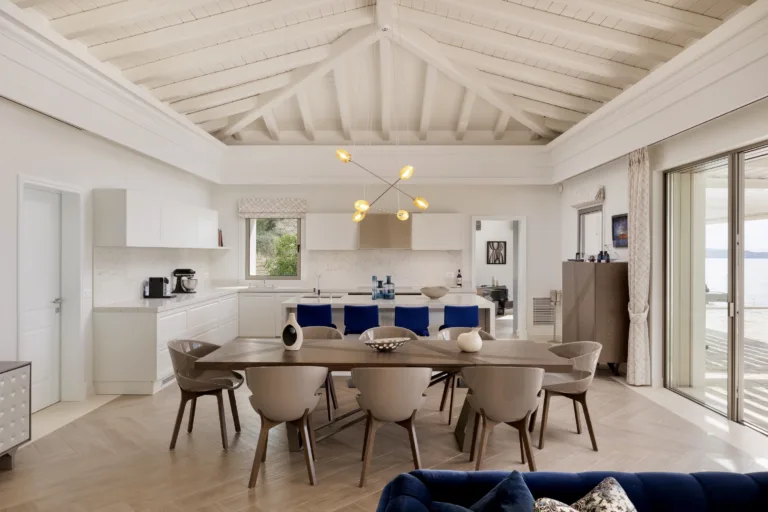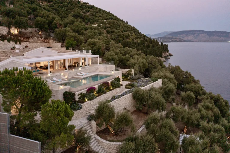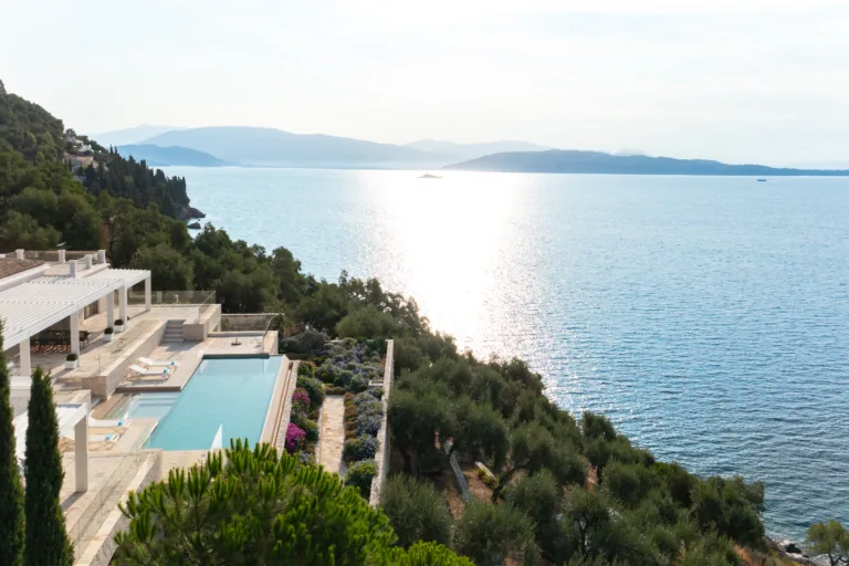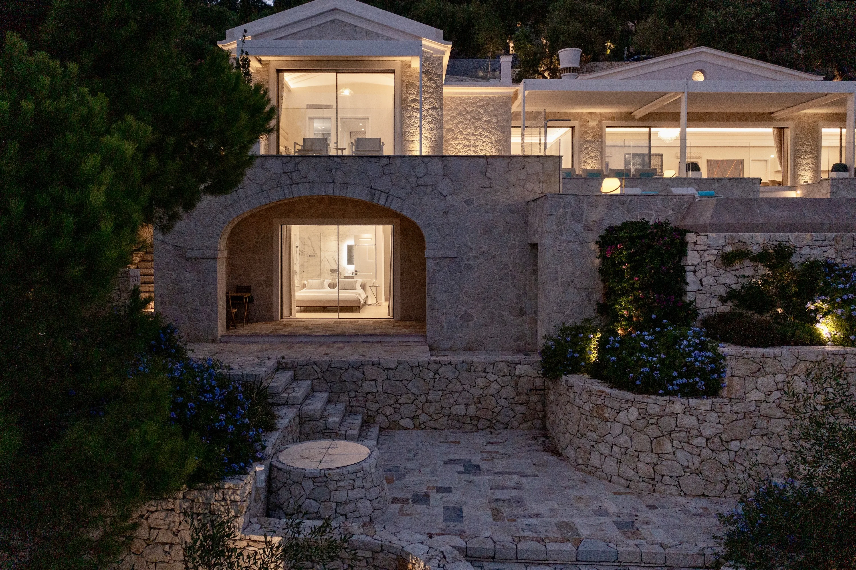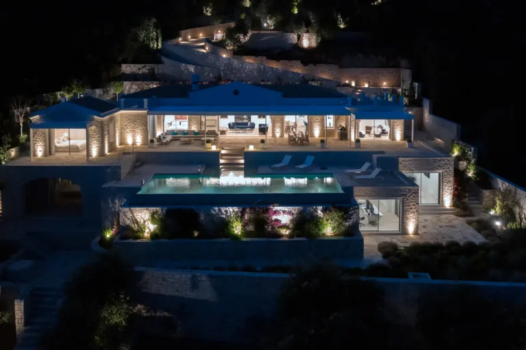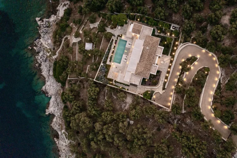 Located in Agni, Ayline is situated just a brief stroll from the picturesque bay and its famous beachfront restaurants. The villa showcases a unique blend of Corfiot and Venetian architectural influences fused with modern aesthetics. Two distinctive features are the windows that amplify the panoramic views and the stone used on the façade and exterior walls, which was sourced directly from the property’s grounds. Each stone was meticulously hand-shaped by a skilled craftsman and fitted together like pieces of an intricate puzzle.